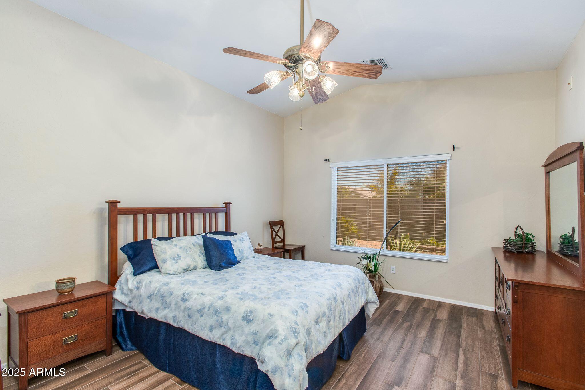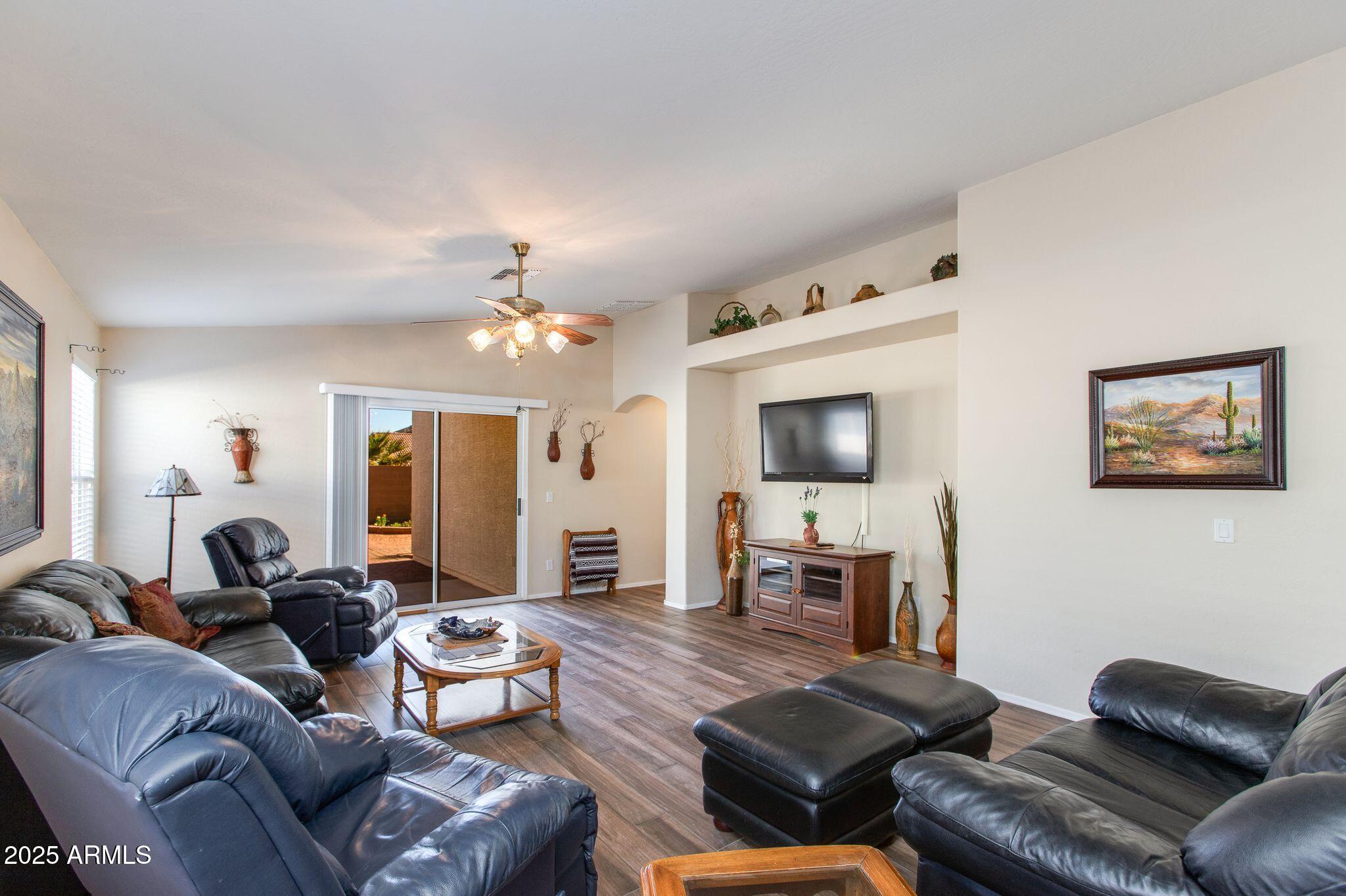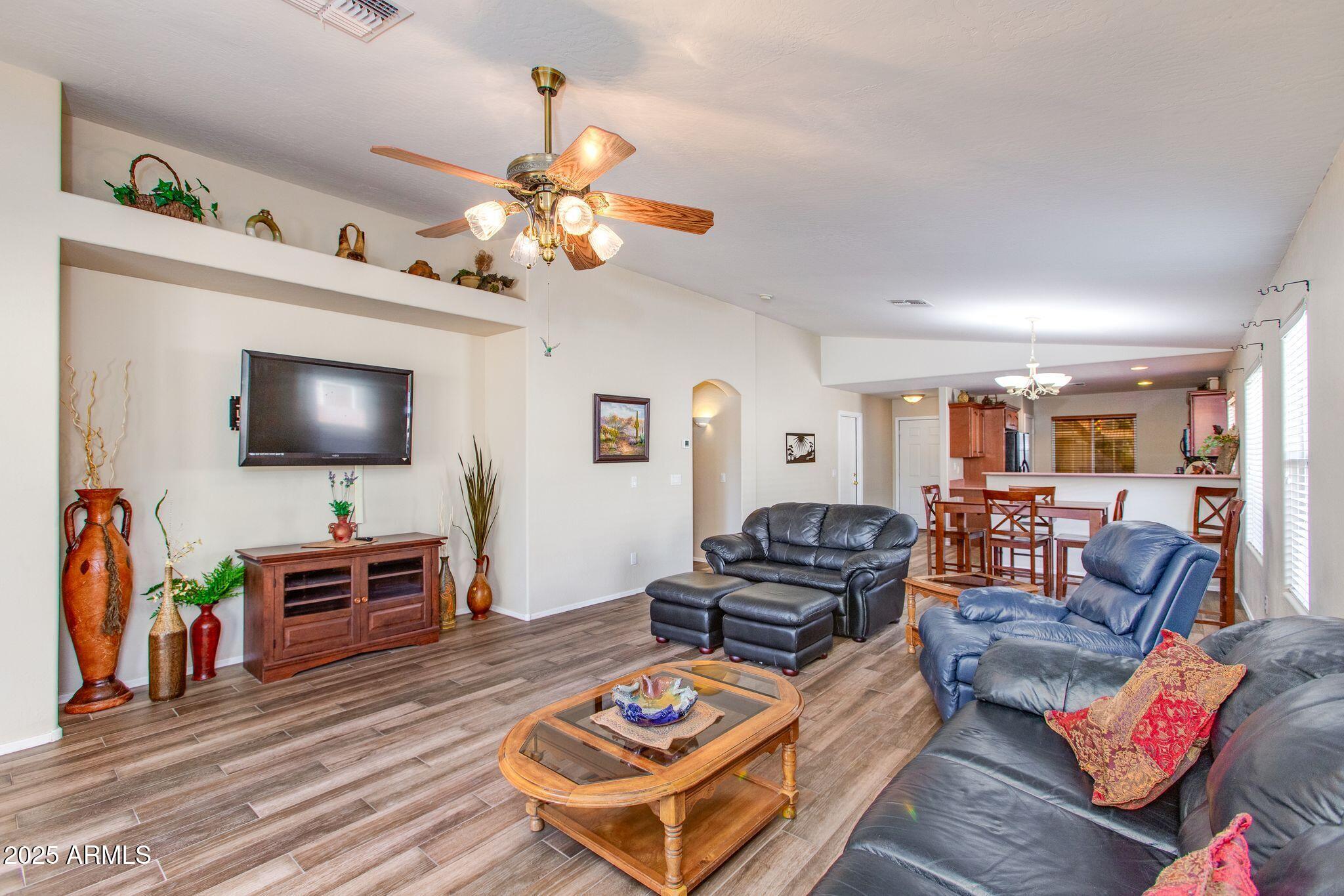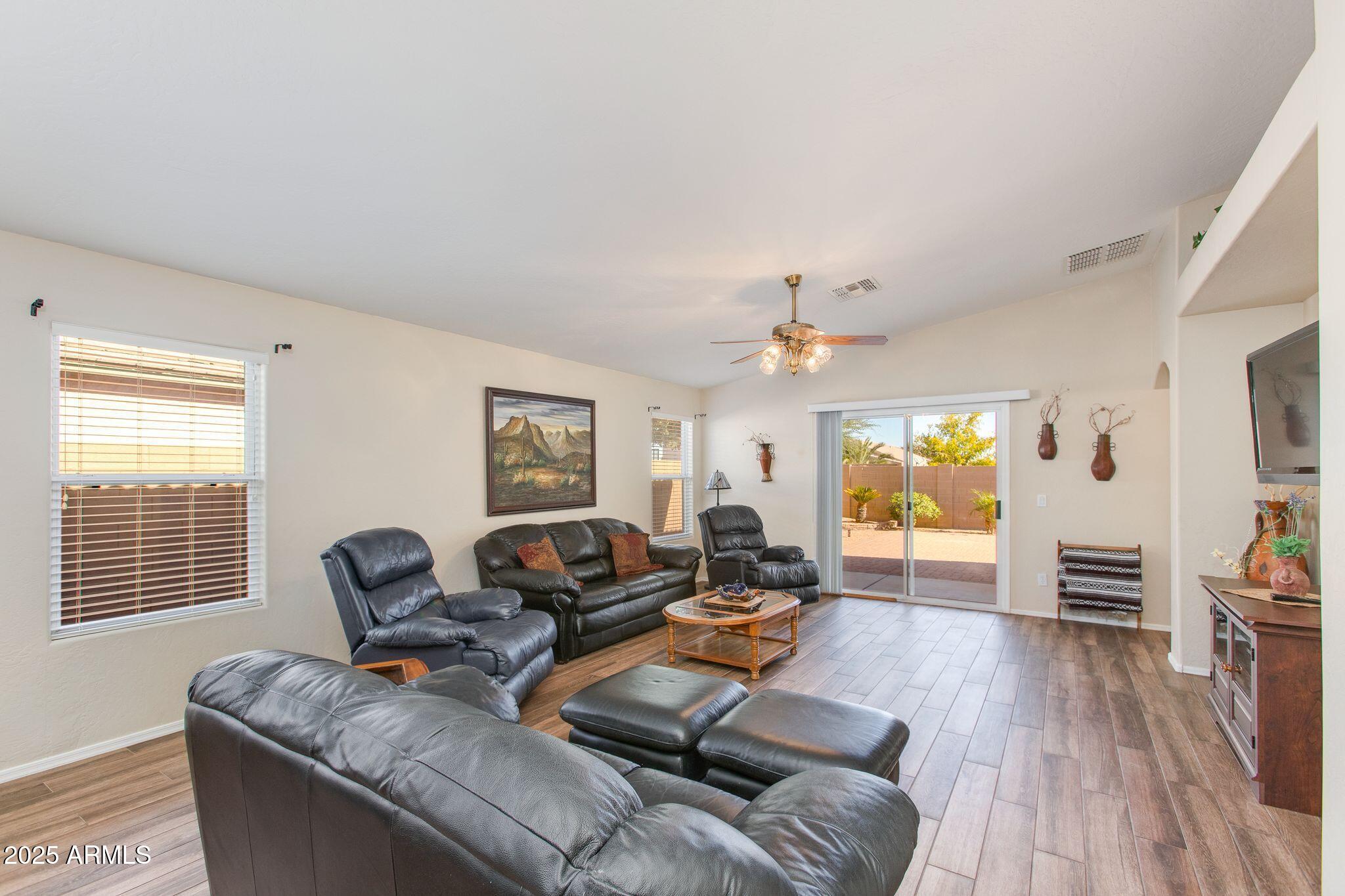Beautiful single-level home in a highly desired neighborhood! This spacious 4 bedroom / 2 bath property offers an open, inviting split floor plan with vaulted ceilings and fresh modern updates throughout. The stylish kitchen features updated cabinets and counters, matching appliances, pantry, and a large breakfast bar. Enjoy the updated flooring, new lighting, and tasteful finishes throughout. Primary suite offers generous space and privacy, with a walk in closet and separate bathroom. Three additional bedrooms and secondary bathroom provide ample space, along with a conveniently located laundry room. Desert landscaped backyard offers a spacious, fully paved patio area with attractive brick pavers, perfect for low-maintenance living and outdoor entertaining. This home is truly move-in ready, exceptionally maintained, and located close to schools, parks, shopping, and dining. Opportunities like this don't last, come see this beautifully updated home today!