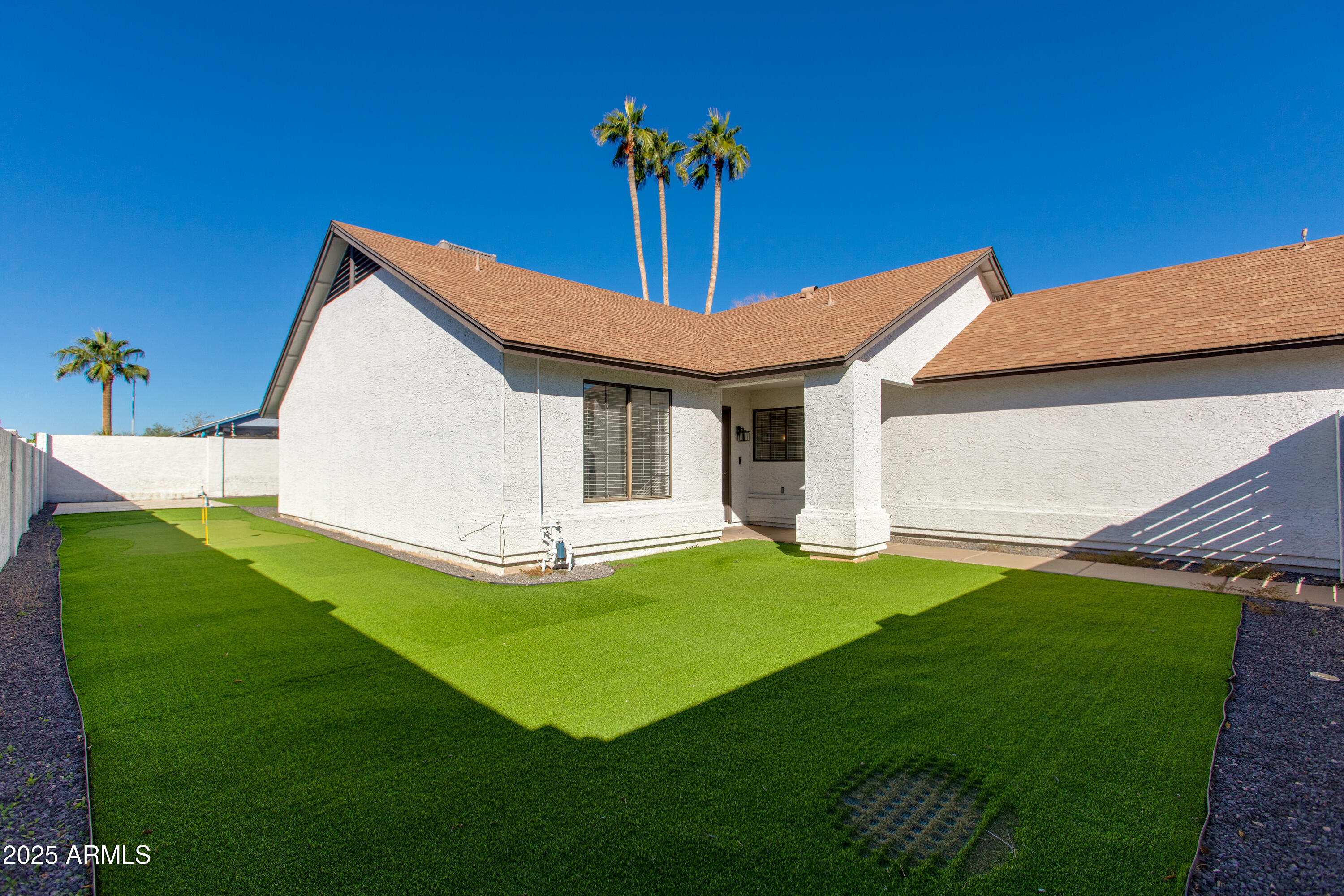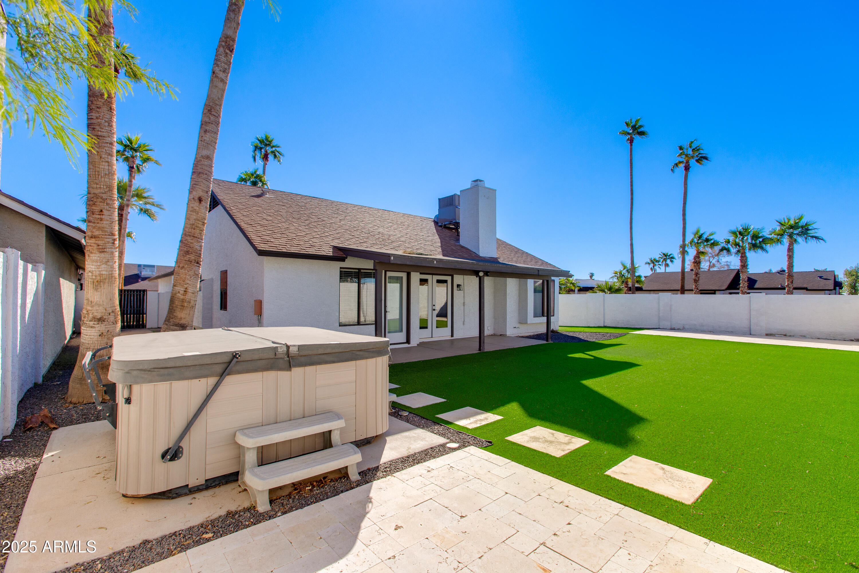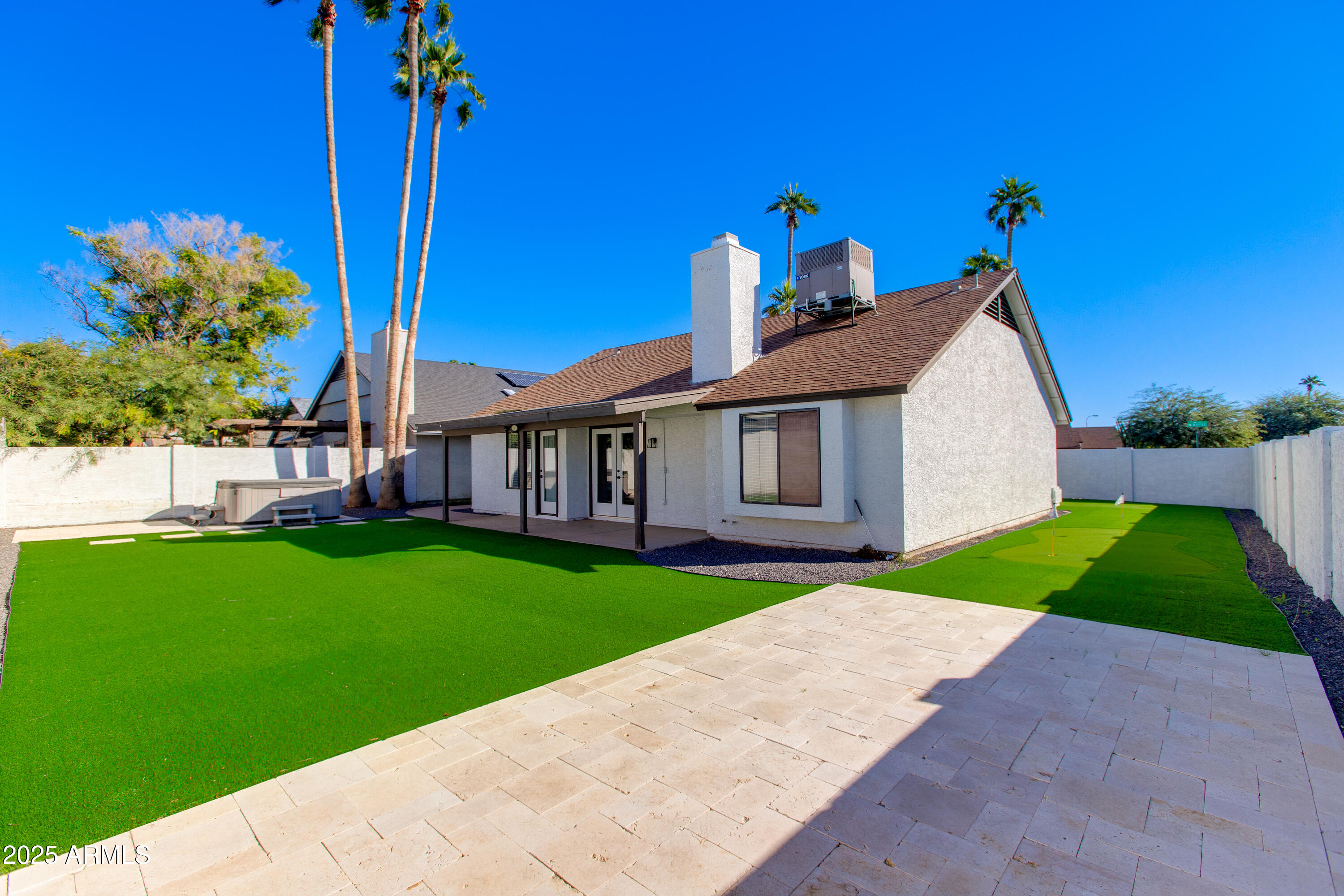 Multiple patio doors open to a secured, wrap-around yard--ideal for kids and pets--with low-maintenance xeriscape landscaping, a private putting green, and hot tub for relaxed Arizona evenings.
