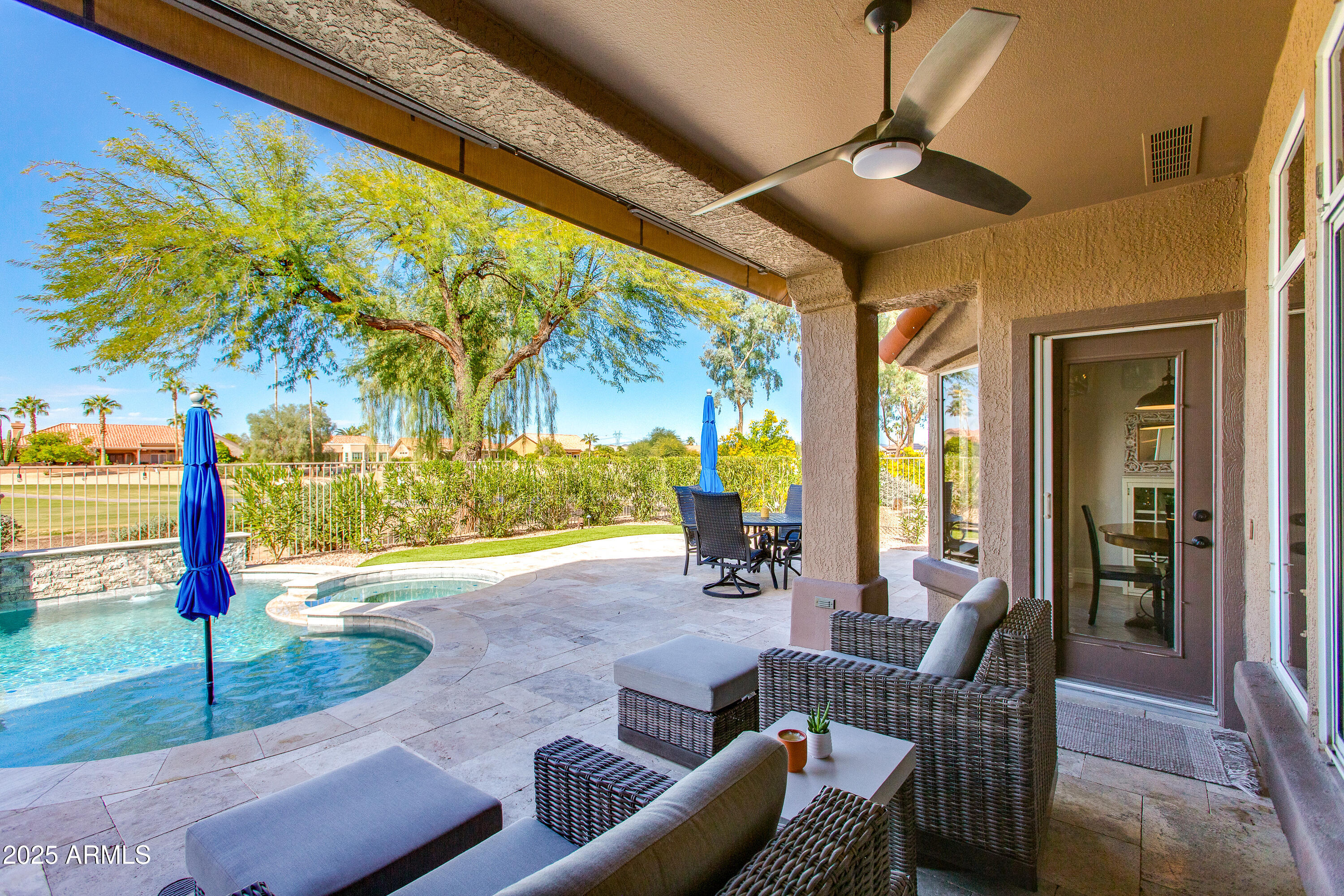 Live the resort life on the fairway! This exceptional Sun City West retreat blends luxury, comfort, and effortless indoor-outdoor living. Enjoy soaring 11-ft ceilings, elegant crown molding, and a gourmet kitchen with granite counters, stainless appliances and an entertainer's island. The spacious primary suite offers dual walk-in closets and a spa-inspired bath. Step outside to your private paradise -- a heated pool and spa with phone-controlled lighting and fountains, remote-controlled patio shade and misters, putting green, citrus trees, and travertine patio -- all overlooking the lush golf course fairway with added privacy from the adjacent wash. From sunrise coffee to sunset cocktails, every moment here feels like vacation. Refined, upgraded, and immaculate in every way!
