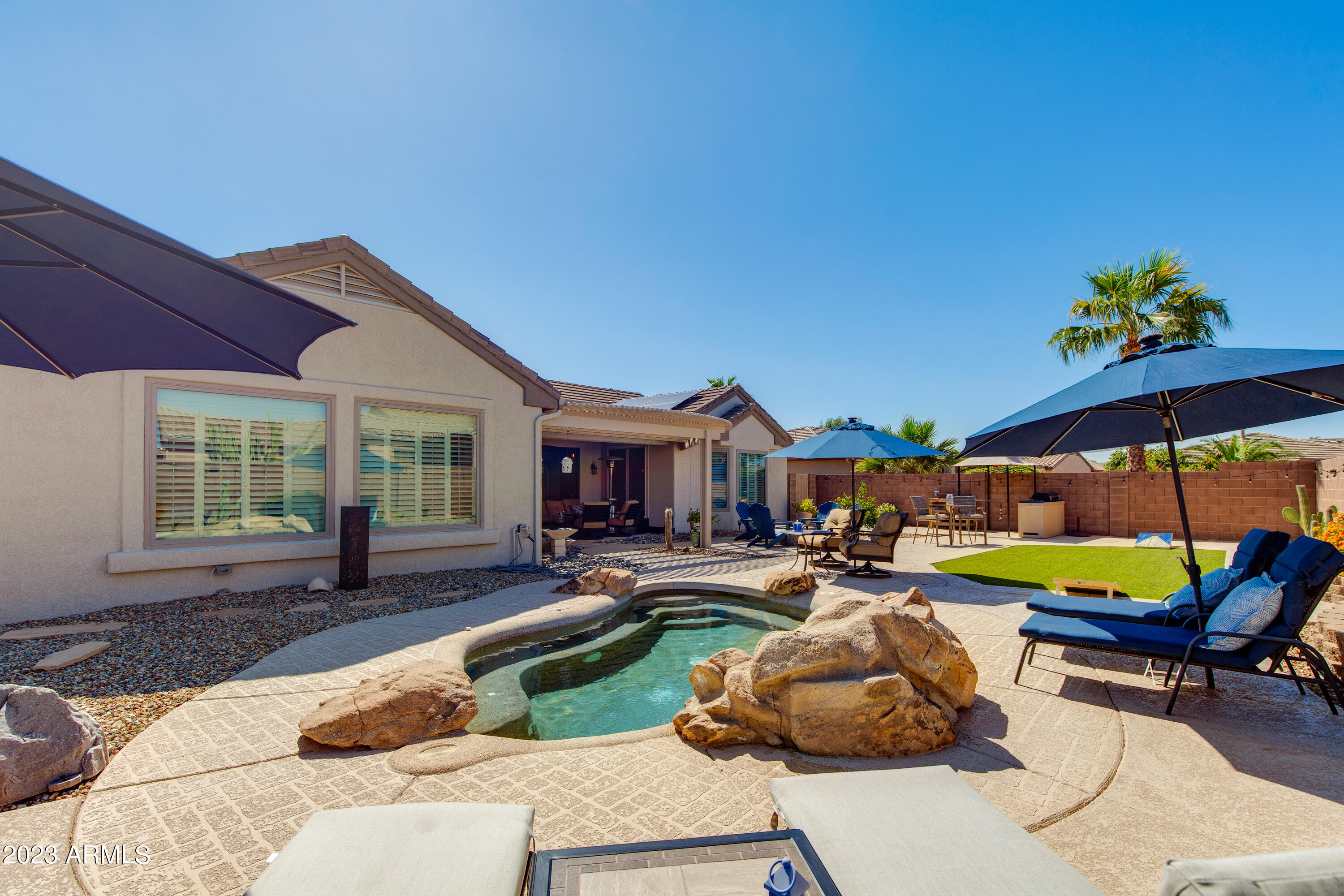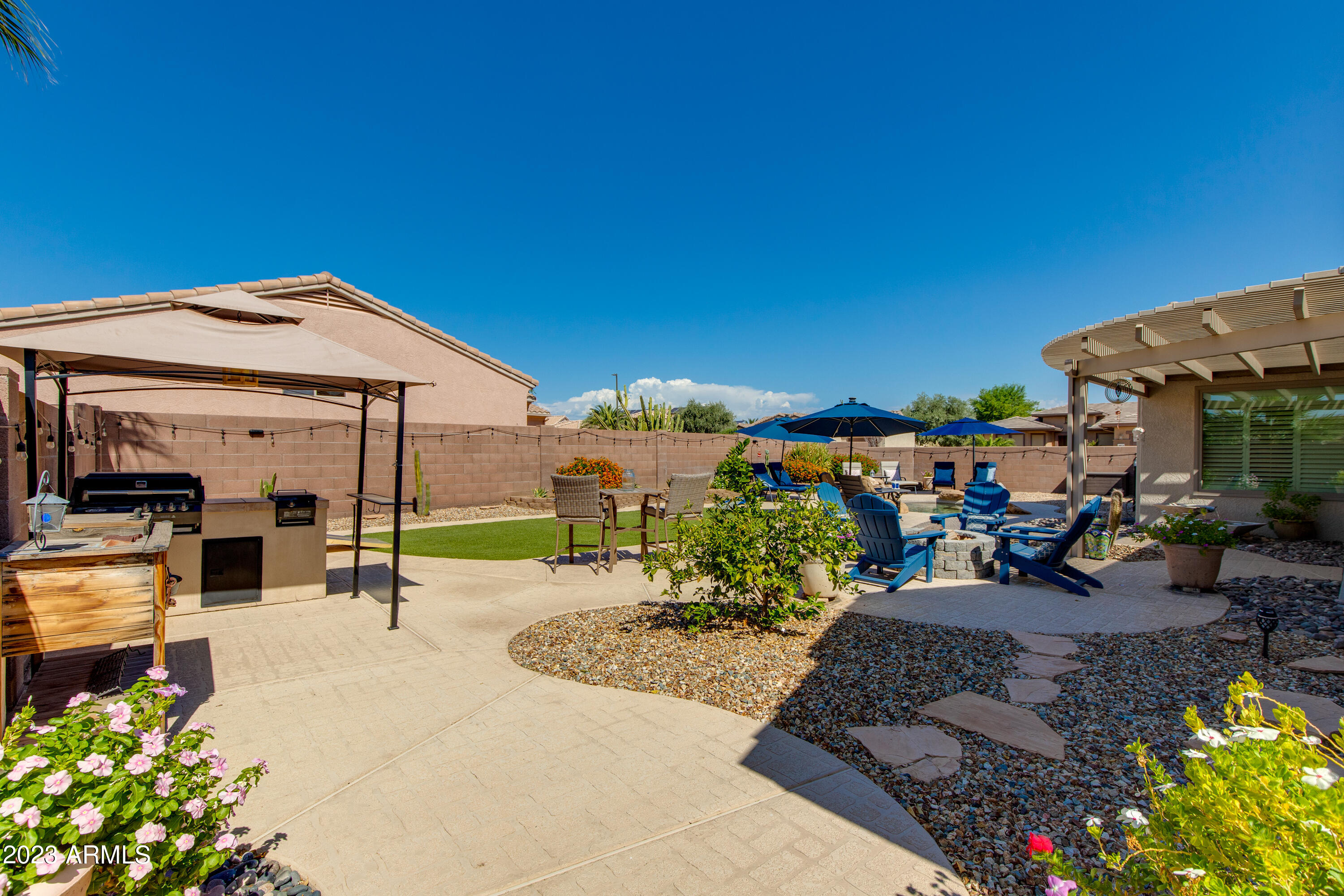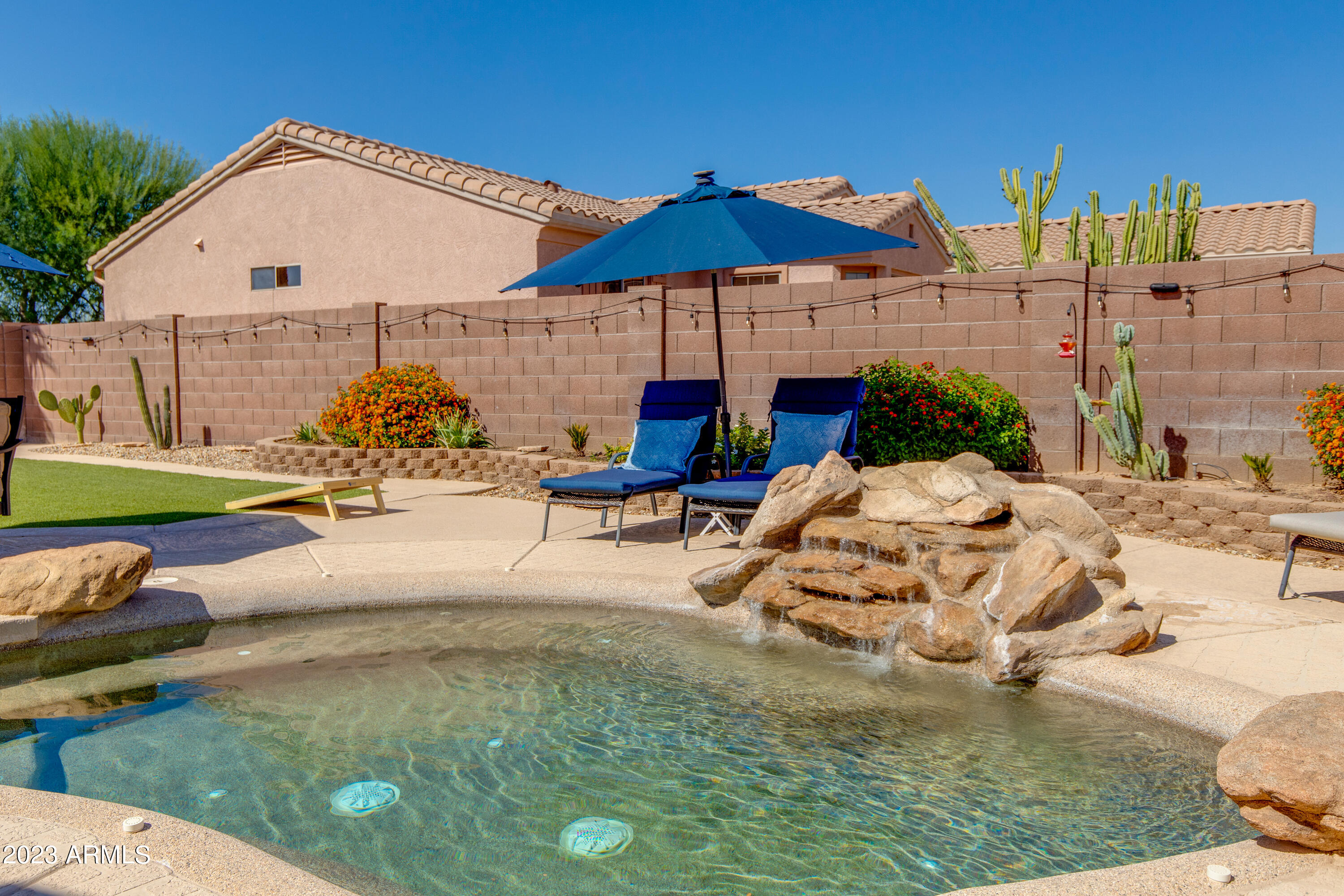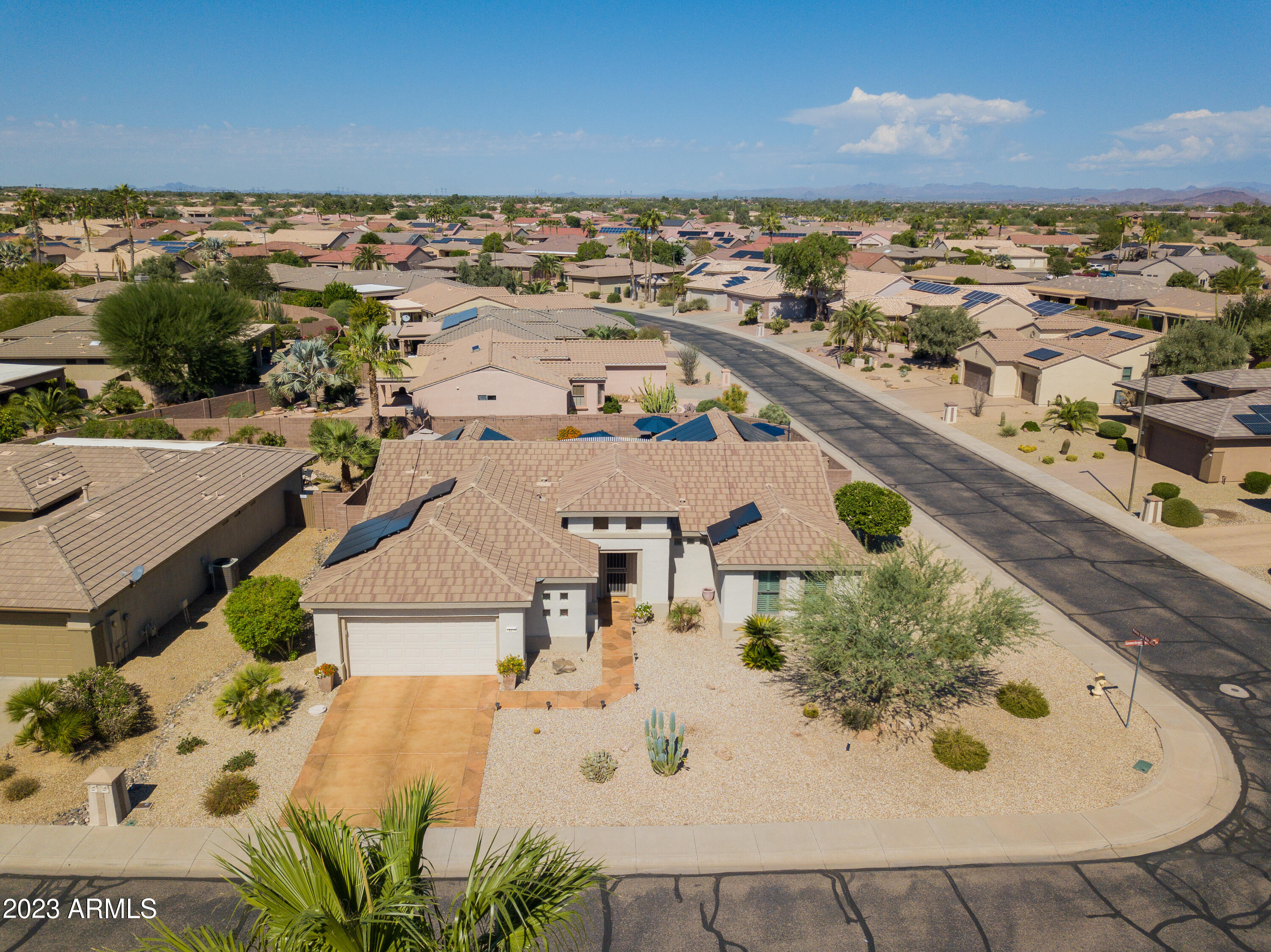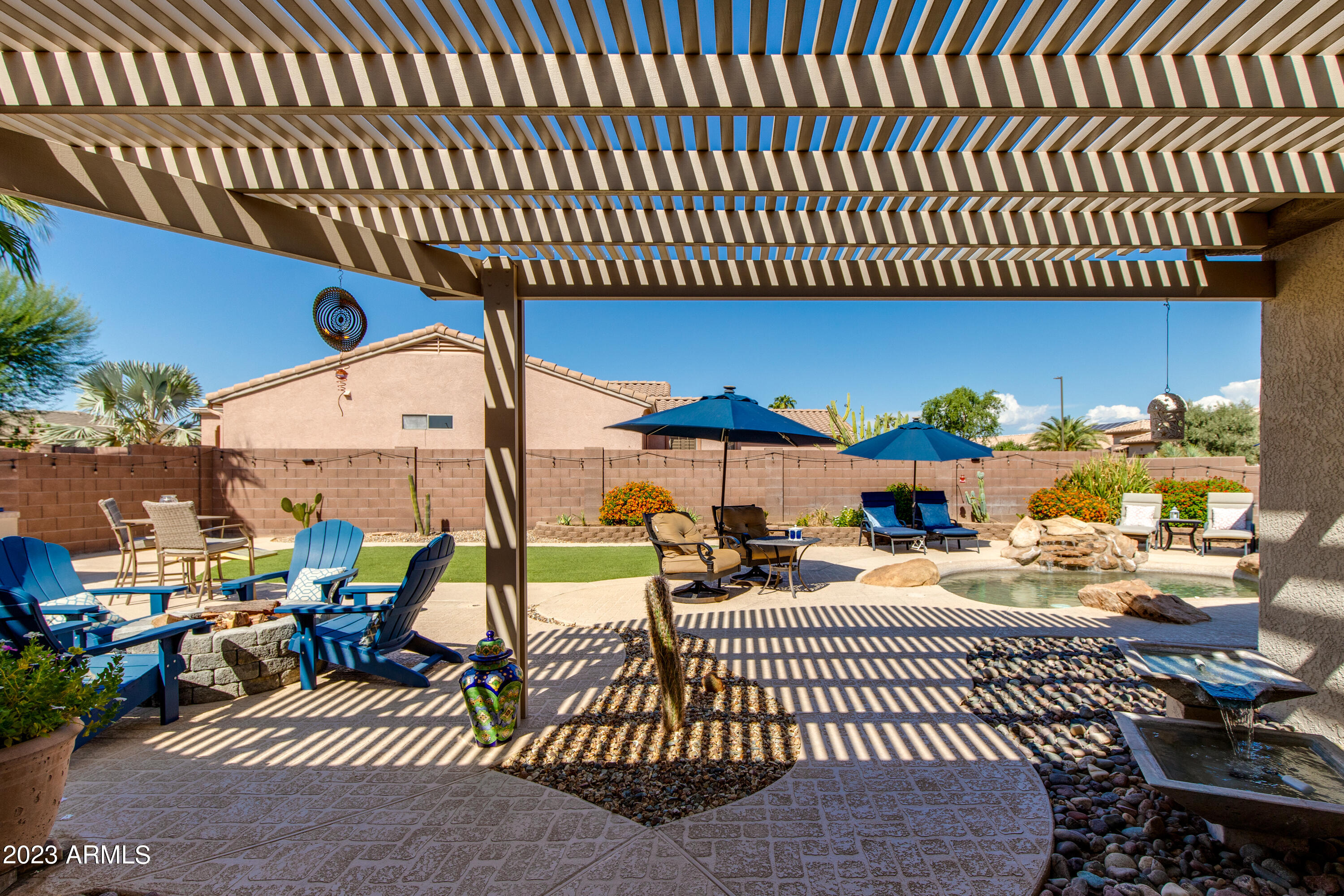 Thoughtfully enhanced both inside + out, this 2BR/2BA 2,446 sf home is located on a generous corner lot in Sun City Grand. An entertainer's dream, step inside to find a spacious split floorplan, combined living + dining area w/ full built-in bar and patio access, enclosed den, + open family room. Well-appointed kitchen ideal for hosting w/ stainless steel appliances, tiled backsplash, warm cabinetry w/ pullout shelves, breakfast bar & pantry. Lg owner's suite offers stunning ensuite bath + walk-in closet w/ dog door access to dog run. Step out back to the low-maintenance oasis complete w/ bbq, firepit, spool w/ LED lights + waterfall, pergola patio & turf even measured for cornhole! Oversized 2.5 golf-car garage w/ cabinetry. Solar panels recently installed. Sun City Grand amenities!