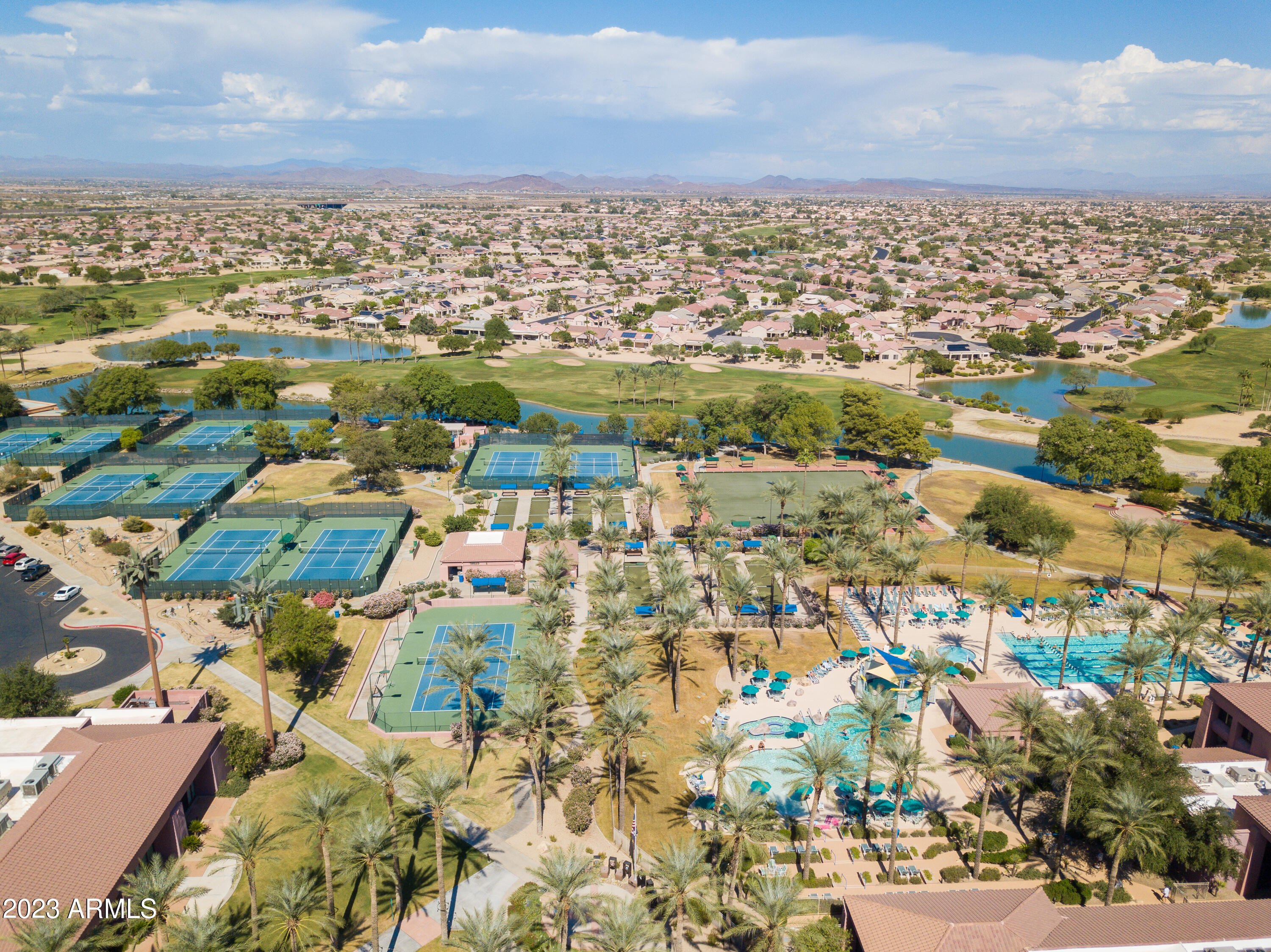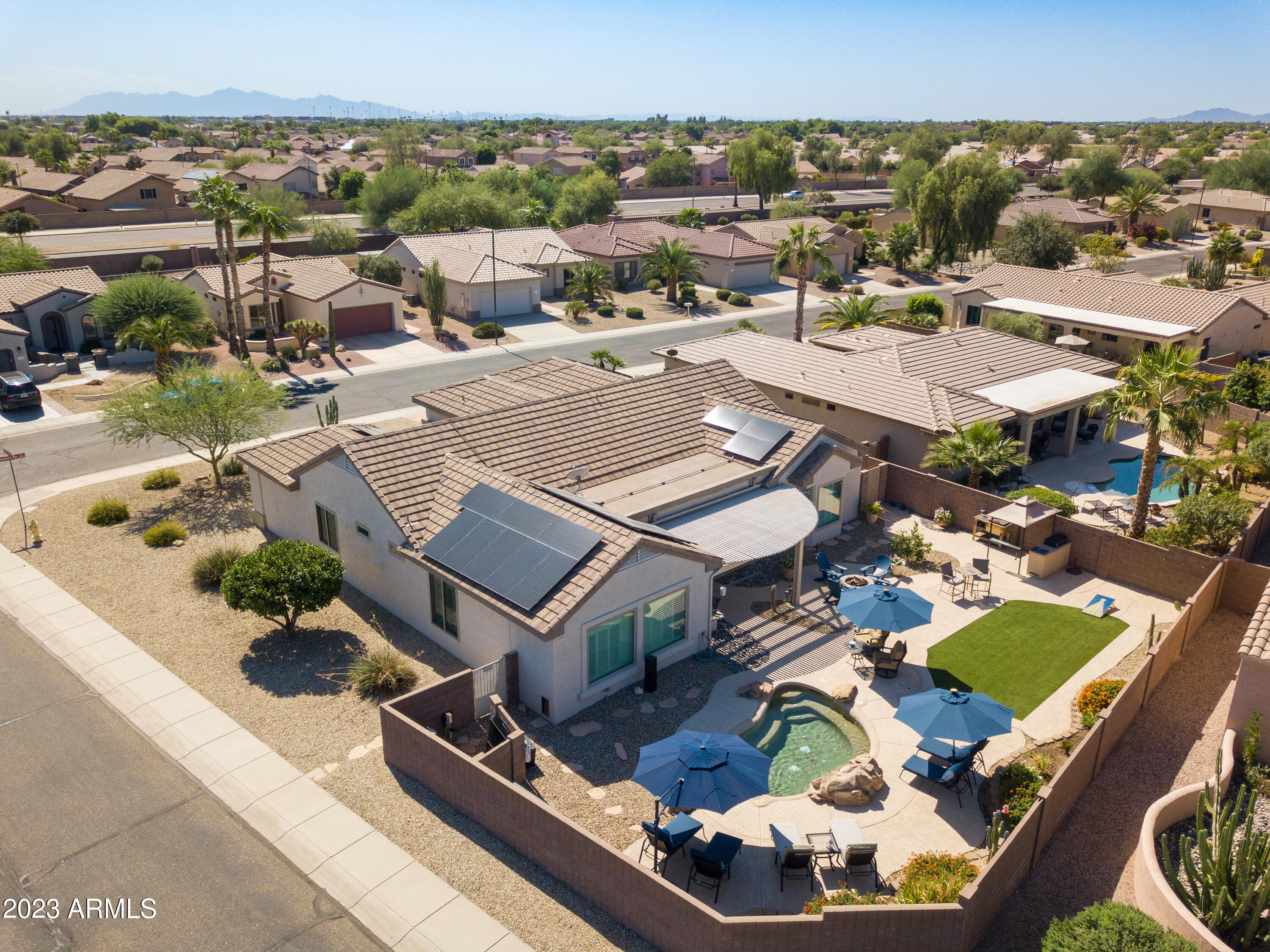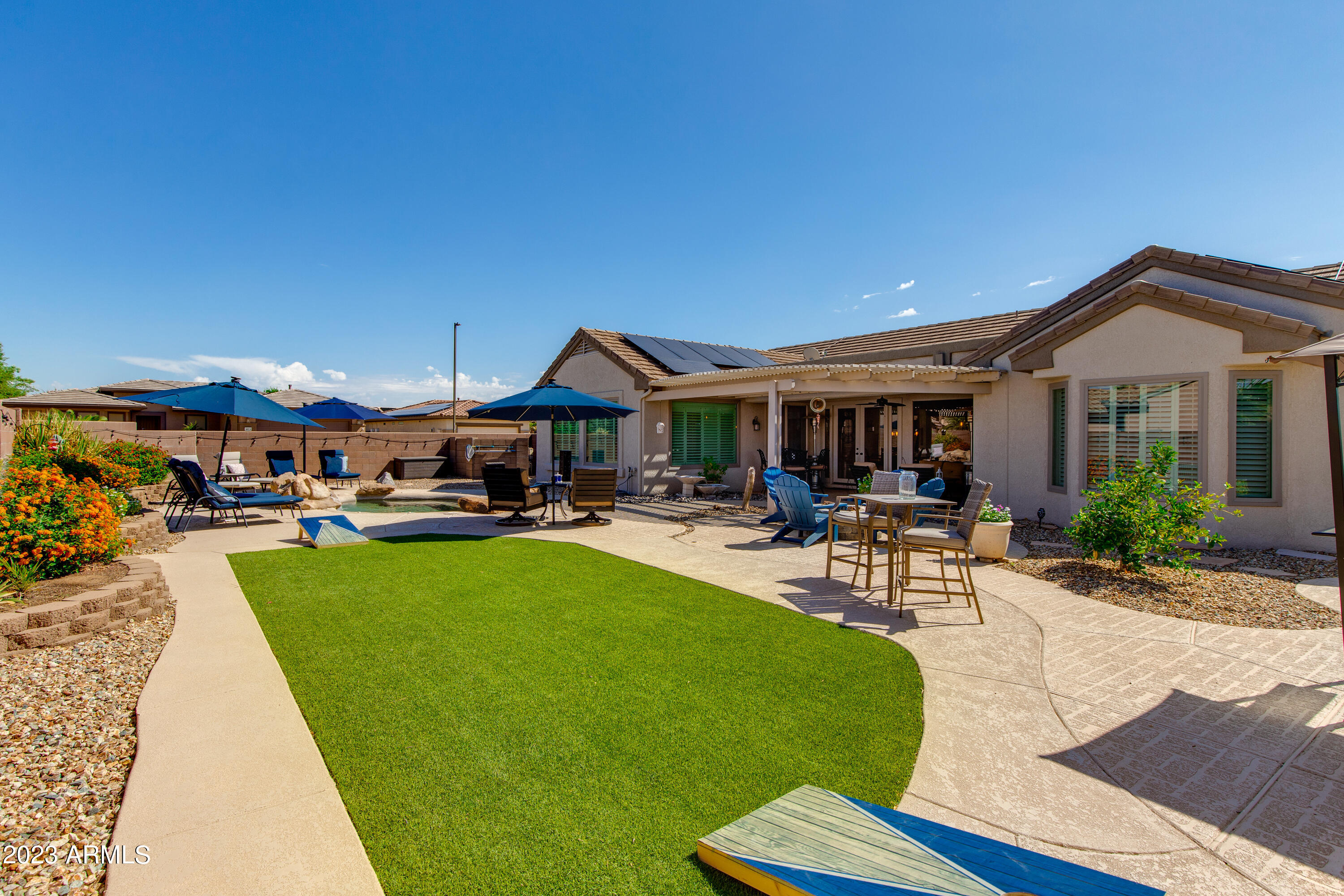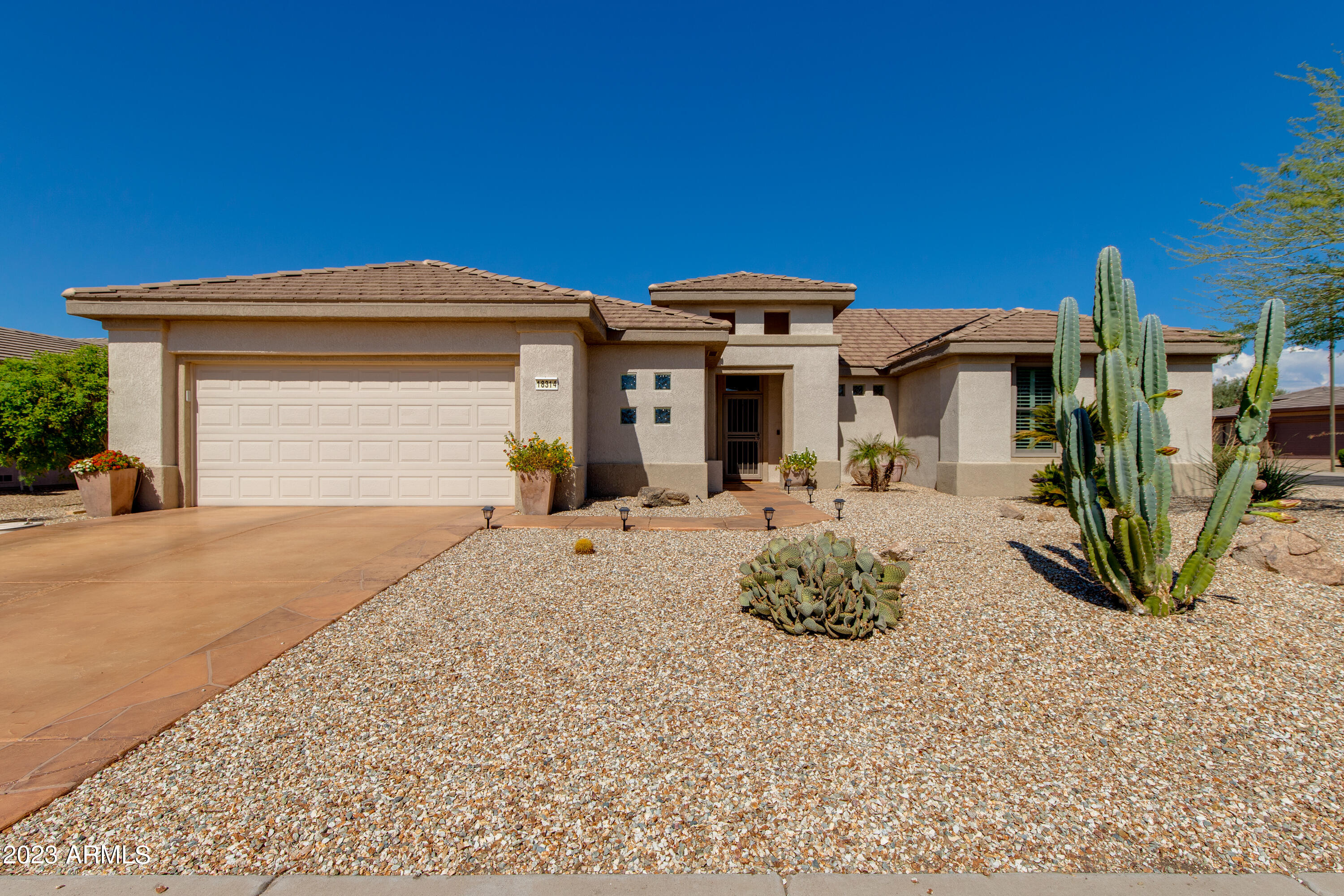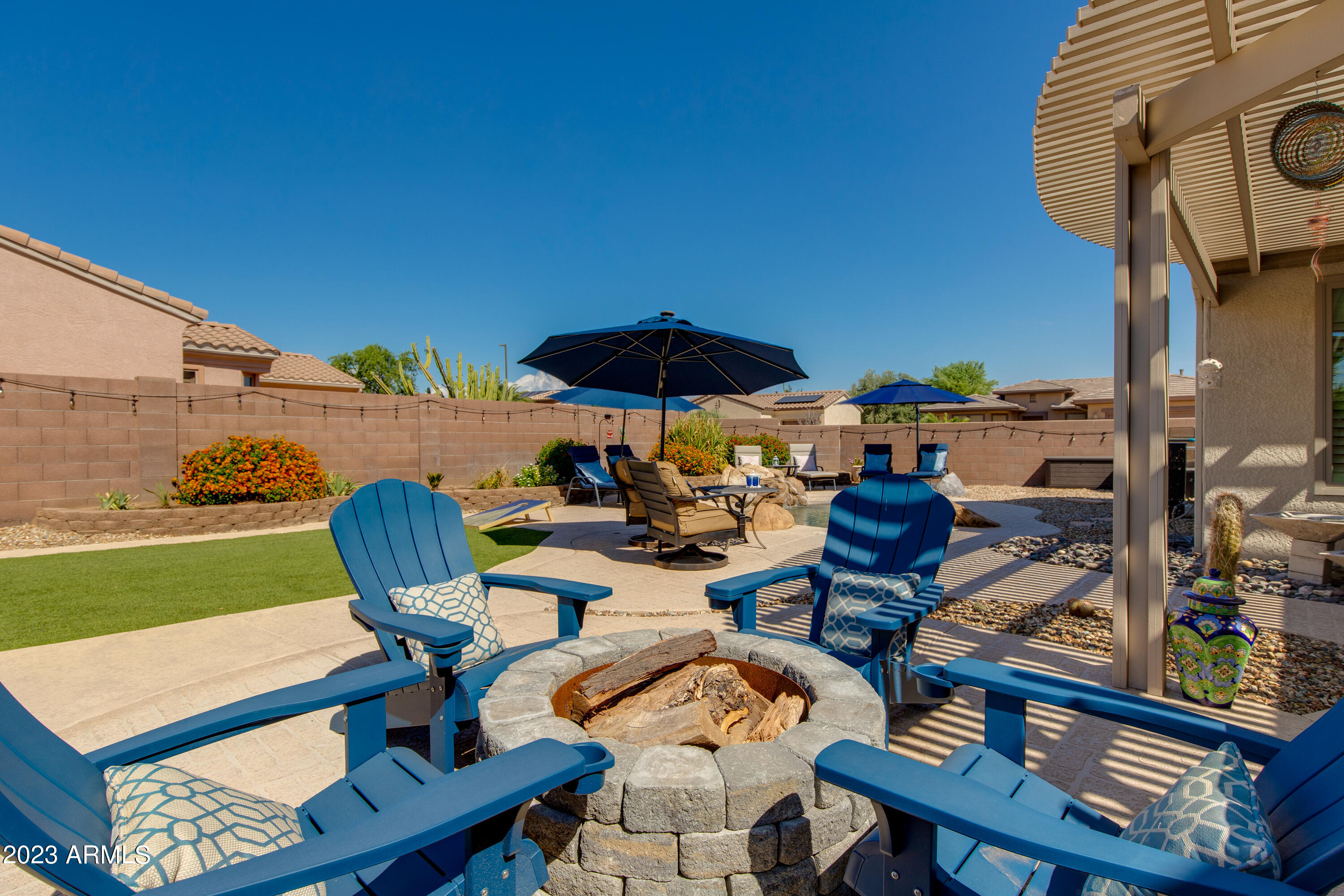 Thoughtfully enhanced both inside + out, this 2BR/2BA 2,446 sf home is located on a generous corner lot in Sun City Grand. An entertainer's dream, step inside to find a spacious split floorplan, combined living + dining area w/ full built-in bar and patio access, enclosed den, + open family room. Well-appointed kitchen ideal for hosting w/ stainless steel appliances, tiled backsplash, warm cabinetry w/ pullout shelves, breakfast bar & pantry. Lg owner's suite offers stunning ensuite bath + walk-in closet w/ dog door access to dog run. Step out back to the low-maintenance oasis complete w/ bbq, firepit, spool w/ LED lights + waterfall, pergola patio & turf even measured for cornhole! Oversized 2.5 golf-car garage w/ cabinetry. Solar panels recently installed. Sun City Grand amenities!