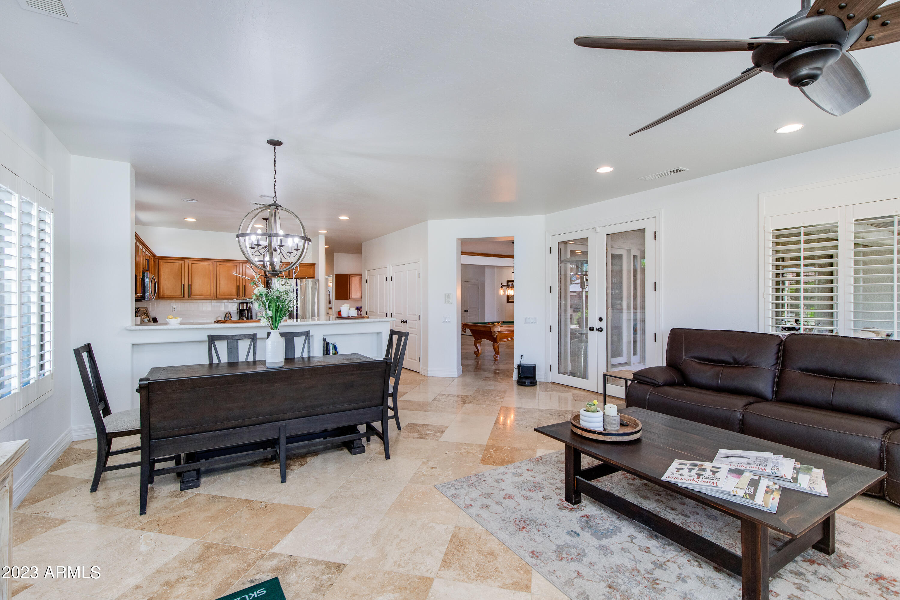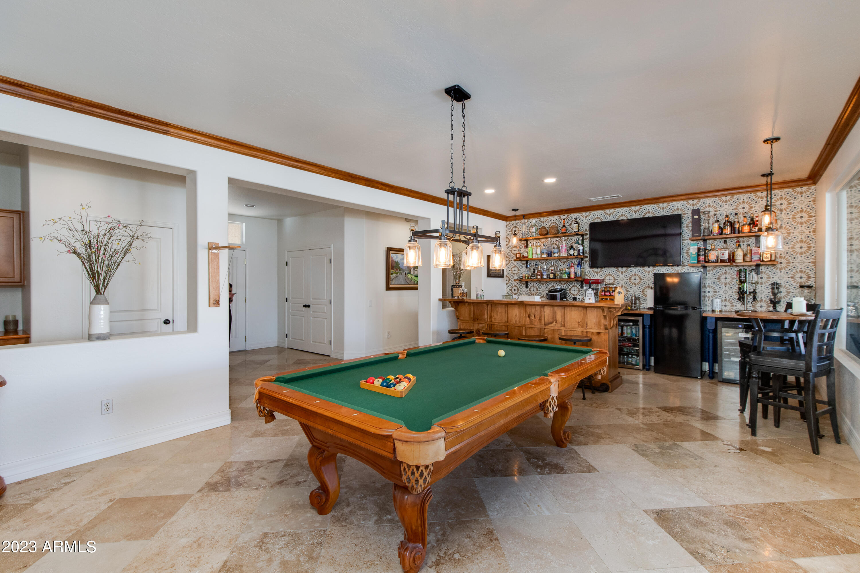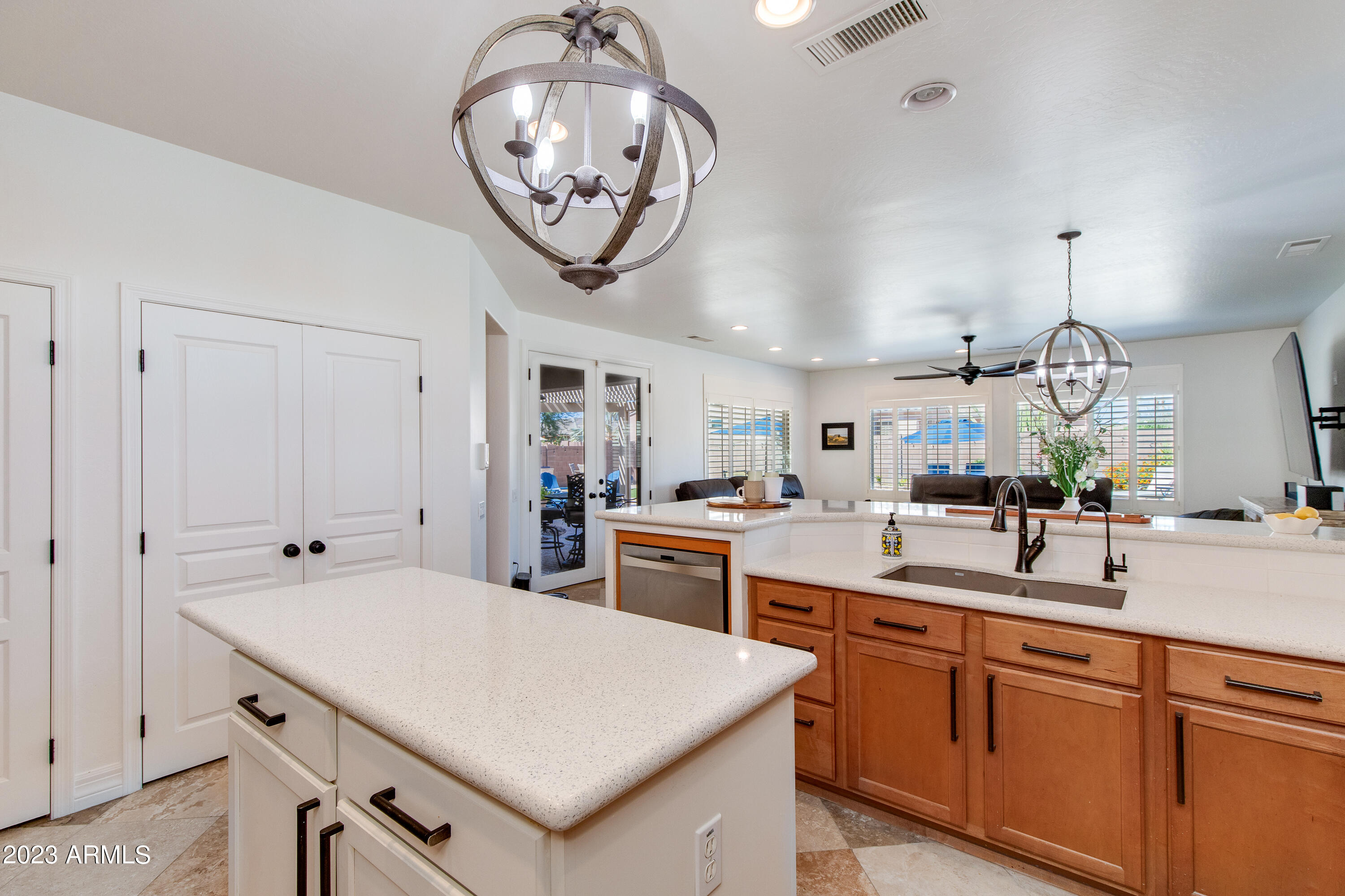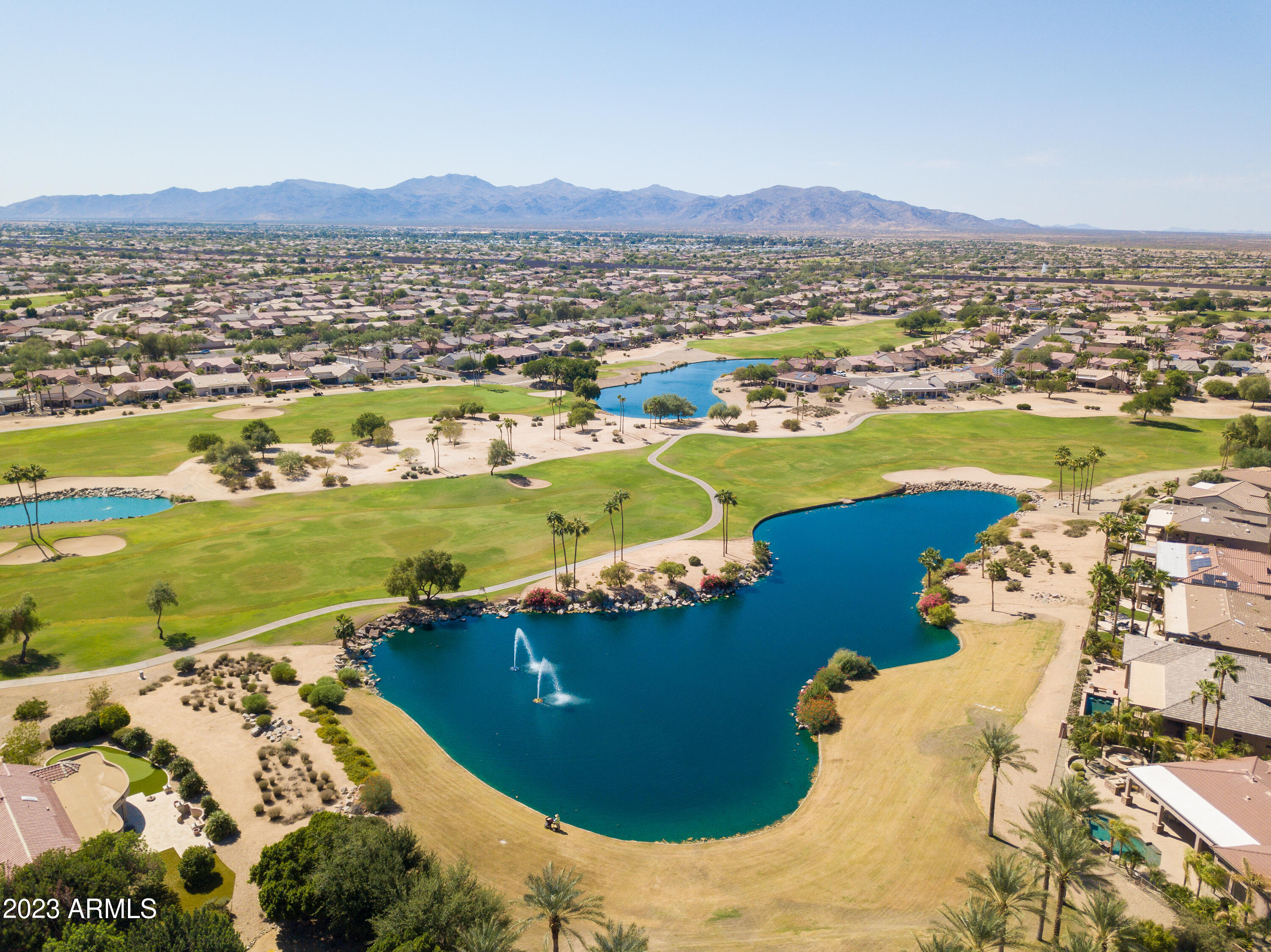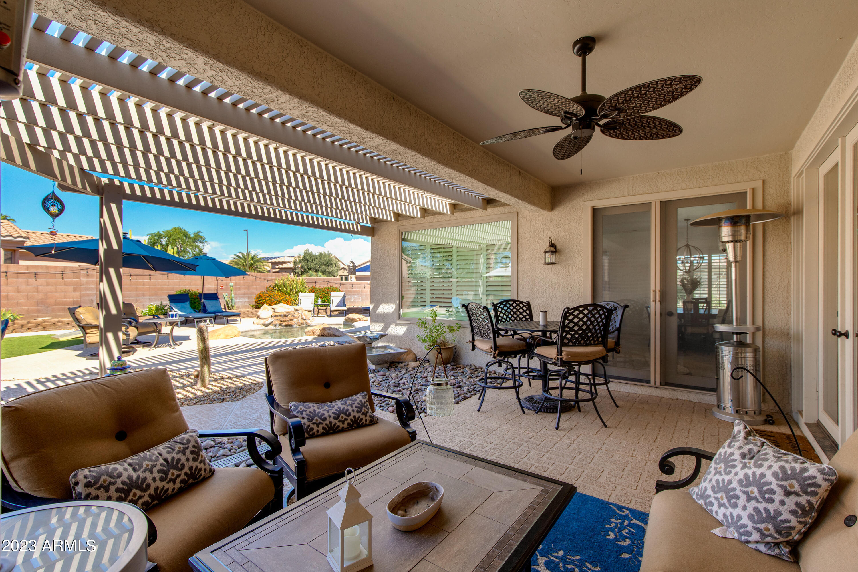 Thoughtfully enhanced both inside + out, this 2BR/2BA 2,446 sf home is located on a generous corner lot in Sun City Grand. An entertainer's dream, step inside to find a spacious split floorplan, combined living + dining area w/ full built-in bar and patio access, enclosed den, + open family room. Well-appointed kitchen ideal for hosting w/ stainless steel appliances, tiled backsplash, warm cabinetry w/ pullout shelves, breakfast bar & pantry. Lg owner's suite offers stunning ensuite bath + walk-in closet w/ dog door access to dog run. Step out back to the low-maintenance oasis complete w/ bbq, firepit, spool w/ LED lights + waterfall, pergola patio & turf even measured for cornhole! Oversized 2.5 golf-car garage w/ cabinetry. Solar panels recently installed. Sun City Grand amenities!