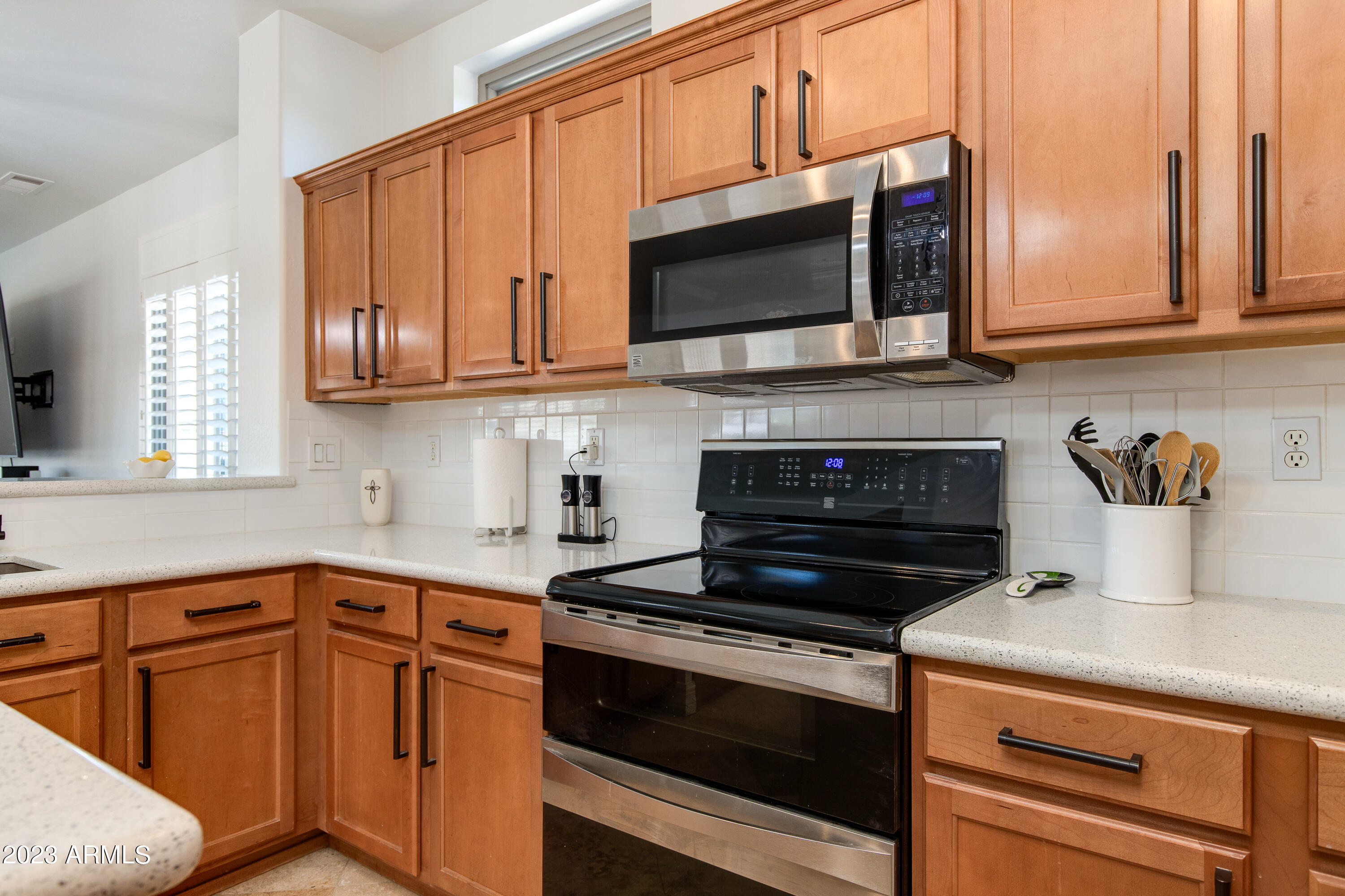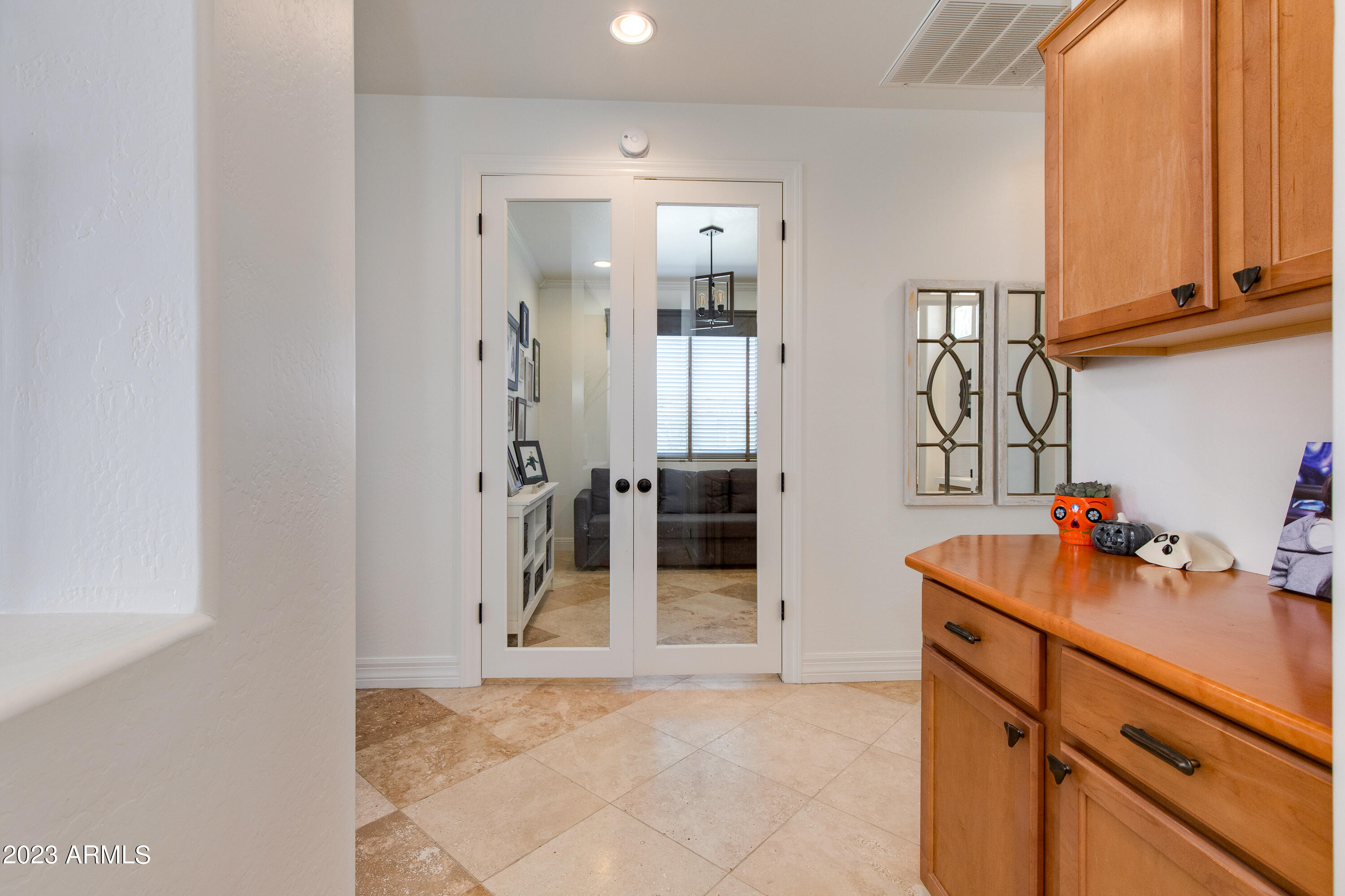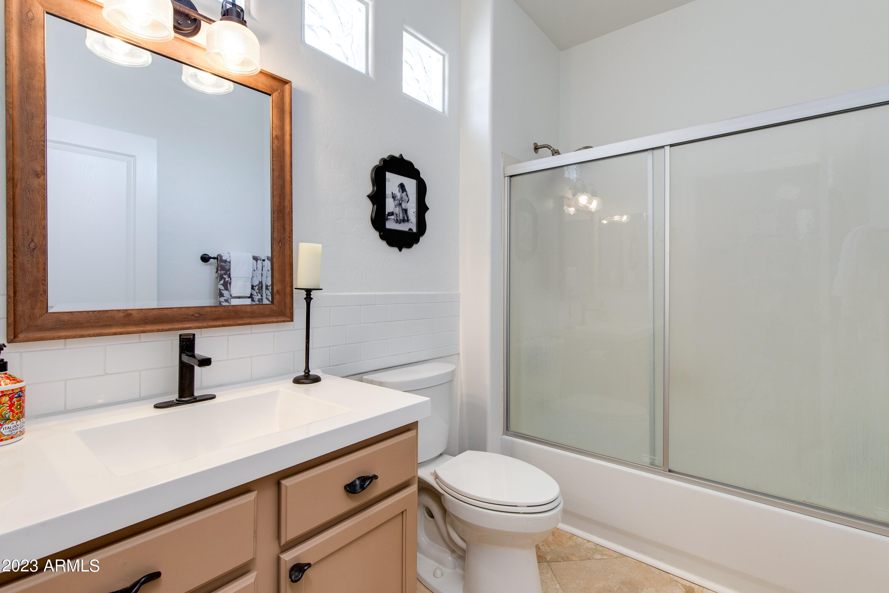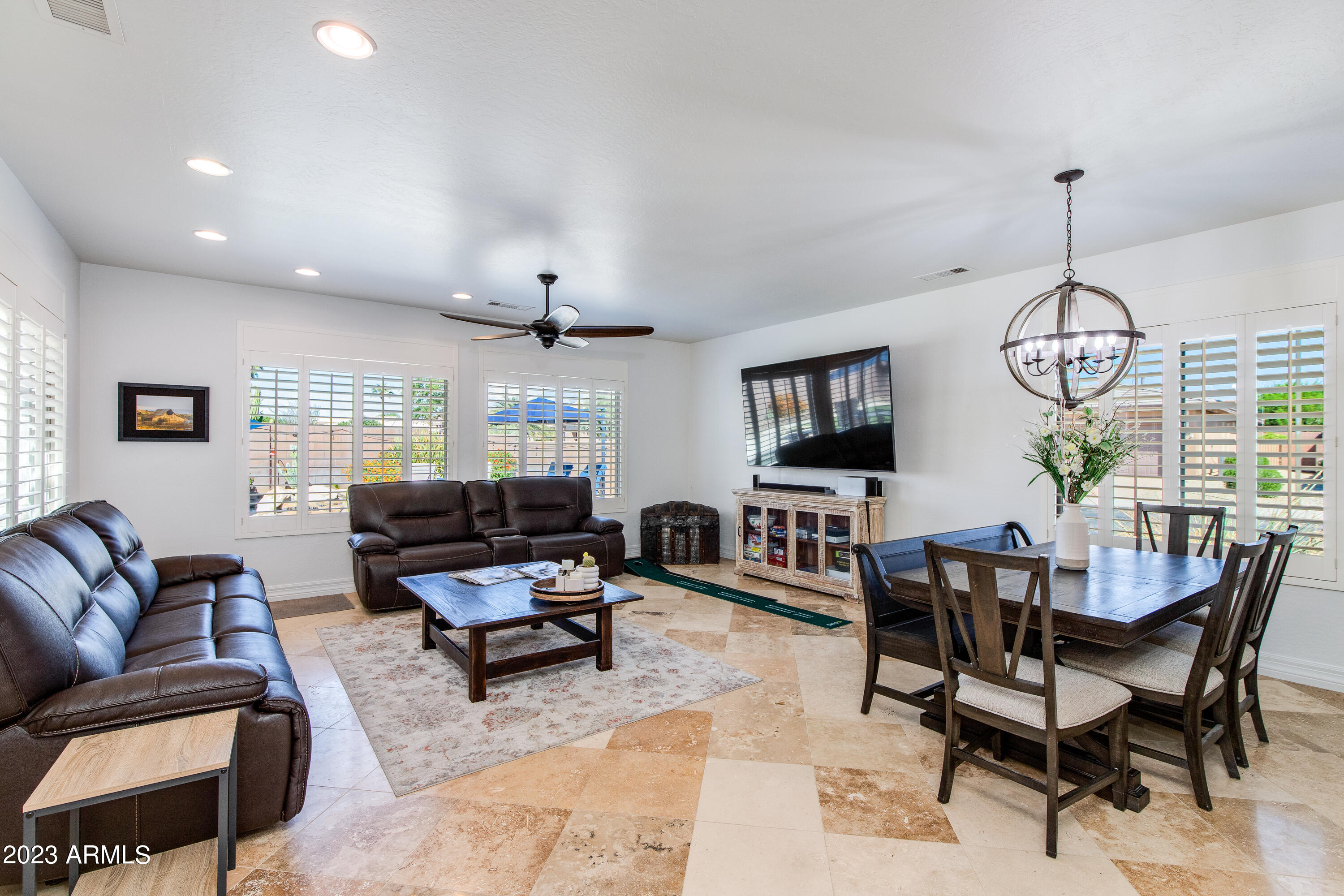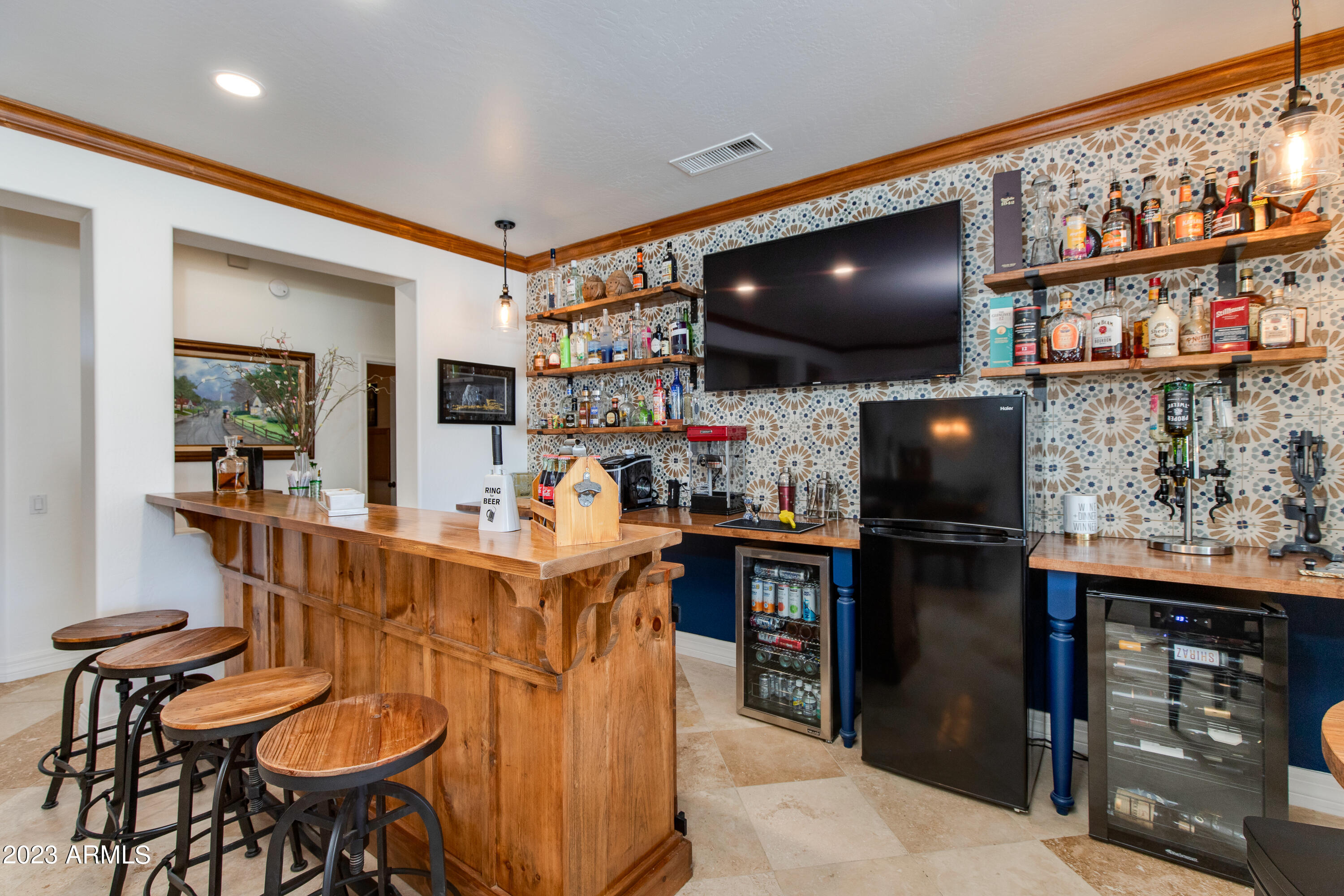 Thoughtfully enhanced both inside + out, this 2BR/2BA 2,446 sf home is located on a generous corner lot in Sun City Grand. An entertainer's dream, step inside to find a spacious split floorplan, combined living + dining area w/ full built-in bar and patio access, enclosed den, + open family room. Well-appointed kitchen ideal for hosting w/ stainless steel appliances, tiled backsplash, warm cabinetry w/ pullout shelves, breakfast bar & pantry. Lg owner's suite offers stunning ensuite bath + walk-in closet w/ dog door access to dog run. Step out back to the low-maintenance oasis complete w/ bbq, firepit, spool w/ LED lights + waterfall, pergola patio & turf even measured for cornhole! Oversized 2.5 golf-car garage w/ cabinetry. Solar panels recently installed. Sun City Grand amenities!