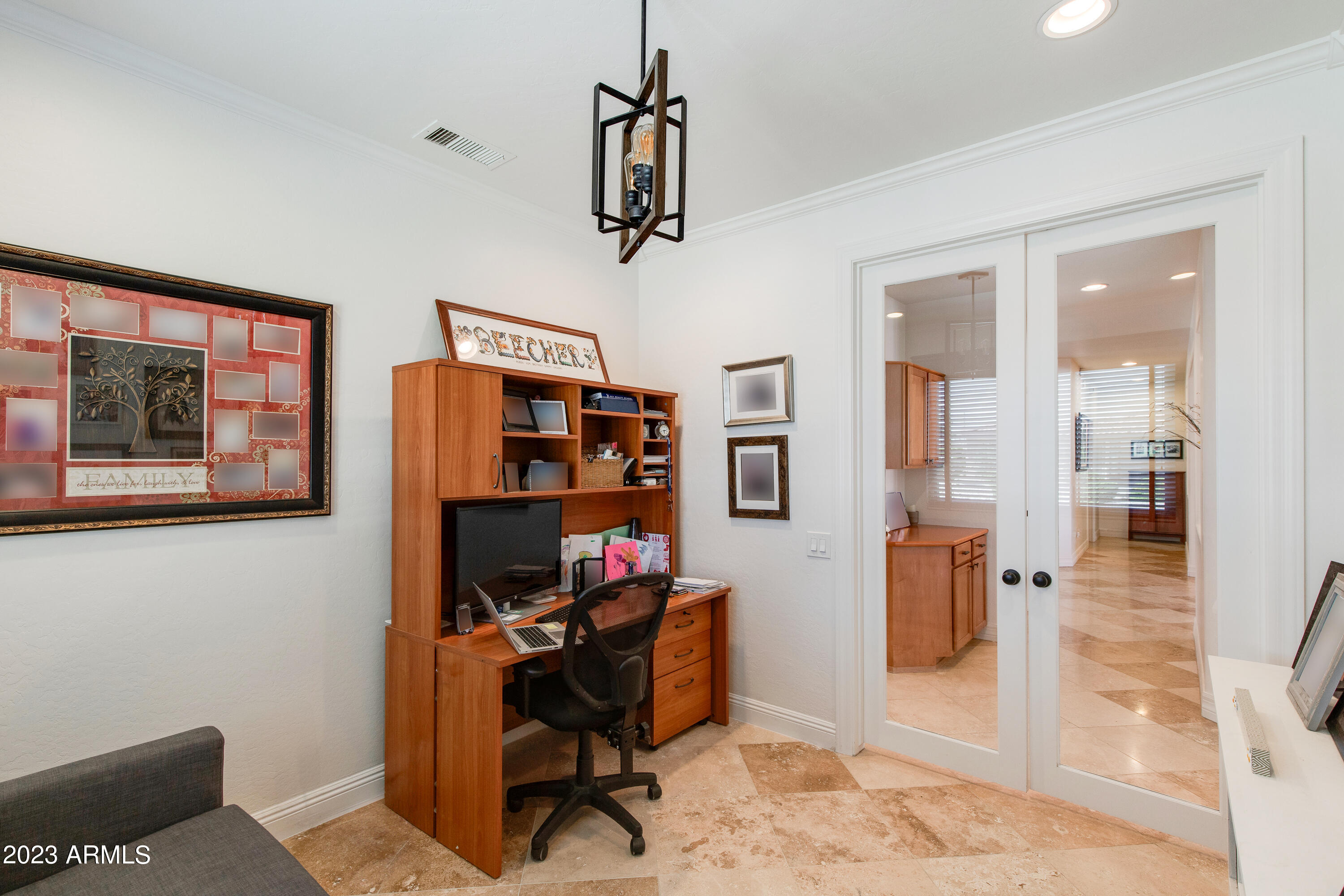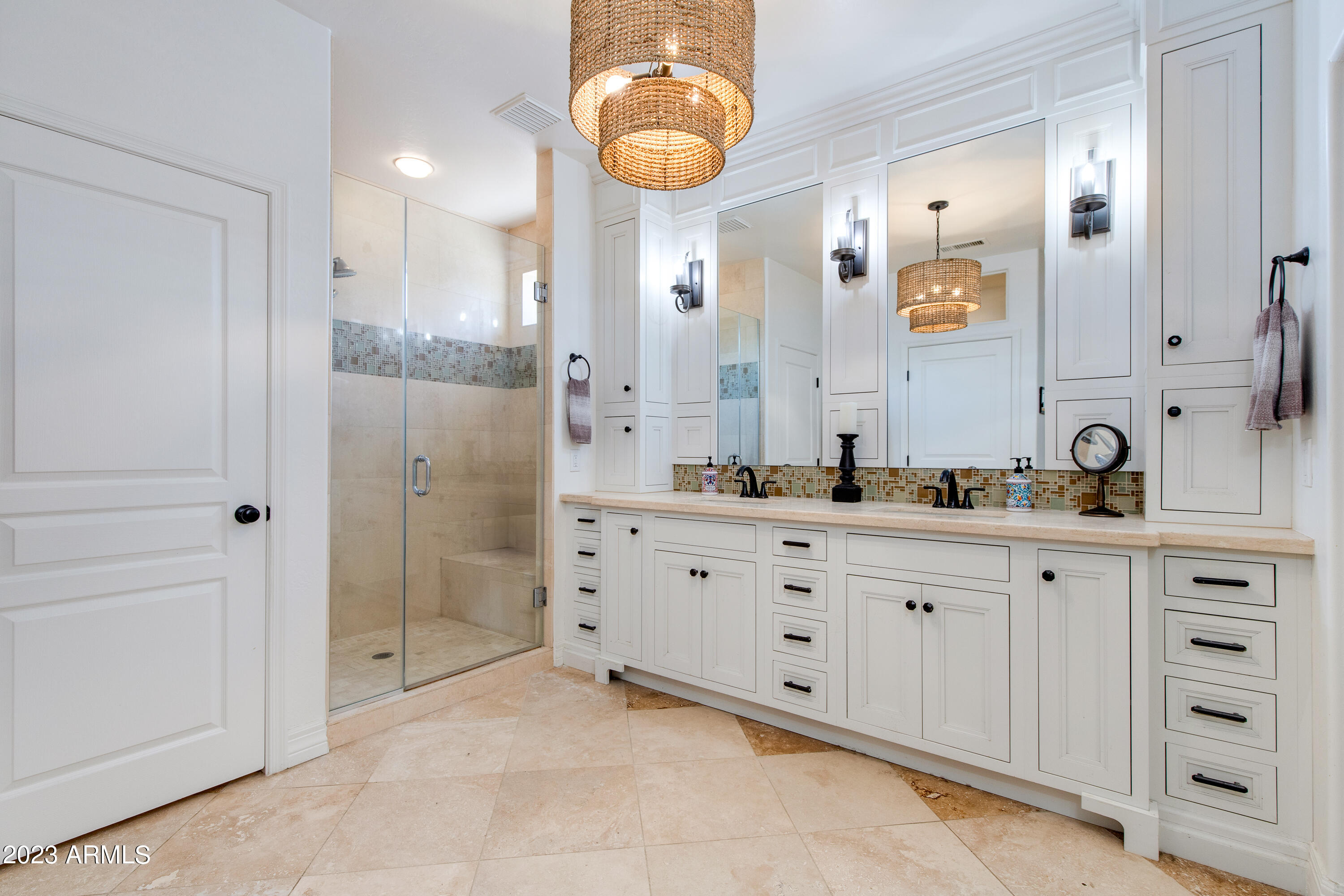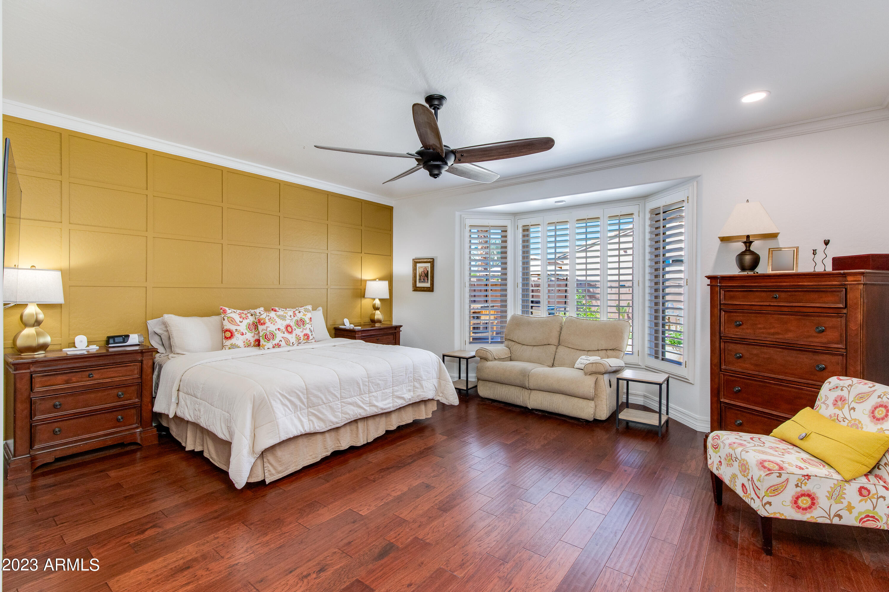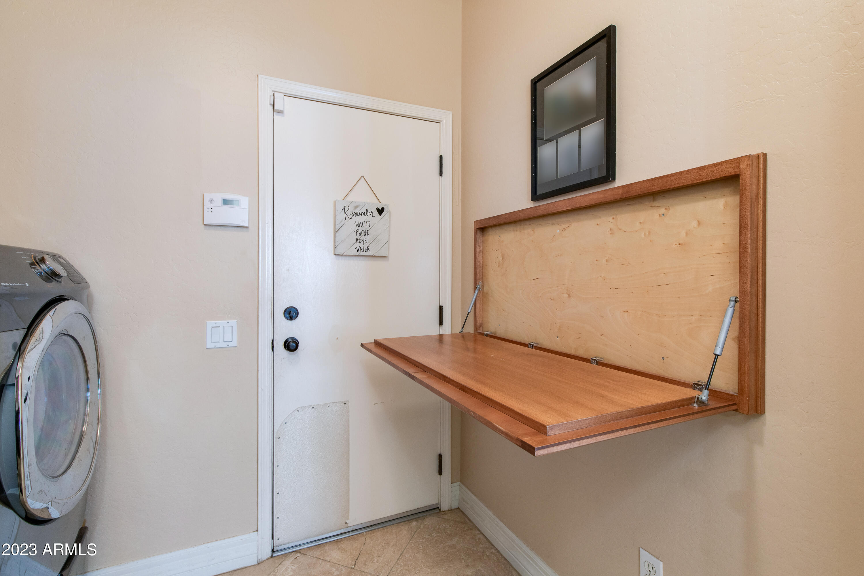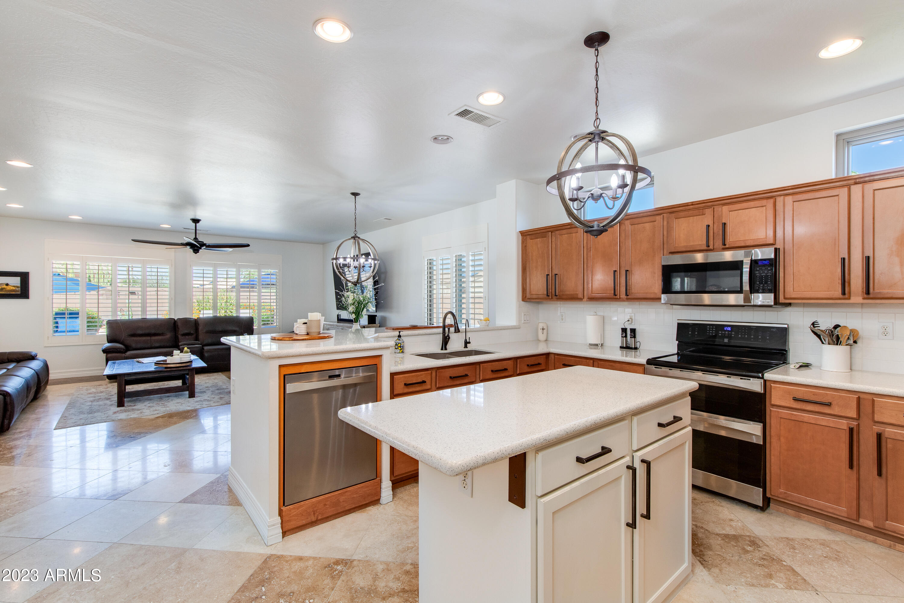 Thoughtfully enhanced both inside + out, this 2BR/2BA 2,446 sf home is located on a generous corner lot in Sun City Grand. An entertainer's dream, step inside to find a spacious split floorplan, combined living + dining area w/ full built-in bar and patio access, enclosed den, + open family room. Well-appointed kitchen ideal for hosting w/ stainless steel appliances, tiled backsplash, warm cabinetry w/ pullout shelves, breakfast bar & pantry. Lg owner's suite offers stunning ensuite bath + walk-in closet w/ dog door access to dog run. Step out back to the low-maintenance oasis complete w/ bbq, firepit, spool w/ LED lights + waterfall, pergola patio & turf even measured for cornhole! Oversized 2.5 golf-car garage w/ cabinetry. Solar panels recently installed. Sun City Grand amenities!