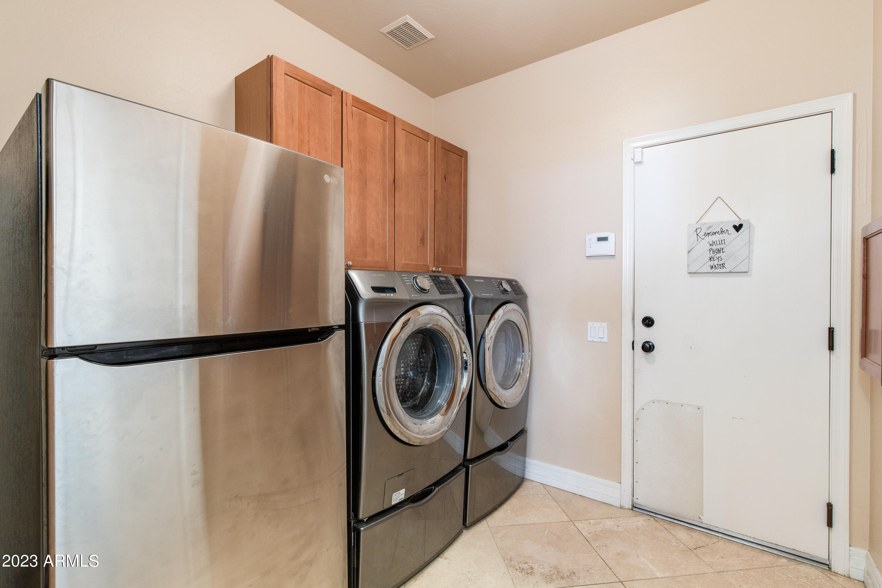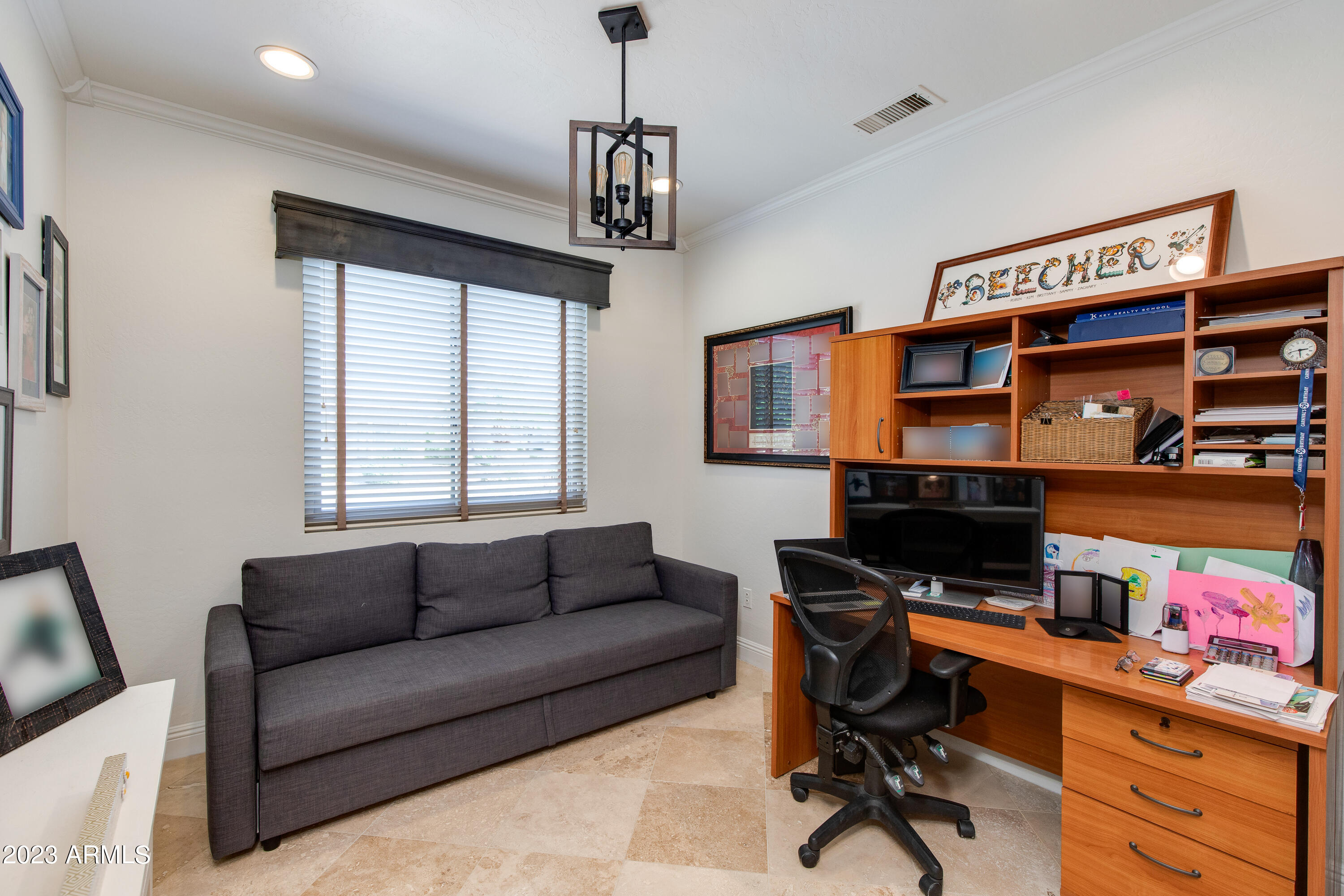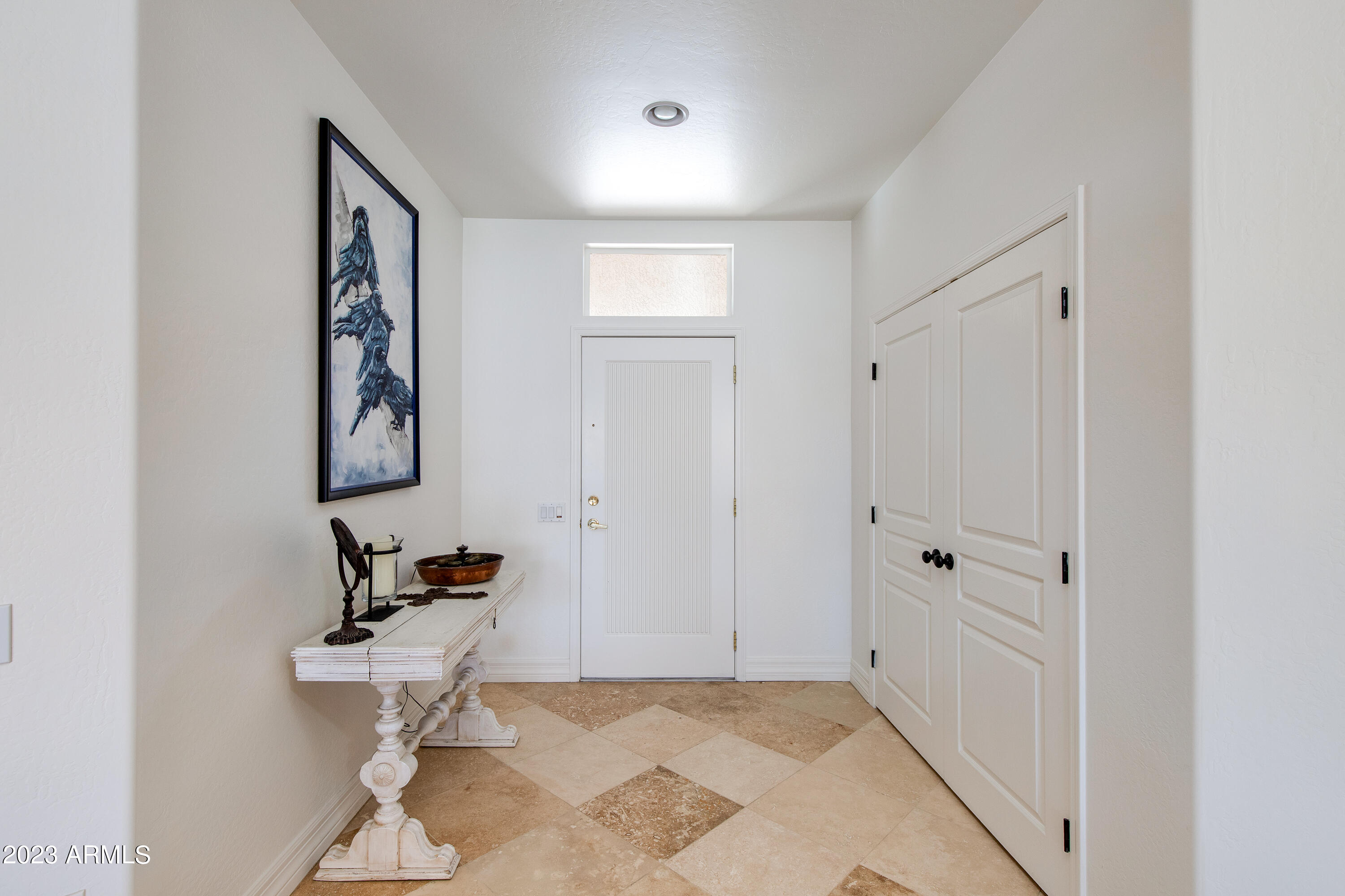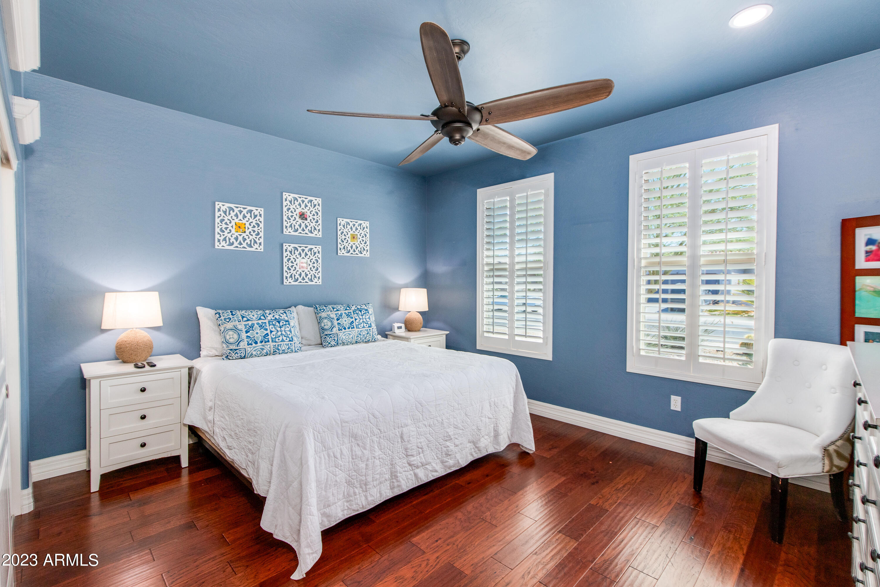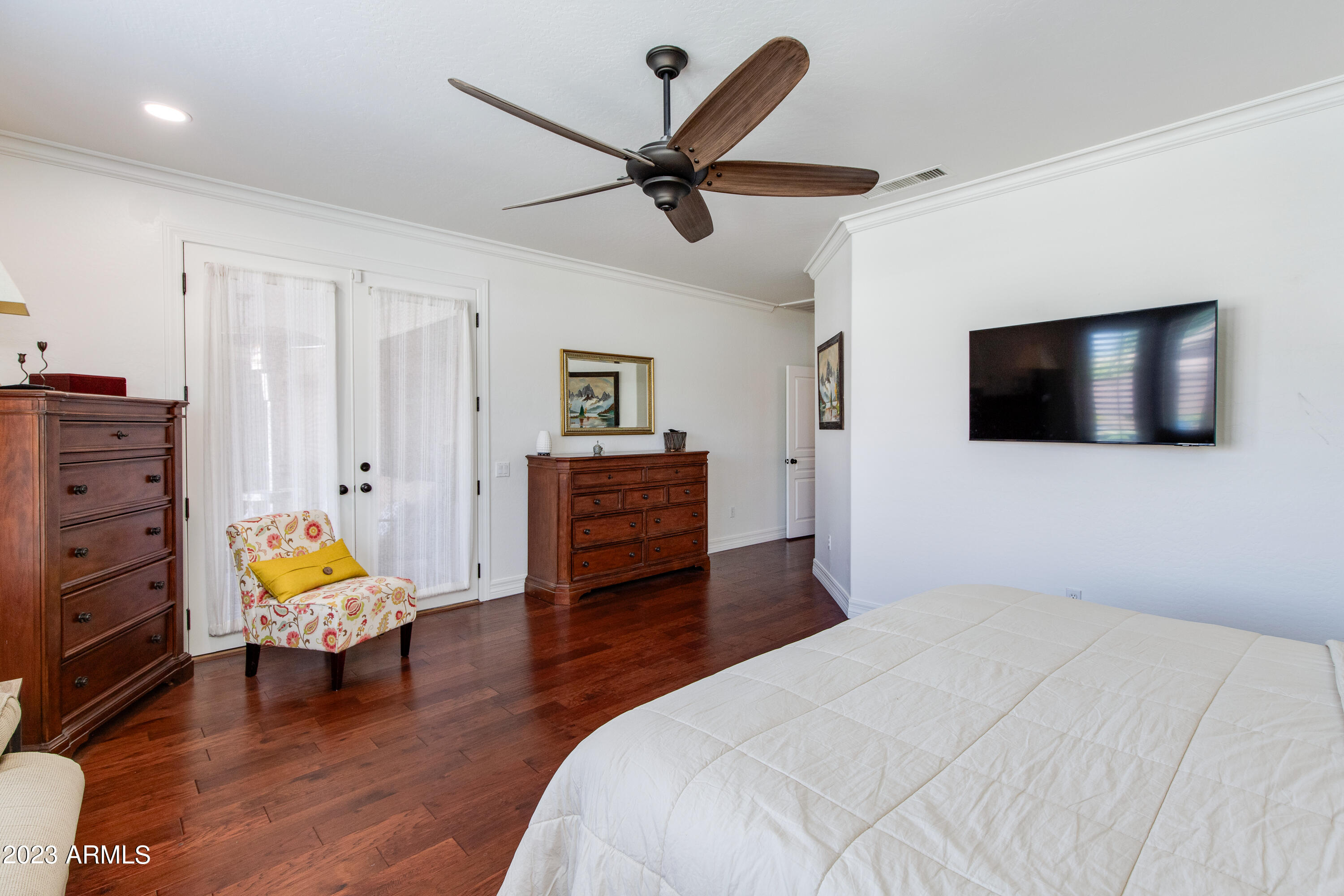 Thoughtfully enhanced both inside + out, this 2BR/2BA 2,446 sf home is located on a generous corner lot in Sun City Grand. An entertainer's dream, step inside to find a spacious split floorplan, combined living + dining area w/ full built-in bar and patio access, enclosed den, + open family room. Well-appointed kitchen ideal for hosting w/ stainless steel appliances, tiled backsplash, warm cabinetry w/ pullout shelves, breakfast bar & pantry. Lg owner's suite offers stunning ensuite bath + walk-in closet w/ dog door access to dog run. Step out back to the low-maintenance oasis complete w/ bbq, firepit, spool w/ LED lights + waterfall, pergola patio & turf even measured for cornhole! Oversized 2.5 golf-car garage w/ cabinetry. Solar panels recently installed. Sun City Grand amenities!