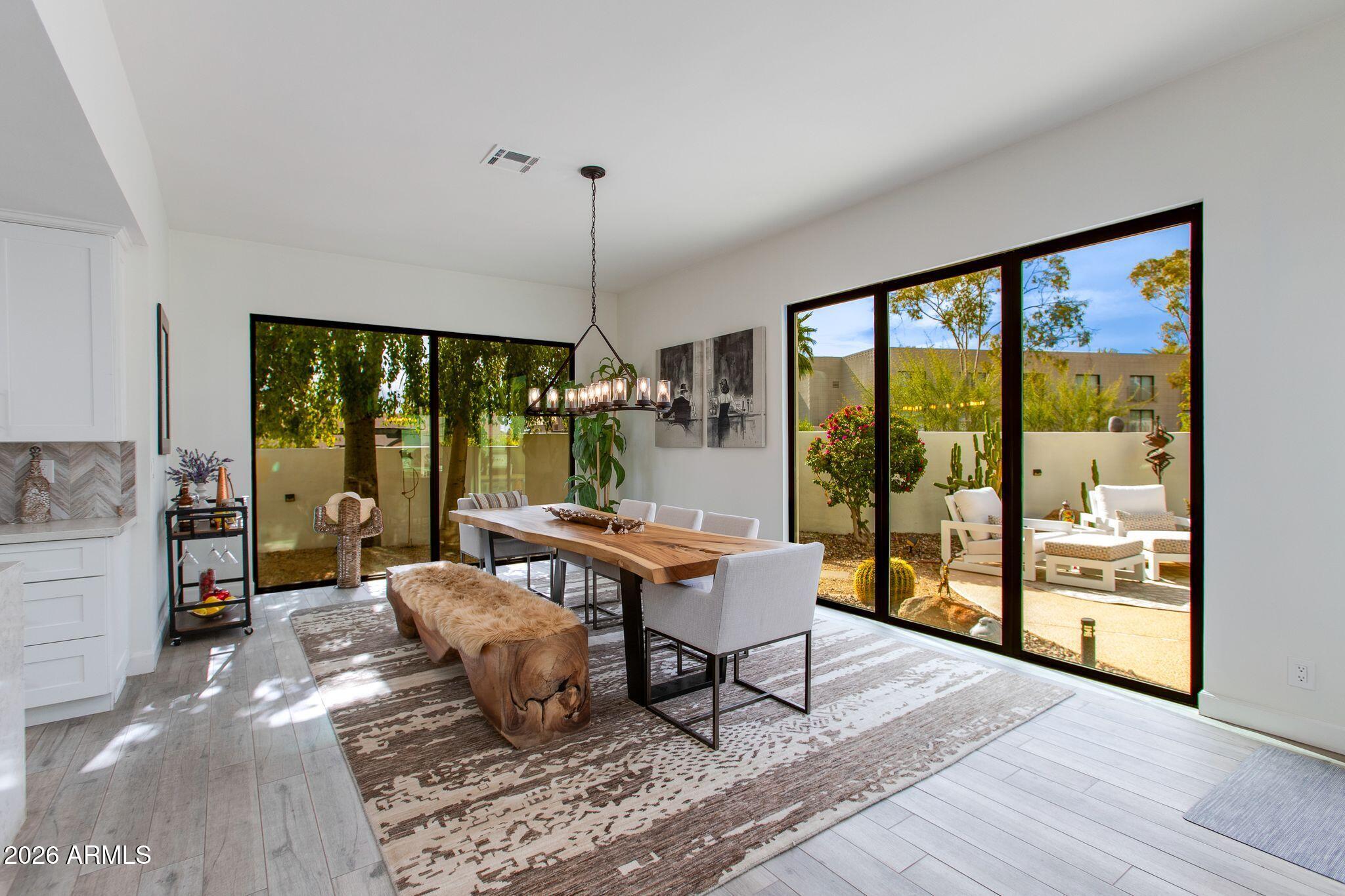 Beautifully remodeled home in the guard-gated Biltmore Gates community featuring an ideal open floor plan and refined finishes throughout. Enter through the dramatic foyer with tile flooring and modern lighting. The expansive great room is designed for entertaining and showcases a statement fireplace with marble mosaic tiles. The kitchen is thoughtfully designed with a large island, skylight, breakfast bar, Viking appliances, and a coordinating marble mosaic backsplash. The adjacent dining room flows seamlessly from the kitchen and features walls of windows, creating a bright and inviting space. Seamless indoor-outdoor living is achieved with a pocket sliding door that opens to the private backyard, complete with a heated pool and spa. A dedicated office is privately situated and also features abundant natural light, making it ideal for working from home. The spacious primary suite offers a sitting area and a luxurious bathroom with a walk-in shower and designer tile finishes. Attached guest quarters include a private entrance, fireplace, full bathroom, and kitchenette, providing flexibility for guests or multigenerational living. Situated on a corner lot, this home is steps from the Arizona Biltmore Resort and minutes from premier shopping, dining, downtown Phoenix, Scottsdale, and Sky Harbor Airport.