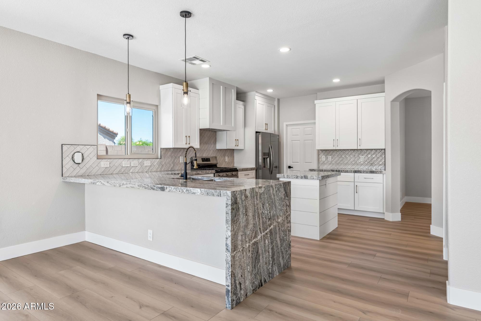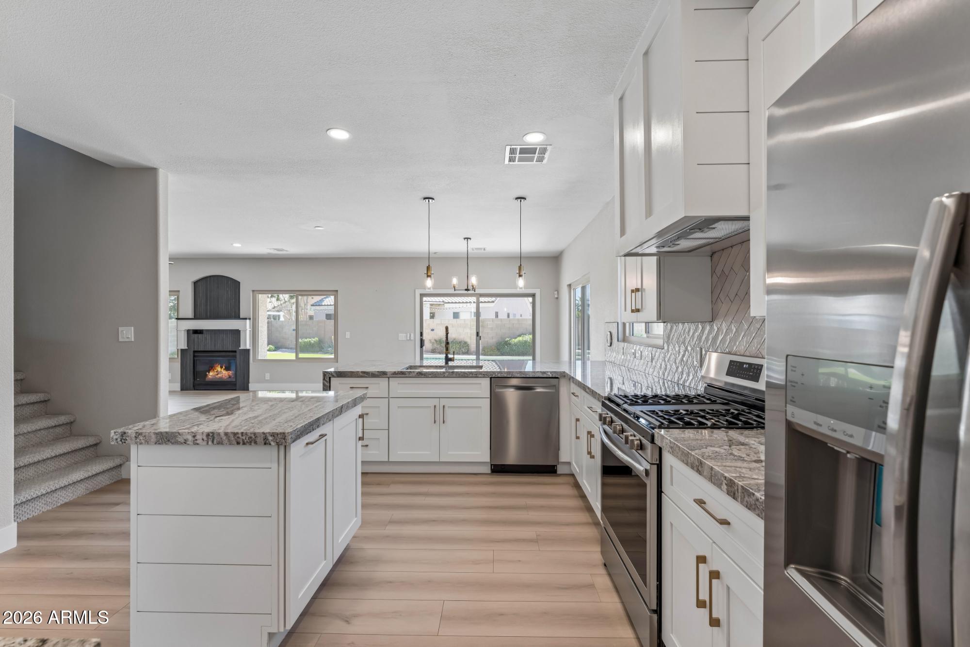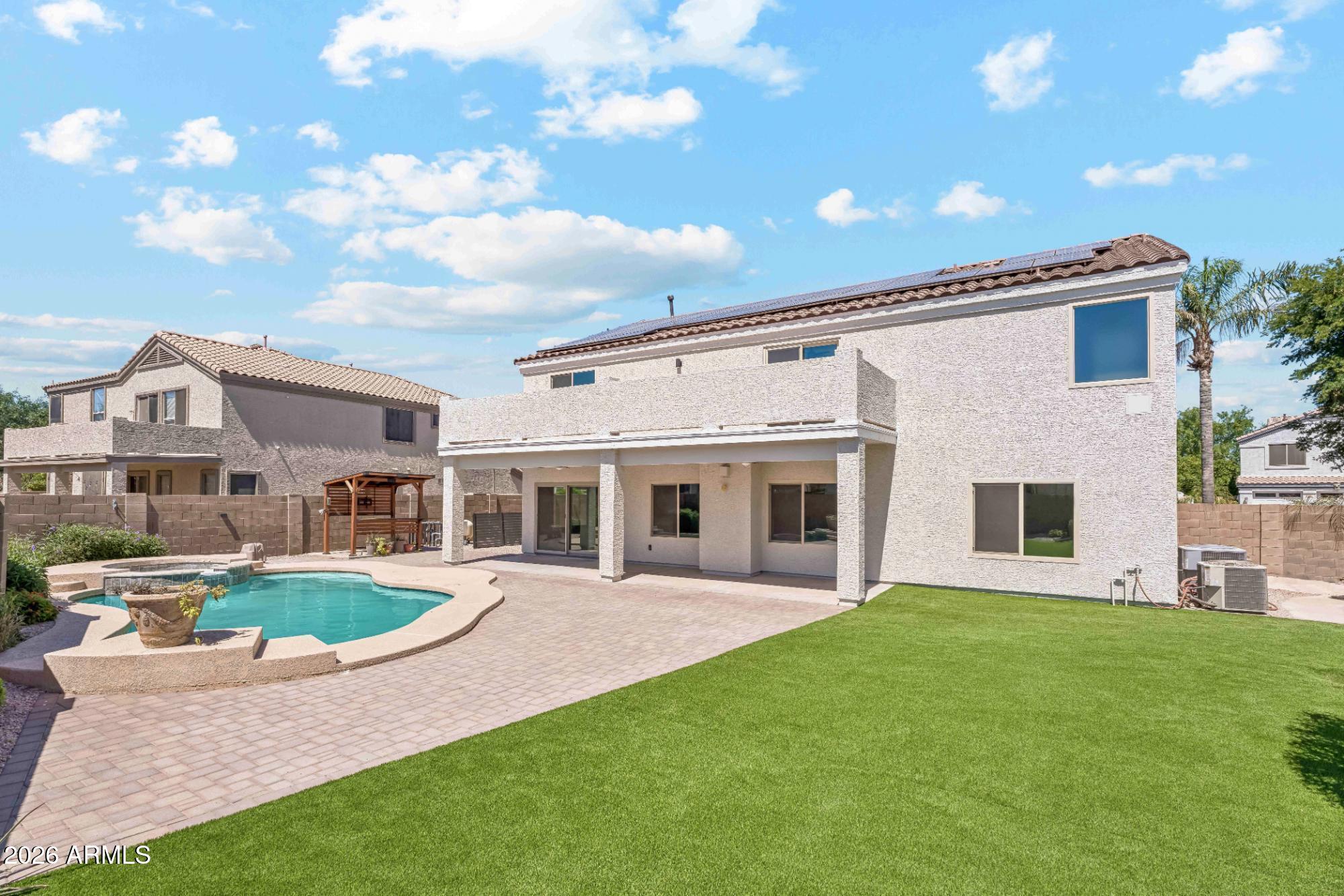A standout opportunity in Rancho Corona, this fully remodeled 5 bed, 3 bath home delivers 3,892 sqft of elevated living on a north/south facing interior lot with a private backyard setting. You're immediately greeted by a two-story foyer that creates a sense of scale and natural light. The home features a full renovation with new flooring, a beautifully updated kitchen with waterfall granite counters, new stainless appliances, refreshed bathrooms, all new windows, new roof, updated HVAC, water heater, and a freshly painted interior and exterior. The two-level layout offers incredible versatility with multiple gathering spaces, a loft, media and game rooms, or space for a private office; creating a home that adapts to your lifestyle. The backyard is built for Arizona living with a newly recoated heated pool & spa, lush turf, covered patio, and gazebo for effortless evenings! Located in a quiet community with parks, playgrounds, and walking paths. All within a short drive to a multitude of dining, shopping, and entertainment at the SanTan Village Mall. The home also includes owned solar panels. Come see it before it's gone!