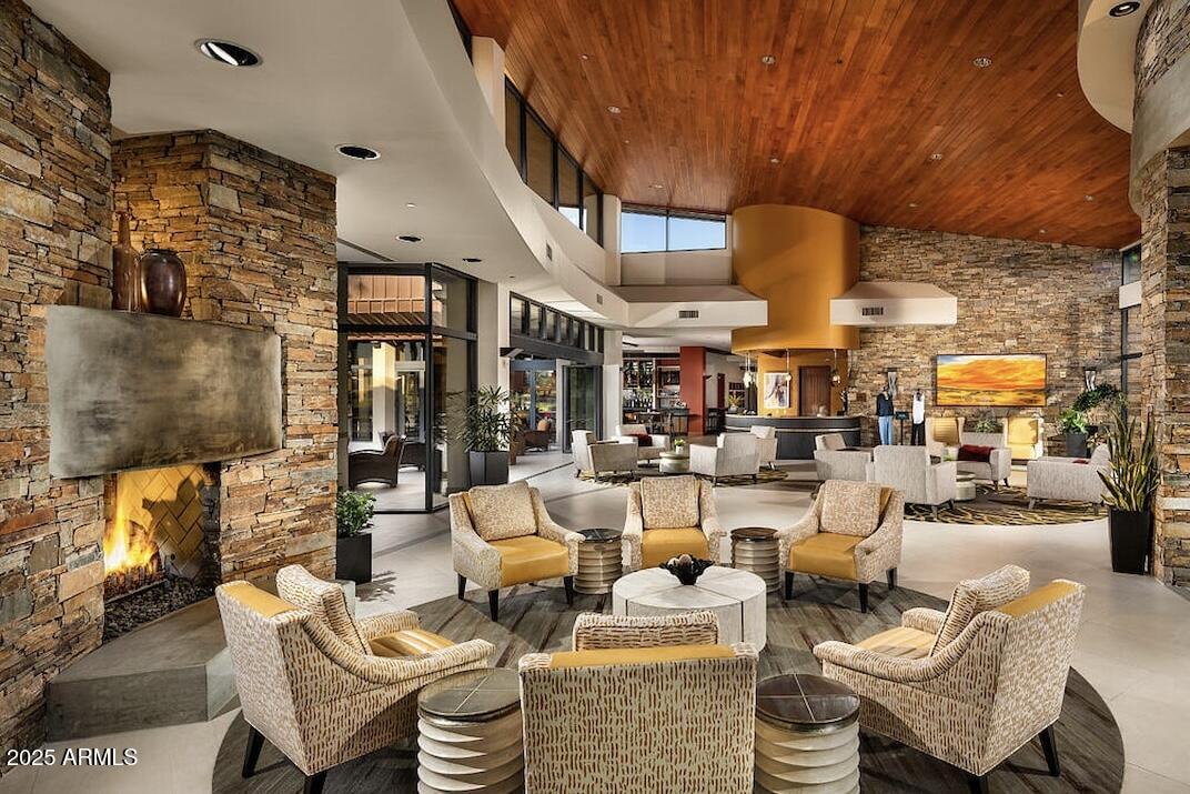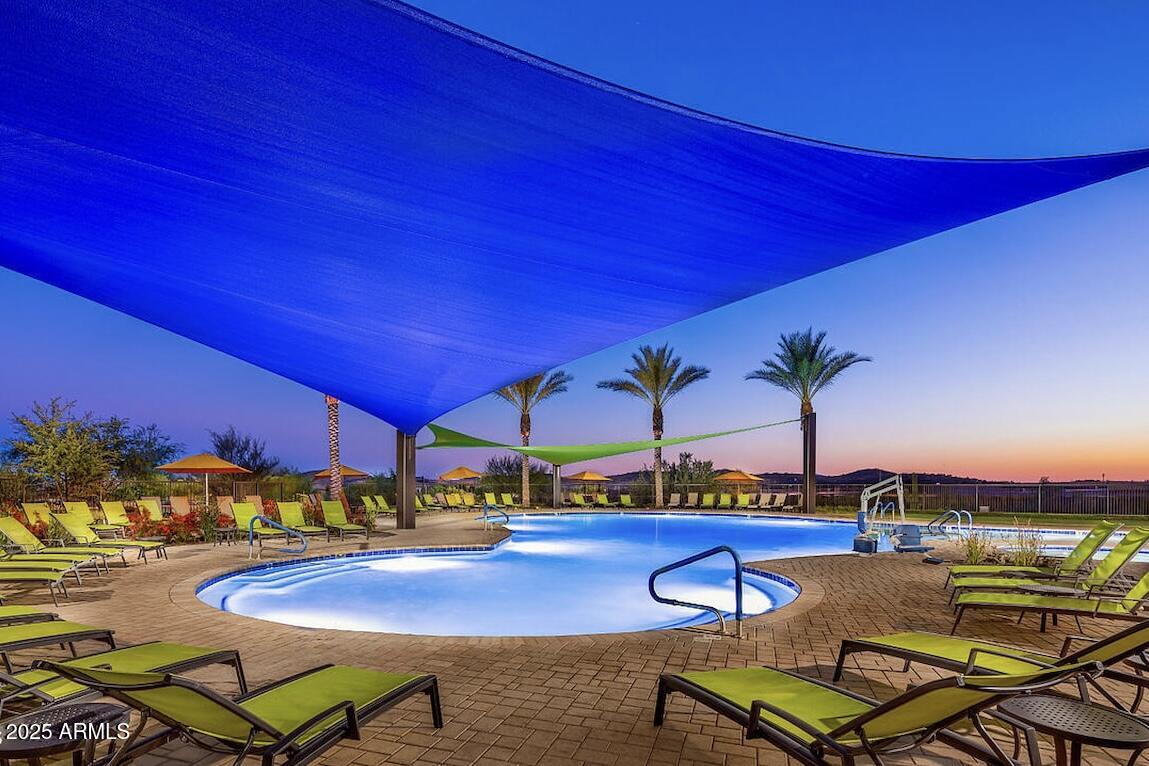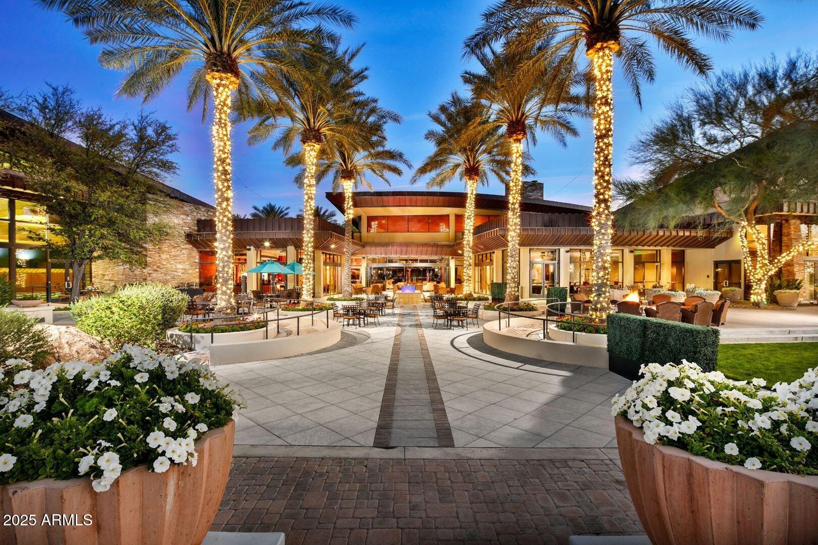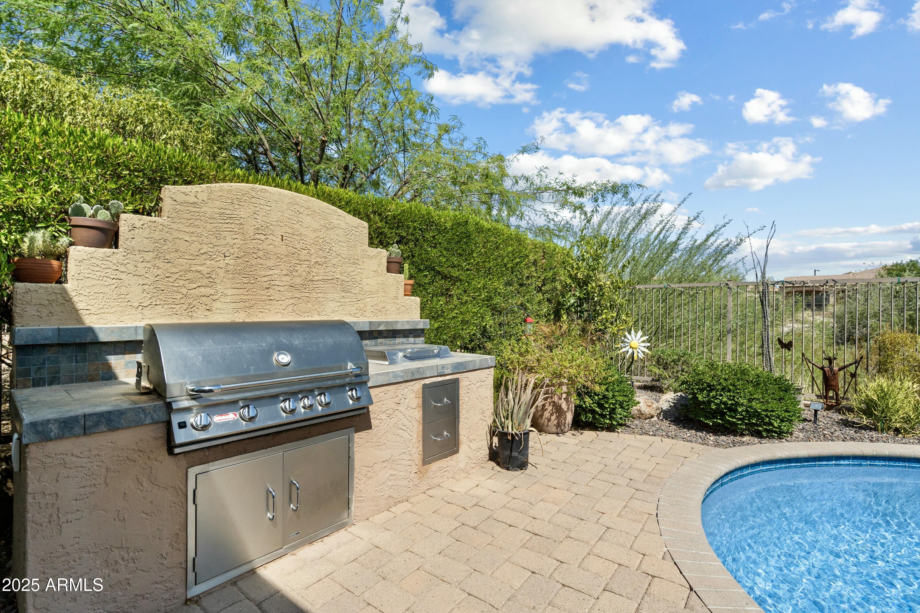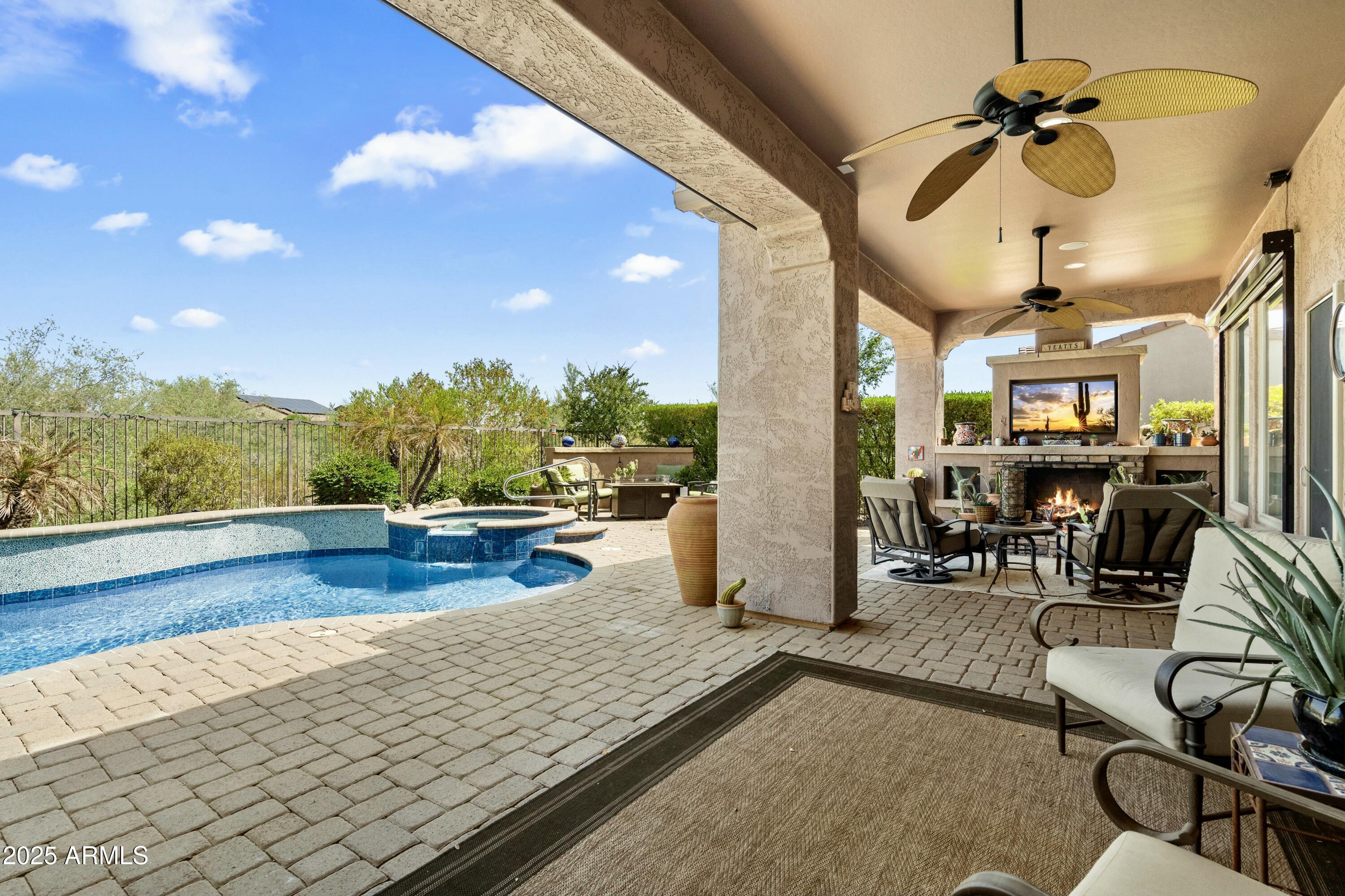 Spectacular Libertas floor plan backing pristine desert wash with a heated and cooled pool! Mature landscaping grace front and back yards with a luxurious cobblestone courtyard to welcome guests. The resort-style backyard boasts a fully equipped built-in BBQ, 400 sq ft of covered patio, an outdoor fireplace, ceiling fans & automatic sunshades. Designer travertine tile and rich hardwood flooring throughout. The gourmet kitchen features granite countertops with premium stainless-steel appliances. Custom plantation shutters accent every room for enhanced privacy and elegance. The temperature-controlled garage features high-end epoxy floors with a pop-out for extra storage & workstation. Enjoy living in a 55+ resort-style community with championship golf and country club amenities! OUTDOOR PARADISE: