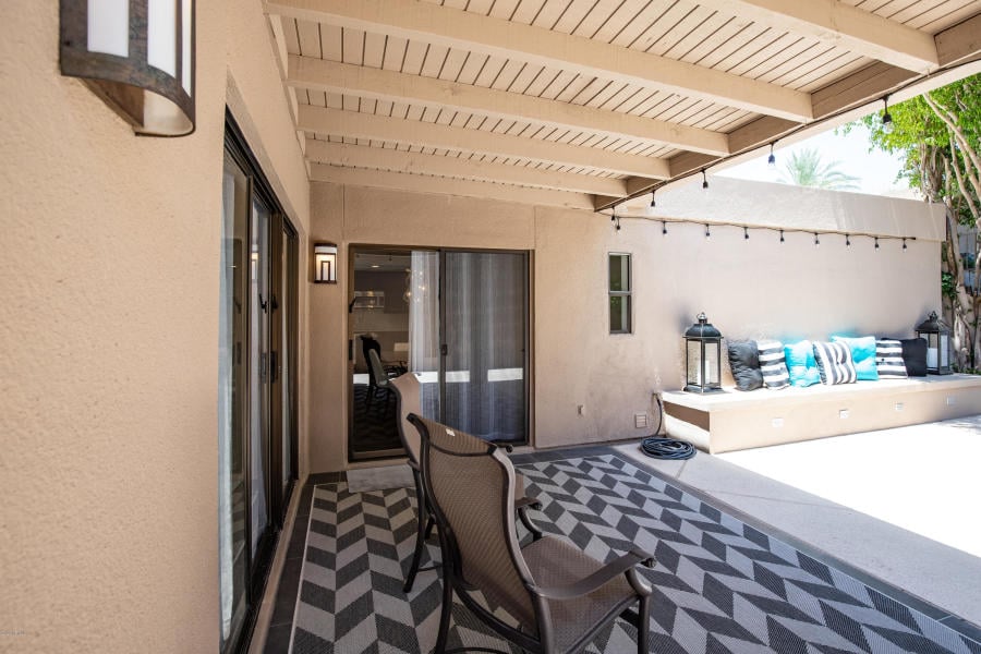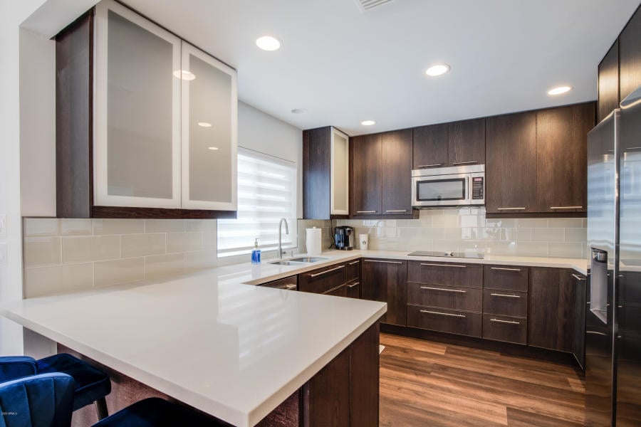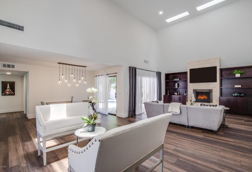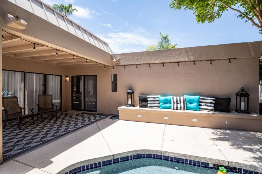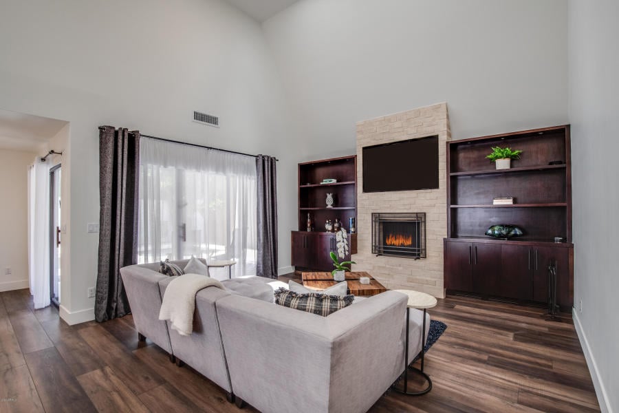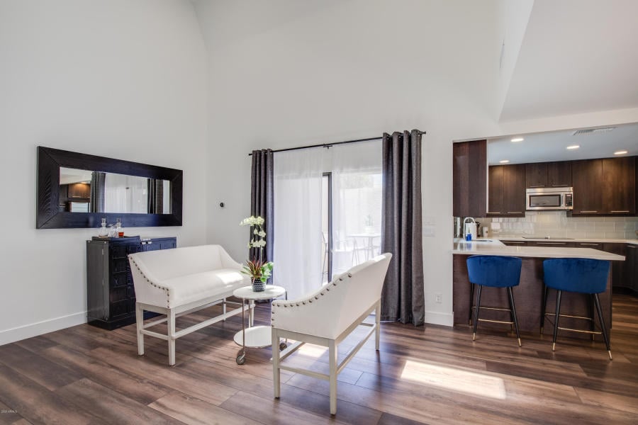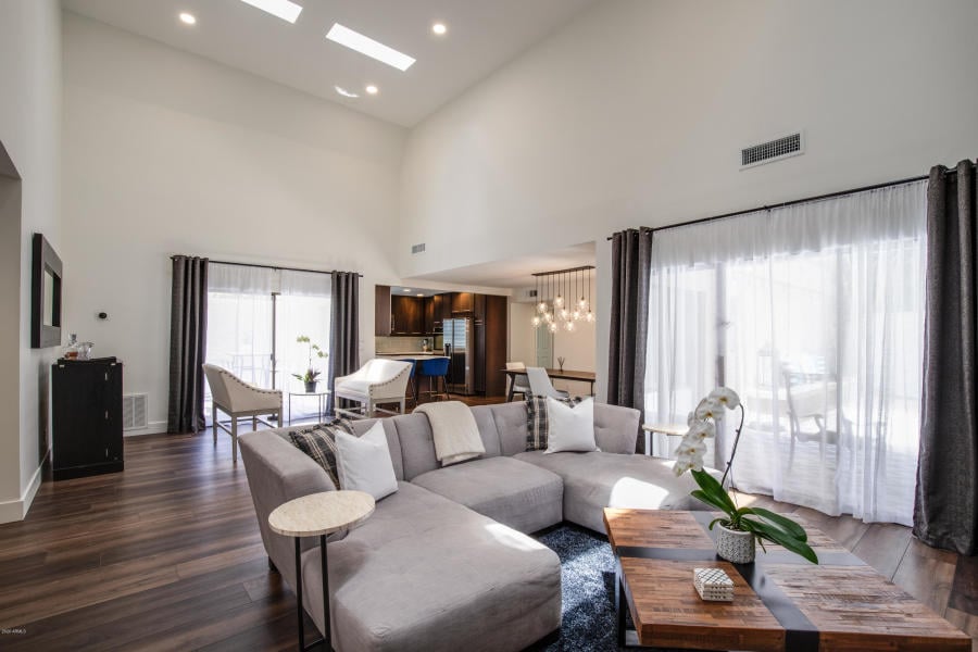 This contemporary dream is located in the guard-gated community of Colony Biltmore! With soaring, vaulted ceilings, beautiful wood plank flooring, and modern finishes throughout, this home is sure to impress! The kitchen showcases clean lines through custom cabinetry, sleek tile backsplash, quartz countertops, and stainless Samsung appliances. The open living concept is perfect for hosting and entertaining guests. Low maintenance backyard features a spacious covered patio and splash pool. You cannot beat this prime location just minutes from Biltmore Fashion Park and downtown Phoenix.
