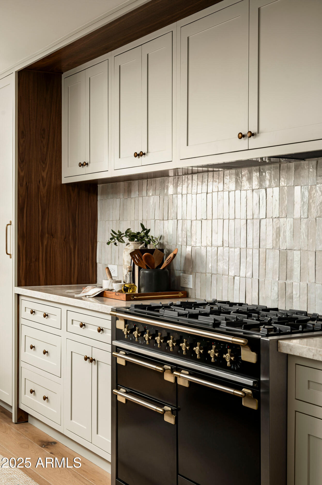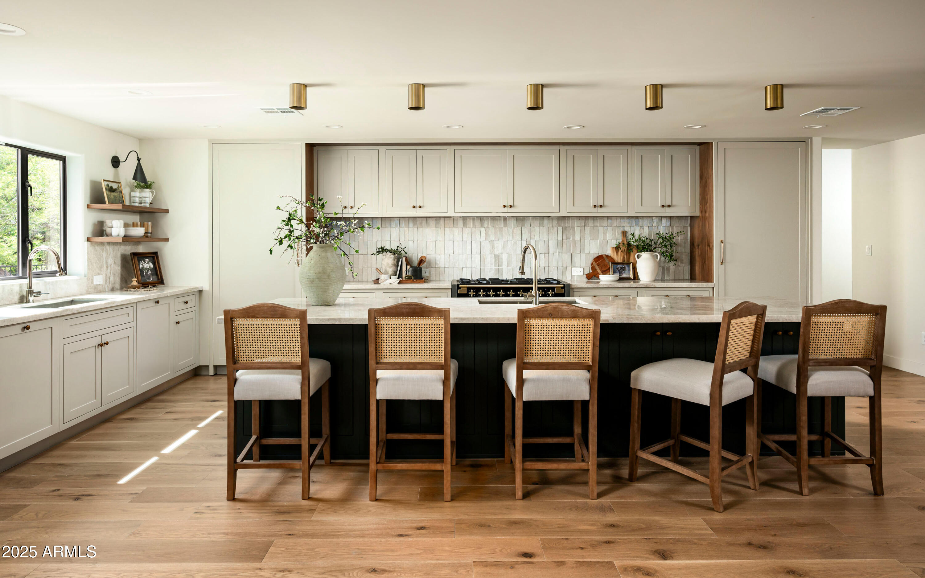 At the heart of the home, the chef's kitchen is a showstopper. Designed for both entertaining and everyday living. It boasts a massive 13-foot island with seating for six, integrated panel appliances, two dishwashers, two sinks, subzero fridge and freezer, hand-crafted tile backsplash, custom cabinetry with walnut trim, quartzite counter, propane AGA dual fuel stove, and statement lighting that radiates warmth and sophistication.