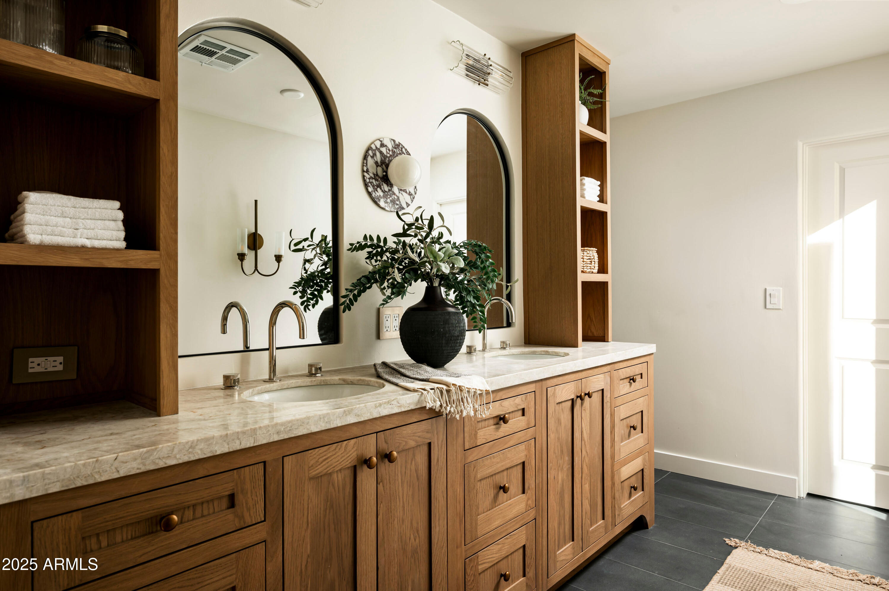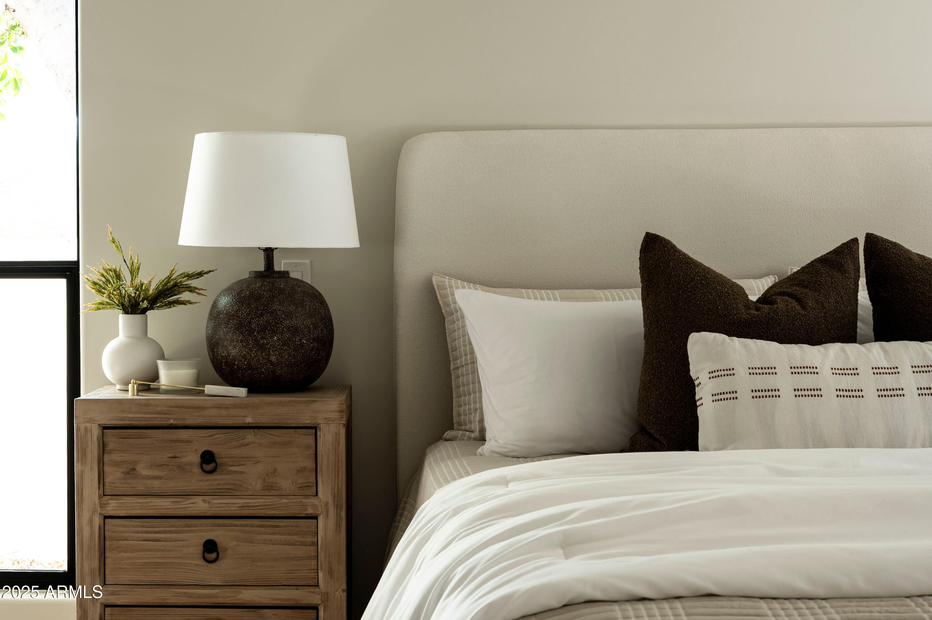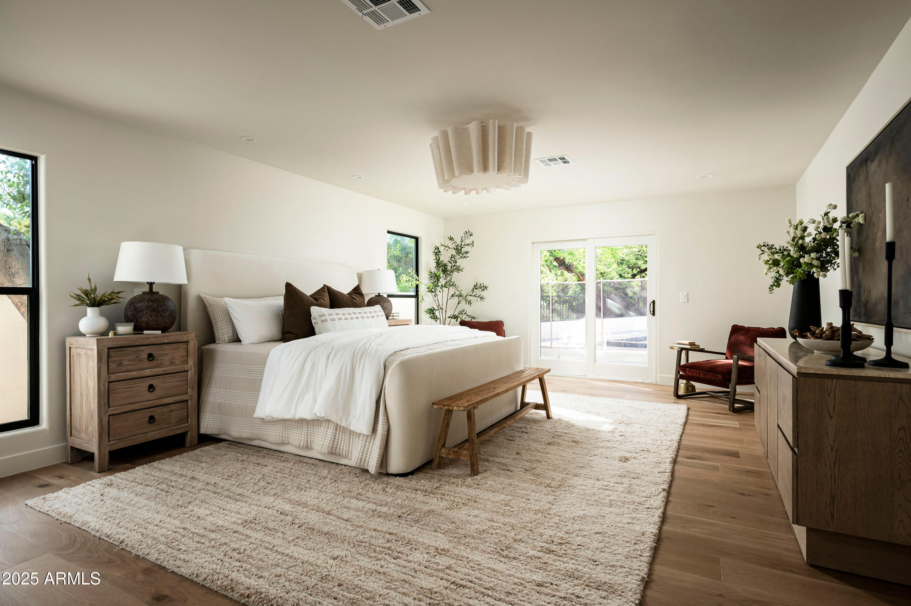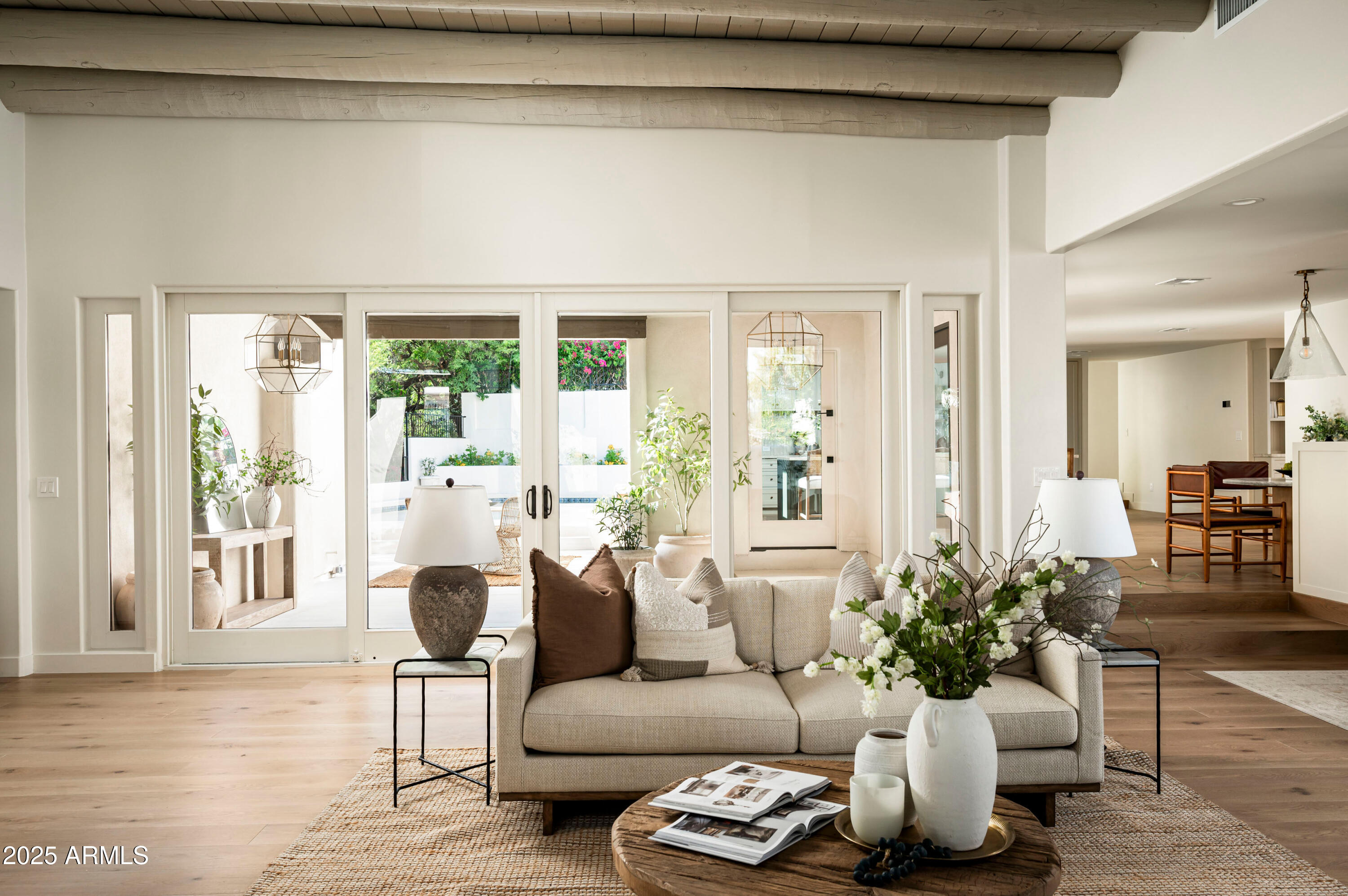 Located on an oversized lot at the end of a cul-de-sac, the lushly surrounded backyard is anchored by a sparkling dive pool and hot tub and thoughtfully designed for both relaxation and entertaining. Surrounded by privacy walls and mature greenery from the wash, this outdoor space is the perfect extension of the home's serene, sophisticated aesthetic.