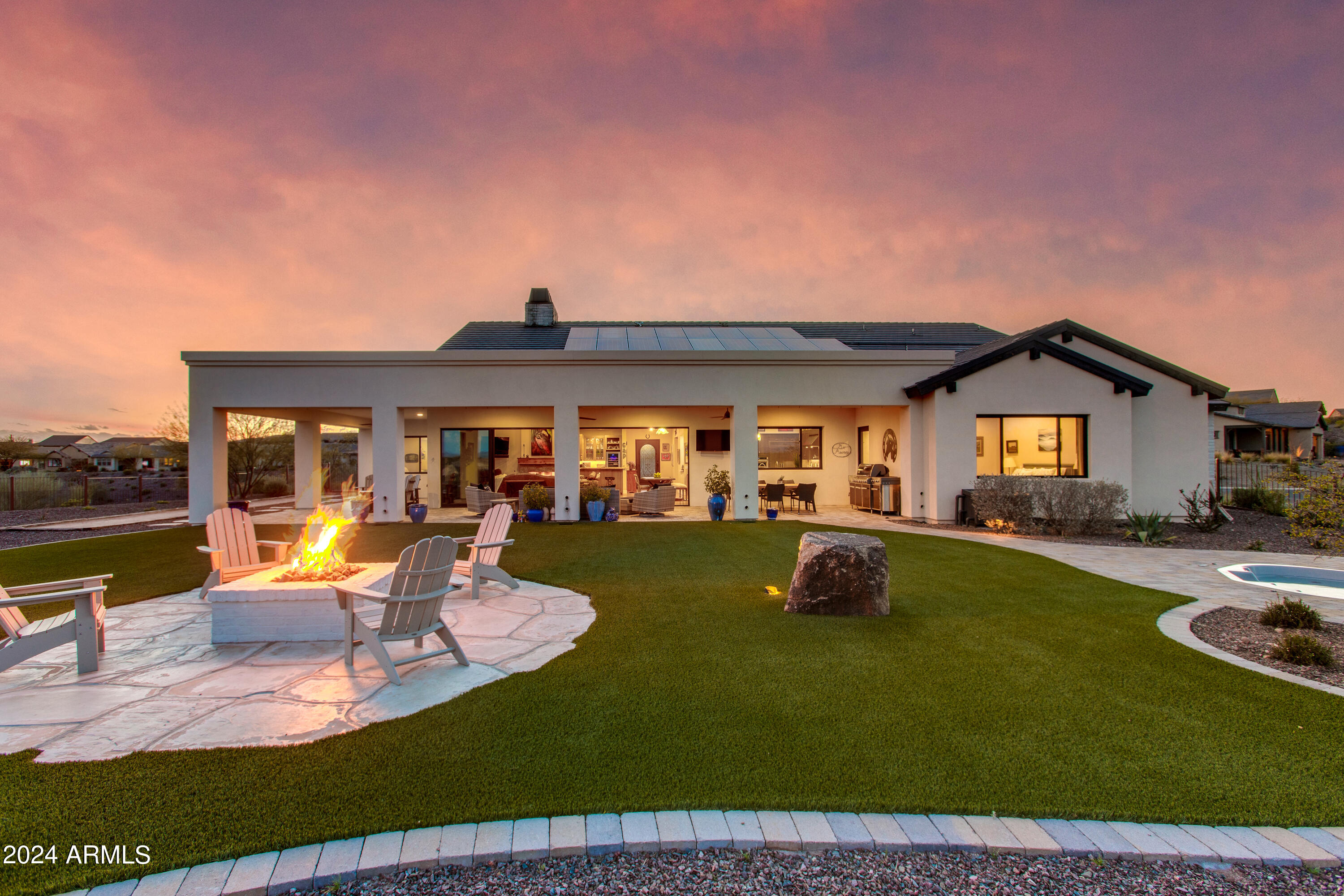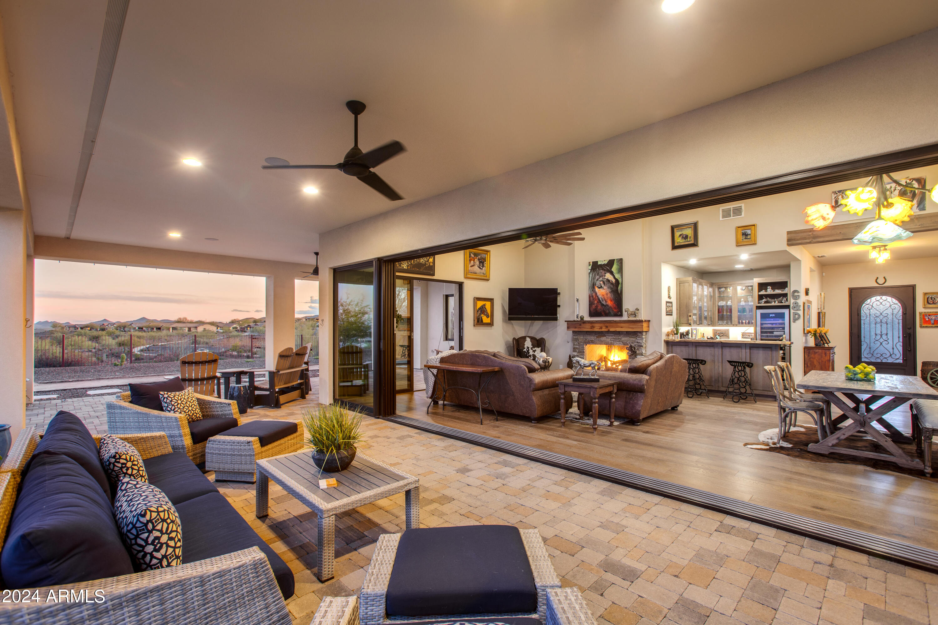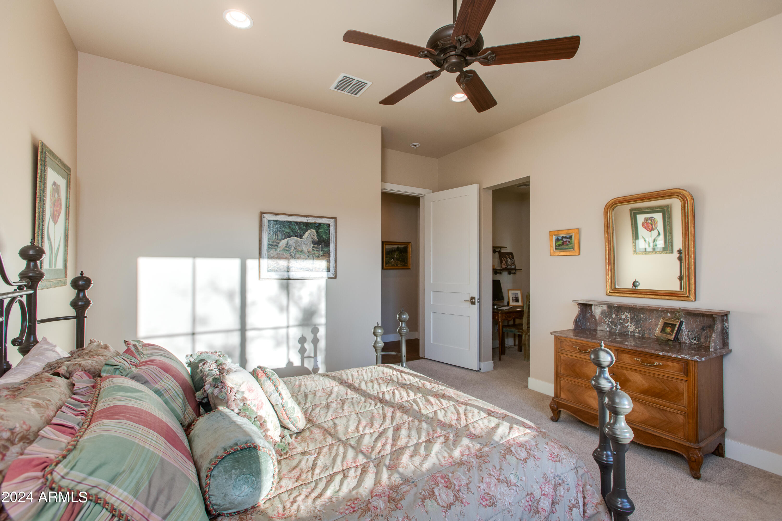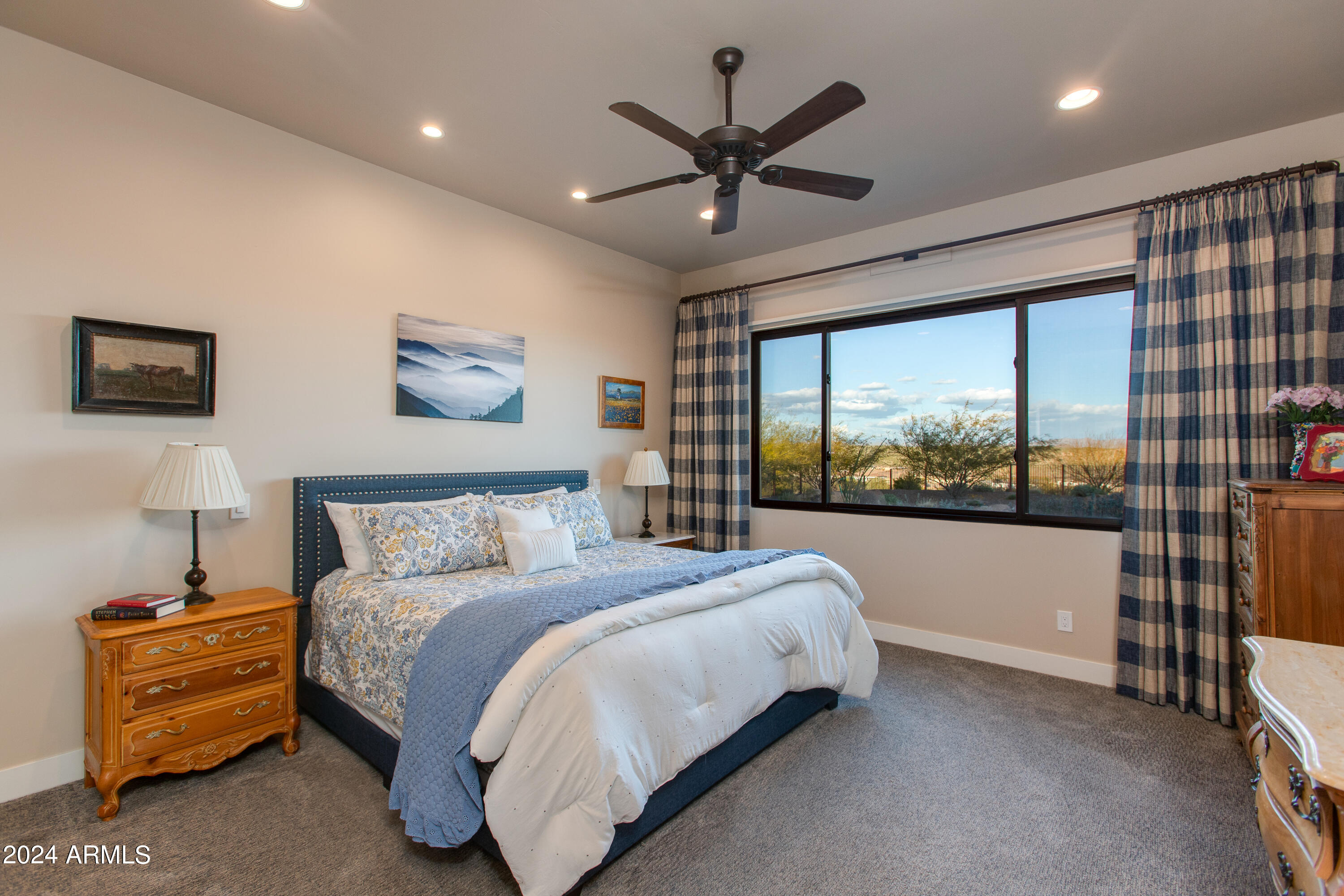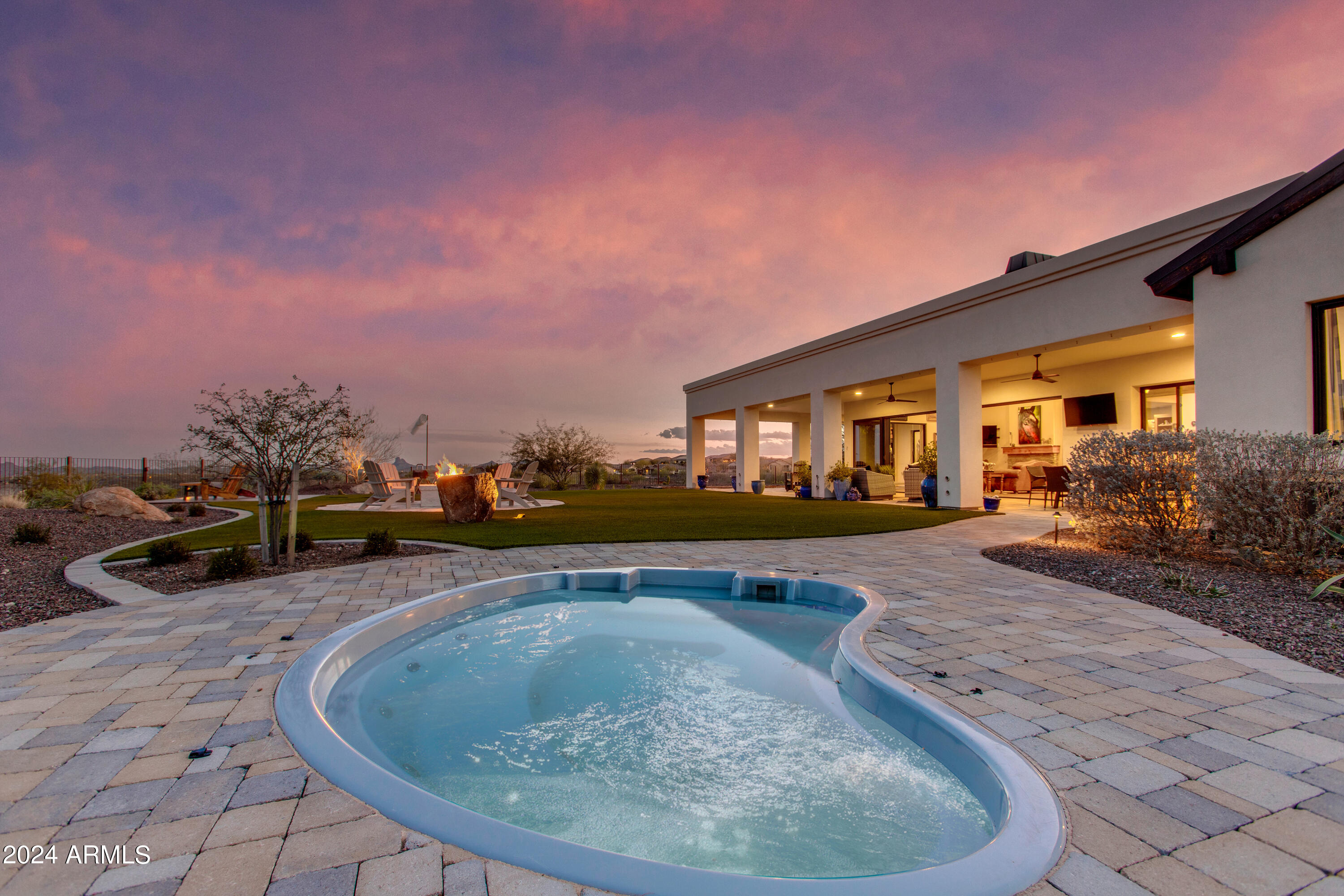 Give yourself the BEST WR has to offer. Enjoy 3/4 of an acre w/private panoramic views from every window. This one of a kind Scott Edmunds home is hosted on the largest homesite in WR. Spacious 3 bedroom 3.5 bath with Den. The Grand Living Room features gorgeous vaulted ceilings with beams and a built-in fireplace. Generous natural light with dramatic sliding walls of glass seamlessly blending your indoor and outdoor living spaces. Gourmet kitchen boast bountiful kitchen cabinets with builtin Wolf & Kitchenaid appliances. Gas cooktop includes a pot filler with custom decorative tile with under cabinet lighting. Kitchen island/breakfast bar houses built in microwave, separate prep sink with its own garbage disposal, builtin trash and recycling. Custom storage throughout. Primary Ensuite leads to a heavy glass shower enclosure with 4 shower heads walk-in with 2 entries coming from 2 separate water closets. Guest suites separated from Primary. Both ensuite with walk-in closets. Amazing backyard with multiple sitting/entertaining locations fully enclosed wrought iron fence with additional pest guard to keep out desert friends. Generous astro turf surrounds a large builtin gas fire pit with ample space for seating. In ground salt free hot tub, custom fountain & rock feature, bocce ball court, large covered patio with high pressure builtin misting system, Whole home Solar connects with EV charger. This is a MUST SEE. There is truly nothing in the community to compare.