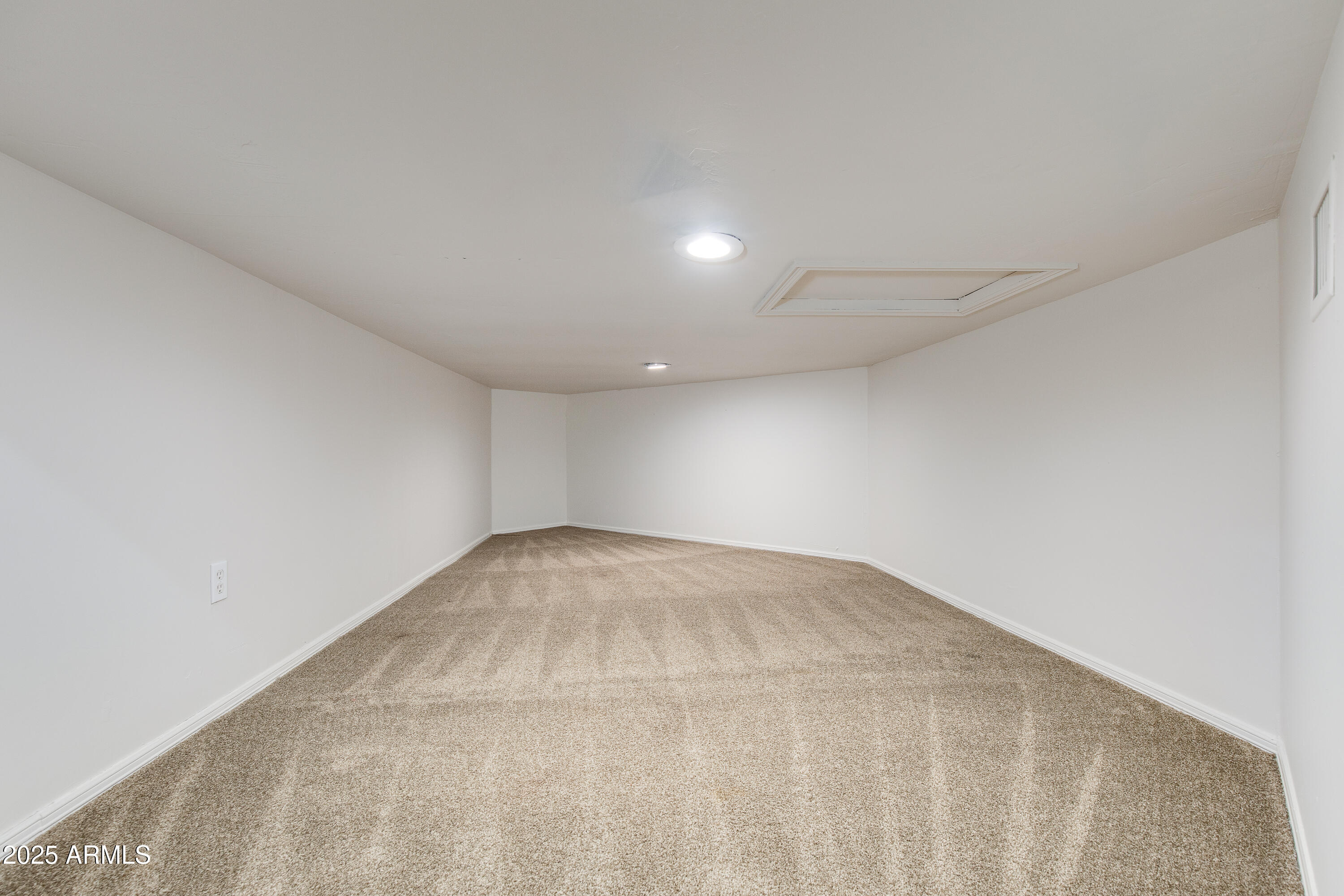 The primary suite, tucked conveniently on the main level, offers a spa-style bath featuring a jetted soaking tub, glass-enclosed shower, dual vanities, and an oversized walk-in closet. One of the secondary bedrooms includes attic access that could serve as a hidden playroom or creative storage space.