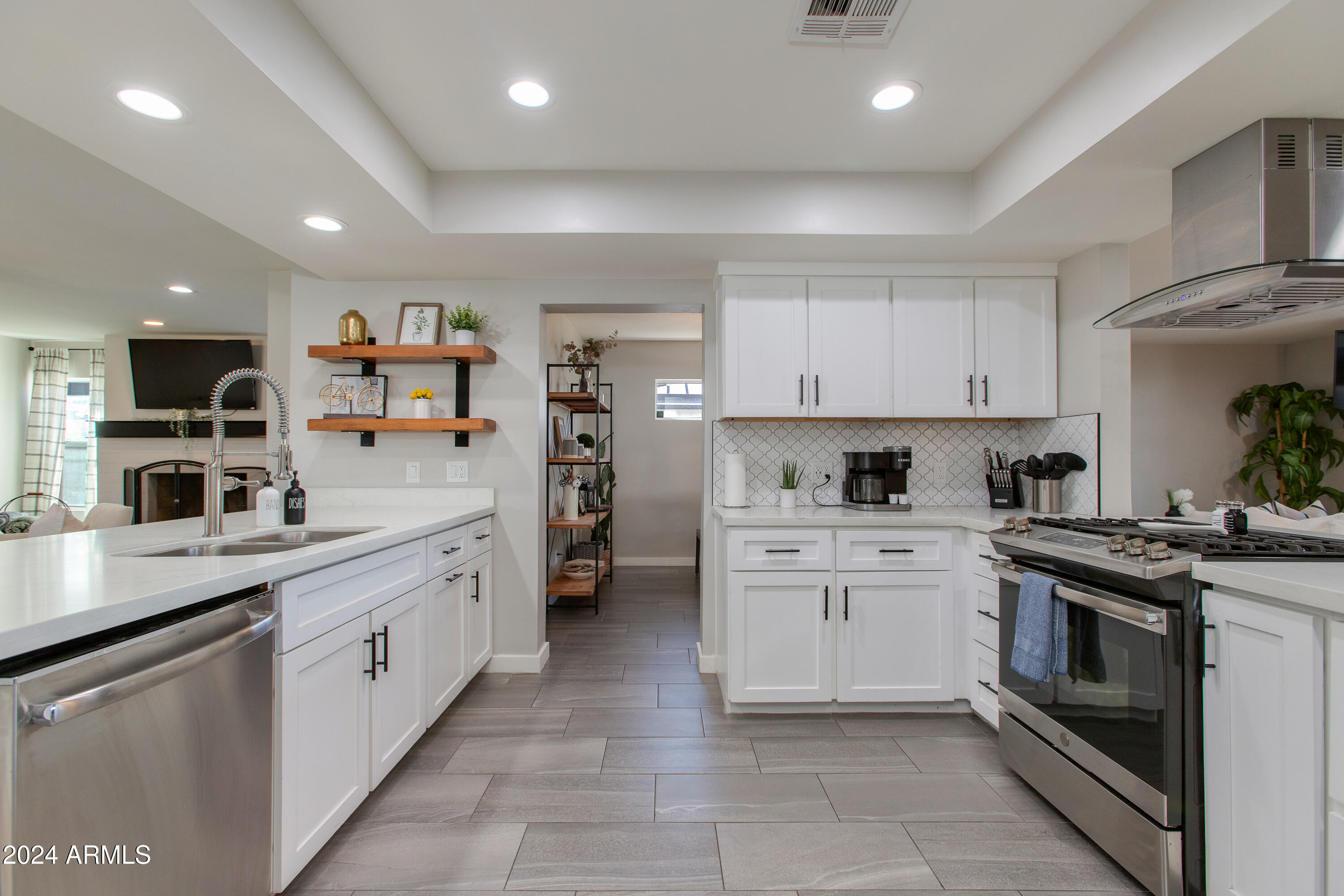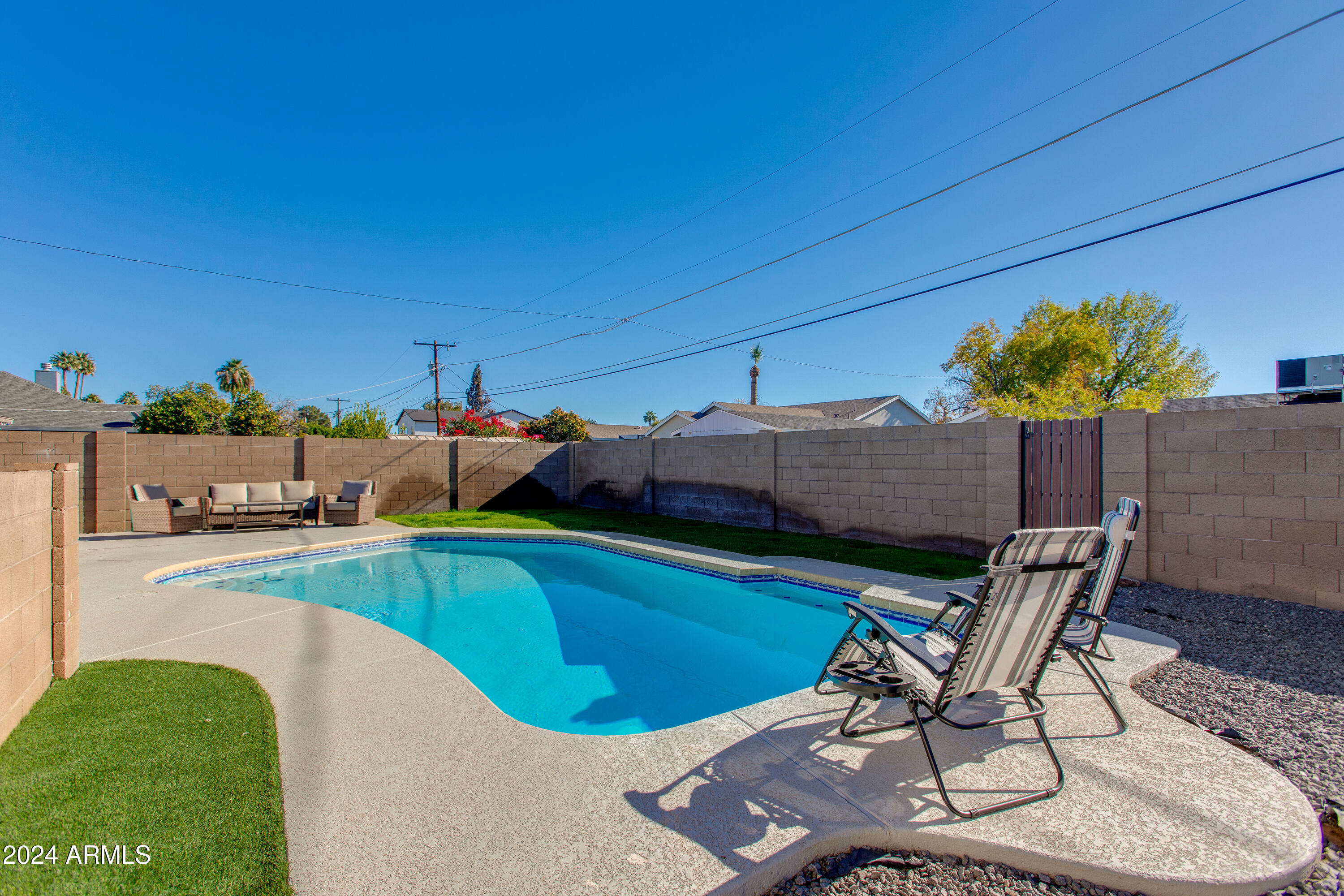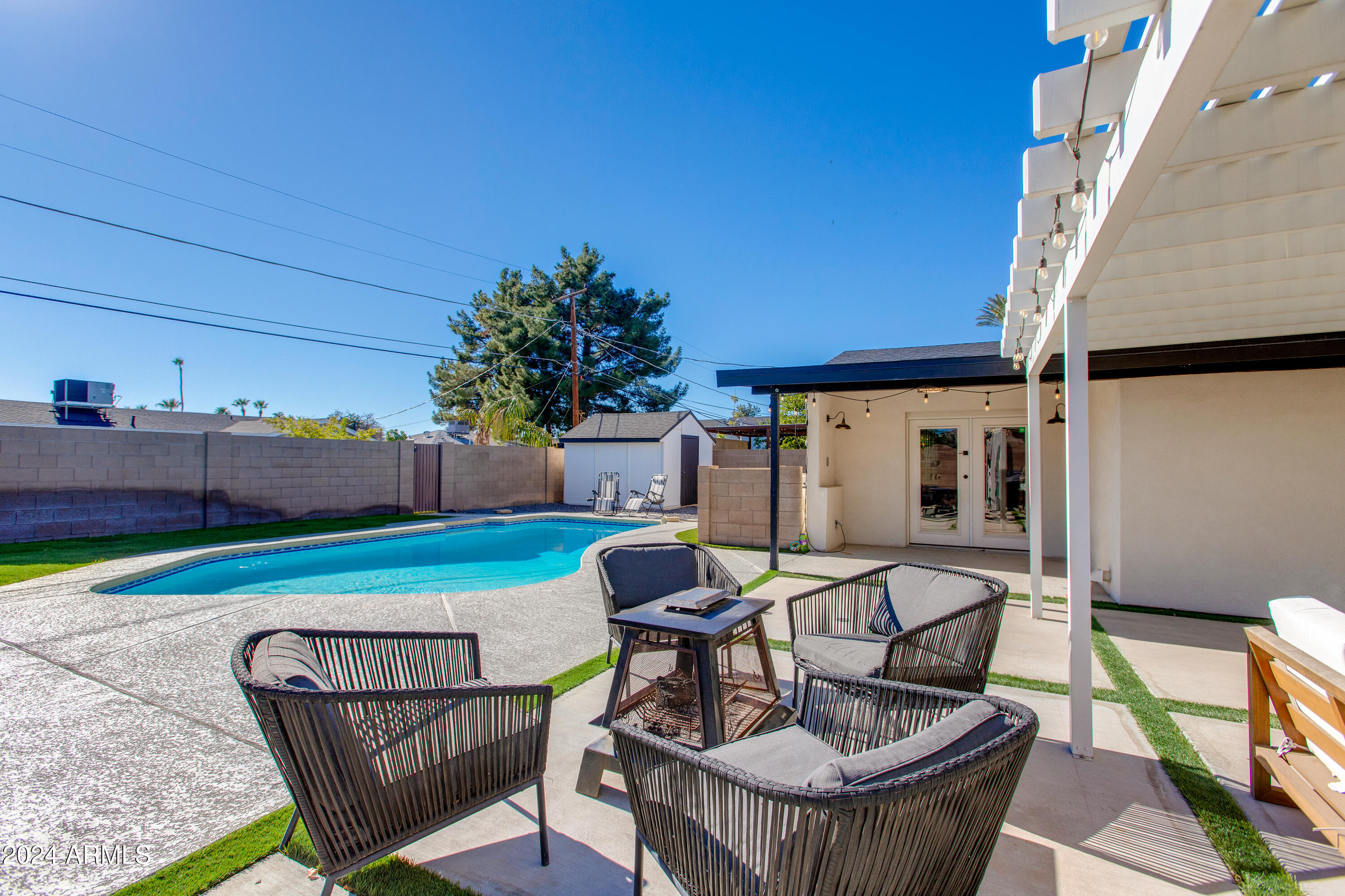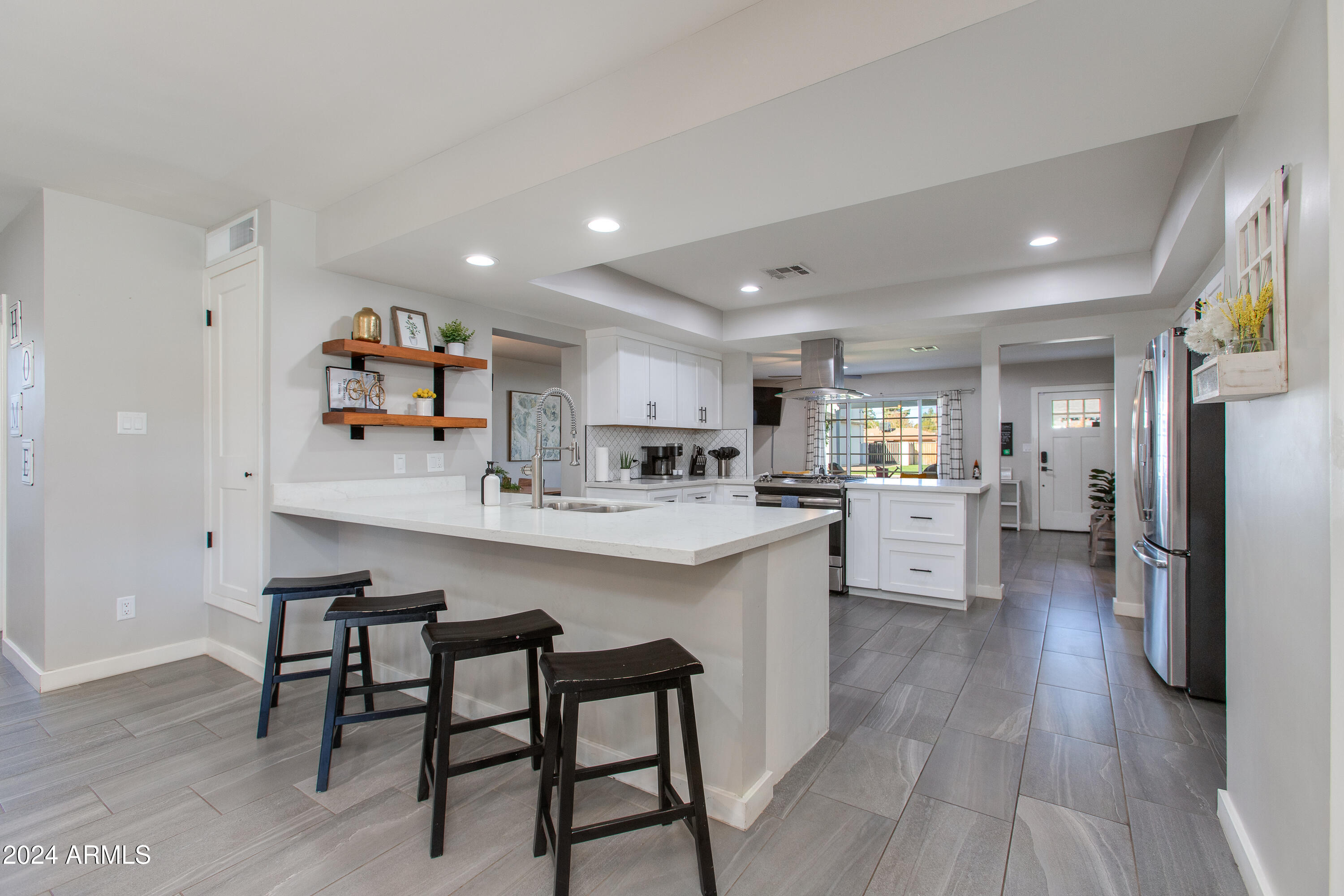 Delightful 3 bed, 2.5 bath charmer in the heart of Arcadia Lite! Remodeled in 2019, this home features an open floor plan with a cozy yet modern vibe. At the center of it is a modern kitchen with white shaker cabinets, quartz countertops, stainless steel appliances, a wine fridge, and two breakfast bars perfect for gatherings. Two inviting living rooms and a dining room complete the open concept living space. The primary suite features a spacious walk-in closet, double vanity, built-in Bluetooth speakers, and private access to the backyard. The spacious backyard offers a heated pool, covered outdoor entertainment area and low-maintenance landscaping. Surrounded by million dollar properties, this turn-key home is located just down the street from the best restaurants and shopping in town!