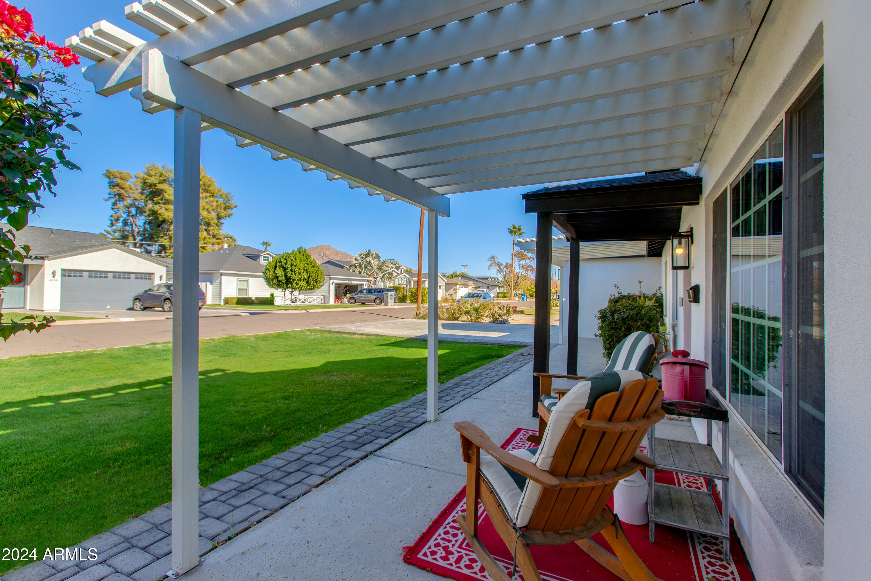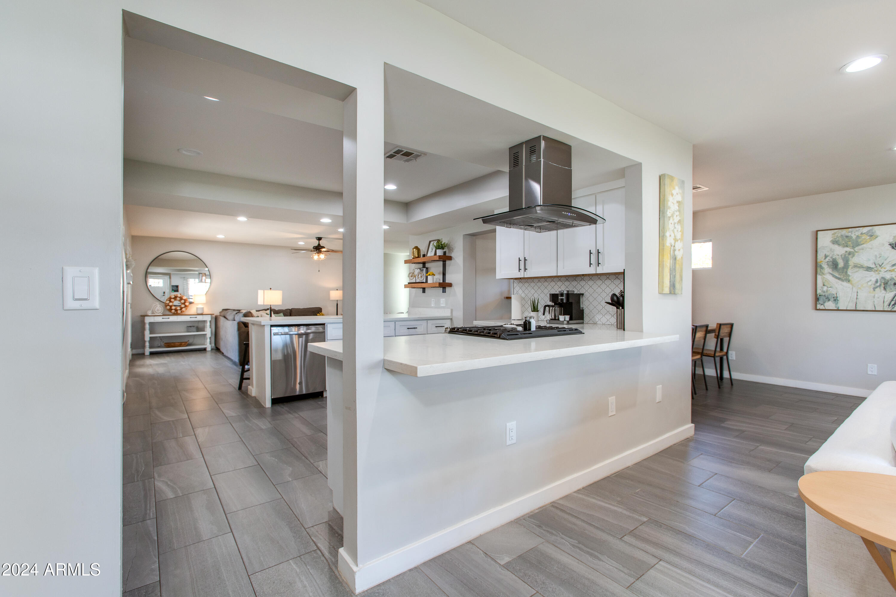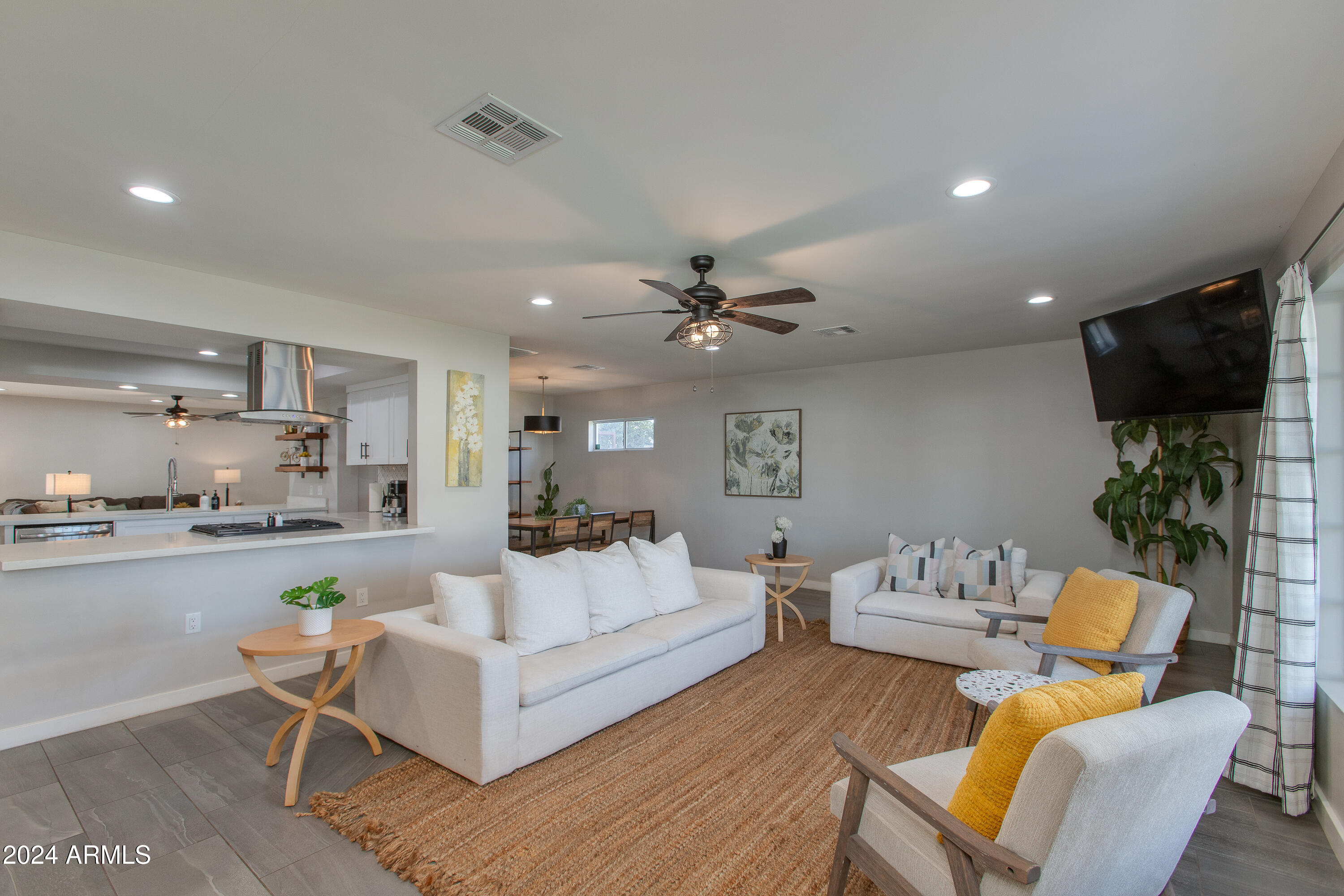 Delightful 3 bed, 2.5 bath charmer in the heart of Arcadia Lite! Remodeled in 2019, this home features an open floor plan with a cozy yet modern vibe. At the center of it is a modern kitchen with white shaker cabinets, quartz countertops, stainless steel appliances, a wine fridge, and two breakfast bars perfect for gatherings. Two inviting living rooms and a dining room complete the open concept living space. The primary suite features a spacious walk-in closet, double vanity, built-in Bluetooth speakers, and private access to the backyard. The spacious backyard offers a heated pool, covered outdoor entertainment area and low-maintenance landscaping. Surrounded by million dollar properties, this turn-key home is located just down the street from the best restaurants and shopping in town!