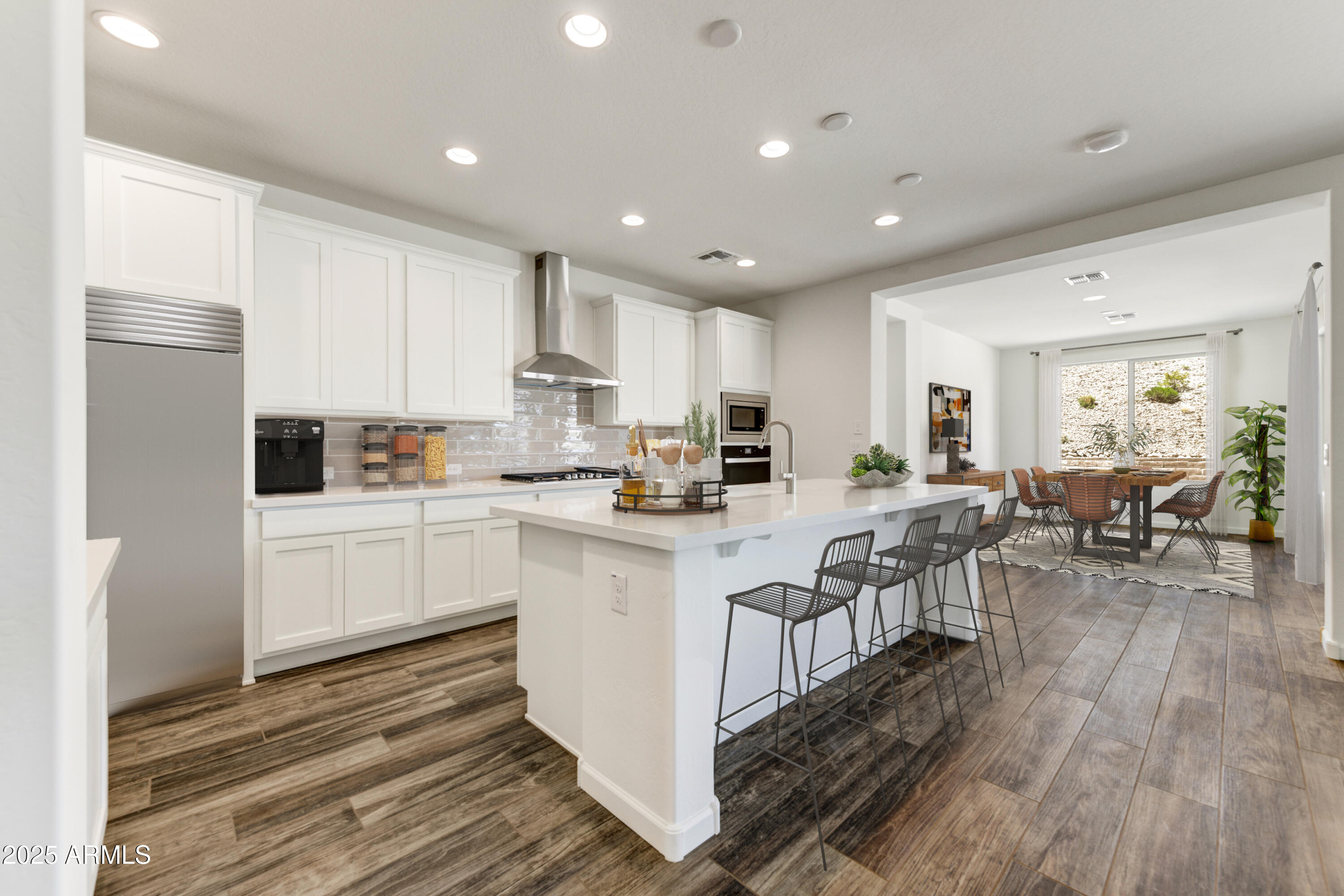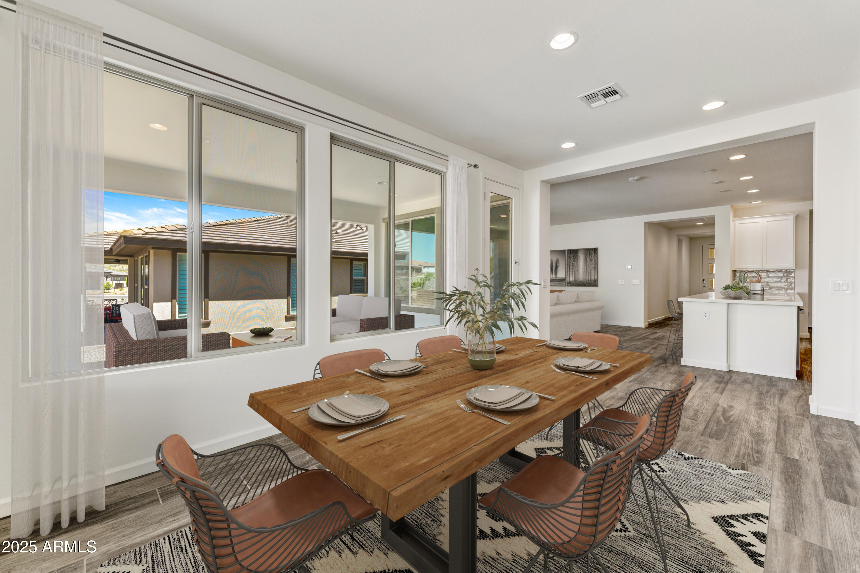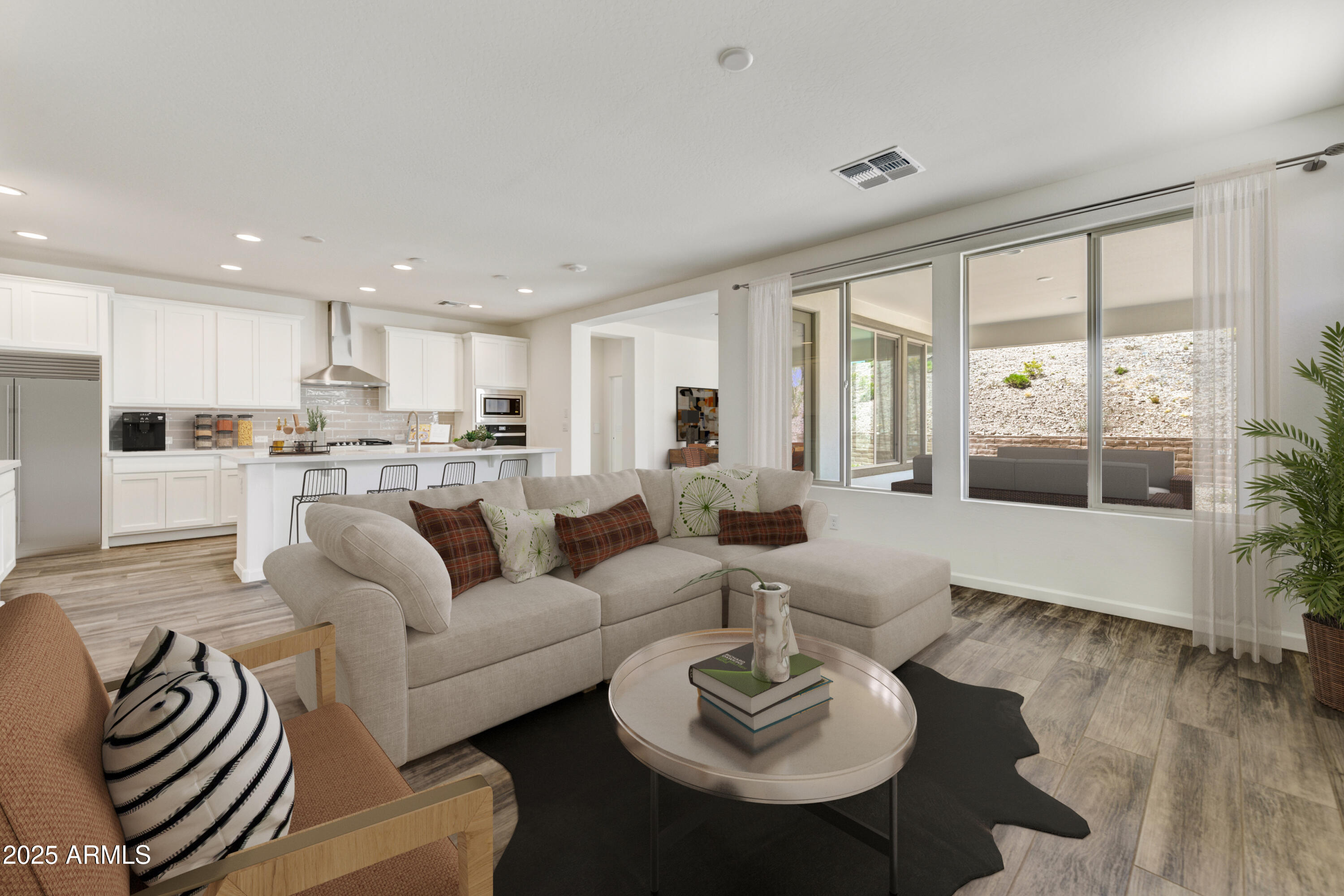 Located in the Palomino neighborhood at Wickenburg Ranch, this ''Nice'' plan offers approx. 1,945 sq. ft. with 2 beds, 2 baths, & a versatile den optioned as a 3rd bedroom. The open design showcases Coconut Matte cabinetry with convenience package roll-outs, quartz countertops, & built-in Whirlpool appliance suite. Expanded dining, Blanco farmhouse sink, LED under-cabinet lighting, & custom backsplash bring style to the kitchen. The primary suite includes an upgraded shower with heavy glass, chrome finishes, & cultured marble vanities. Flooring upgrades, two-tone details, & designer fixtures add a polished touch. Outdoors, enjoy custom landscaping, Belgard pavers, a gas stub for BBQ, & a golf cart garage for extra storage. Resort-style perfection.