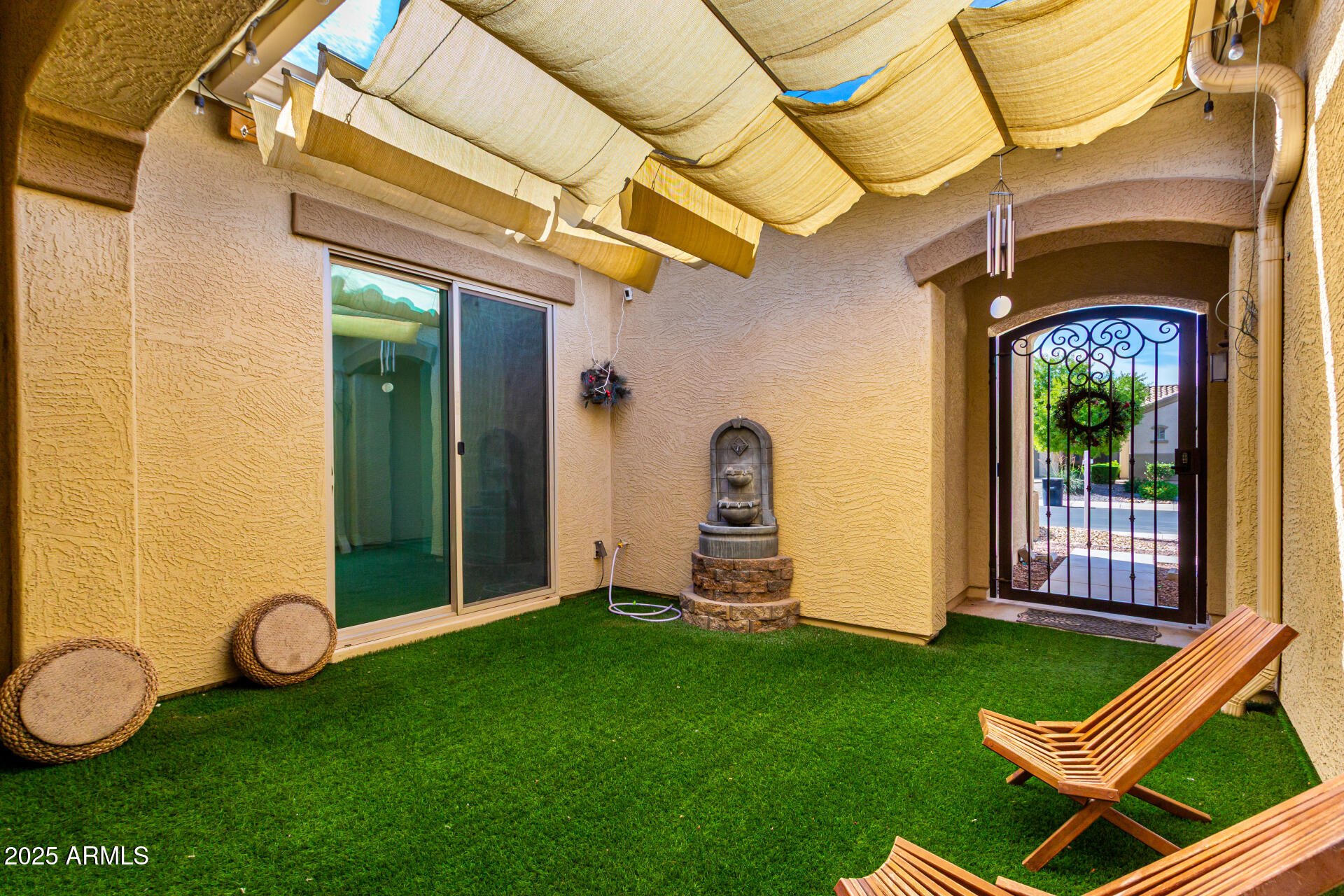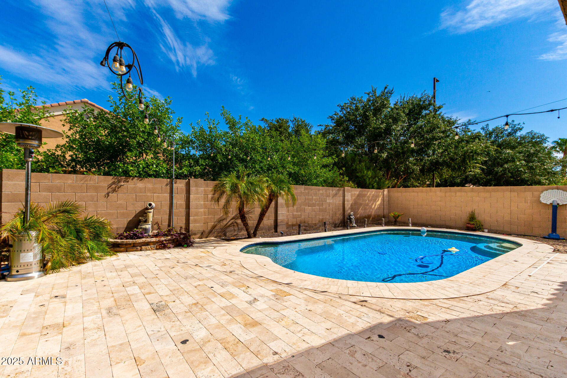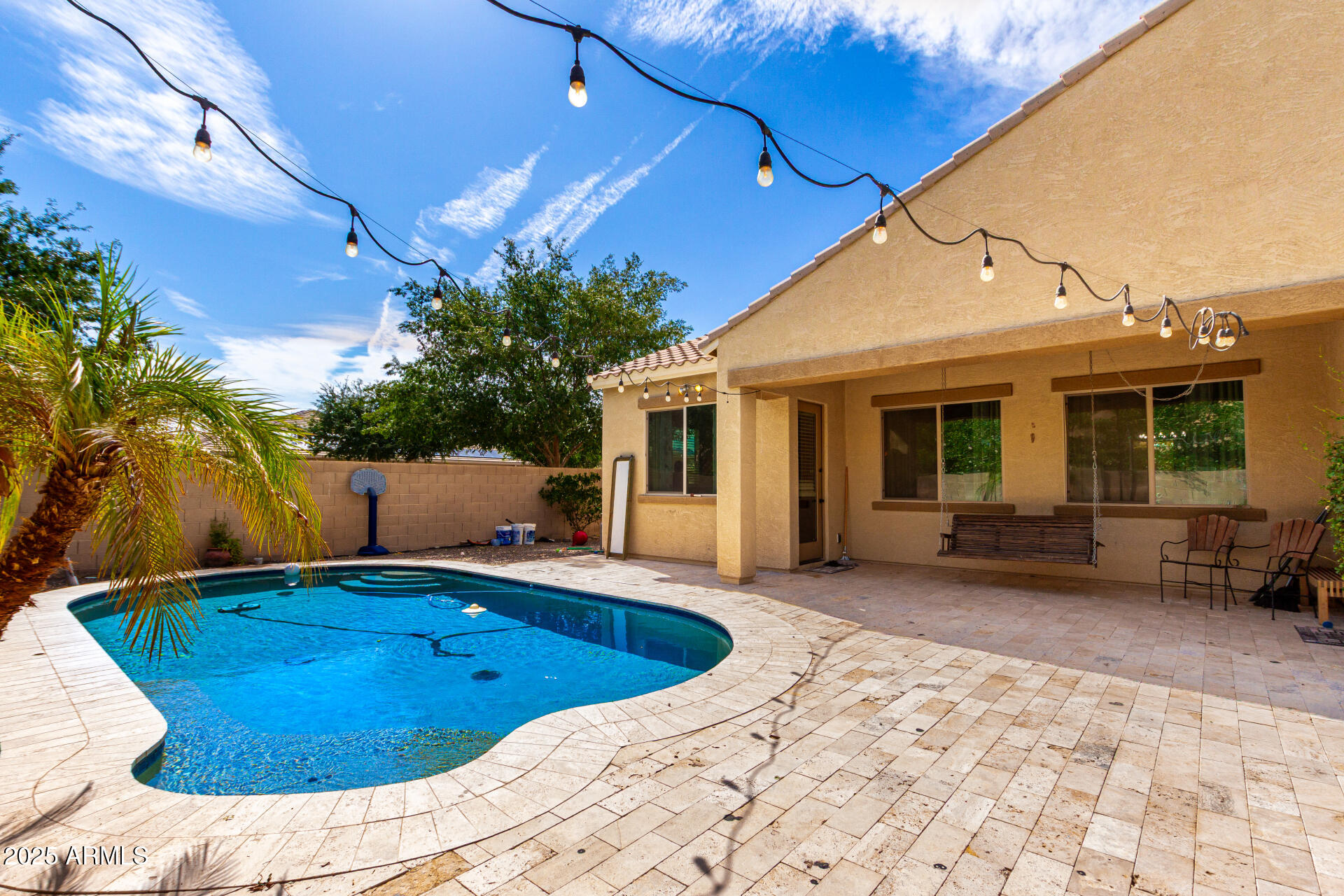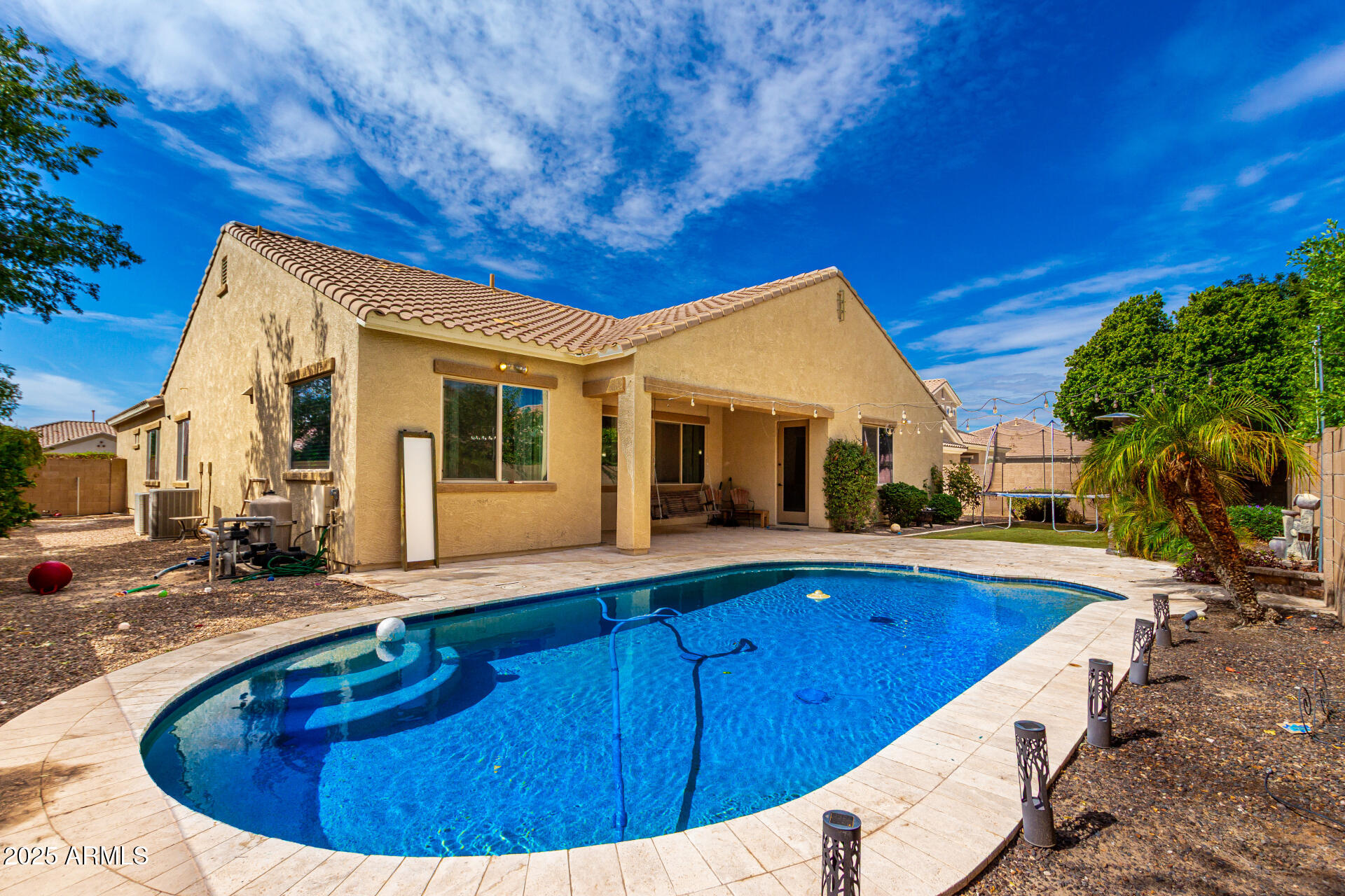 Experience the perfect blend of comfort and elegance in this beautifully designed home! Situated on a desirable corner lot, it displays a 3-car garage, an RV gate, and a gated courtyard. Inside, discover a living room, a versatile den with French doors, a bonus room, and a harmonious great room bathed in natural light. Thoughtful details include inviting foyer, tile flooring, ceiling fans, neutral palette, and stylish light fixtures. Open-concept kitchen is a cook's delight, fully equipped with glossy stainless steel appliances, tile backsplash, a pantry, ample cabinets adorned with crown molding, granite counters, recessed & pendant lighting, and a prep island with a breakfast bar. Serene main retreat impresses with plush carpet, direct outdoor access, and an ensuite with two vanities. Continue to your backyard oasis, where you'll find a covered patio and sparkling pool, excellent for year-round enjoyment and entertaining. Don't miss it!