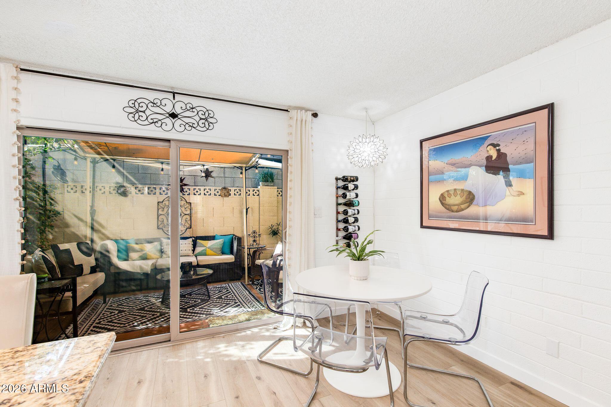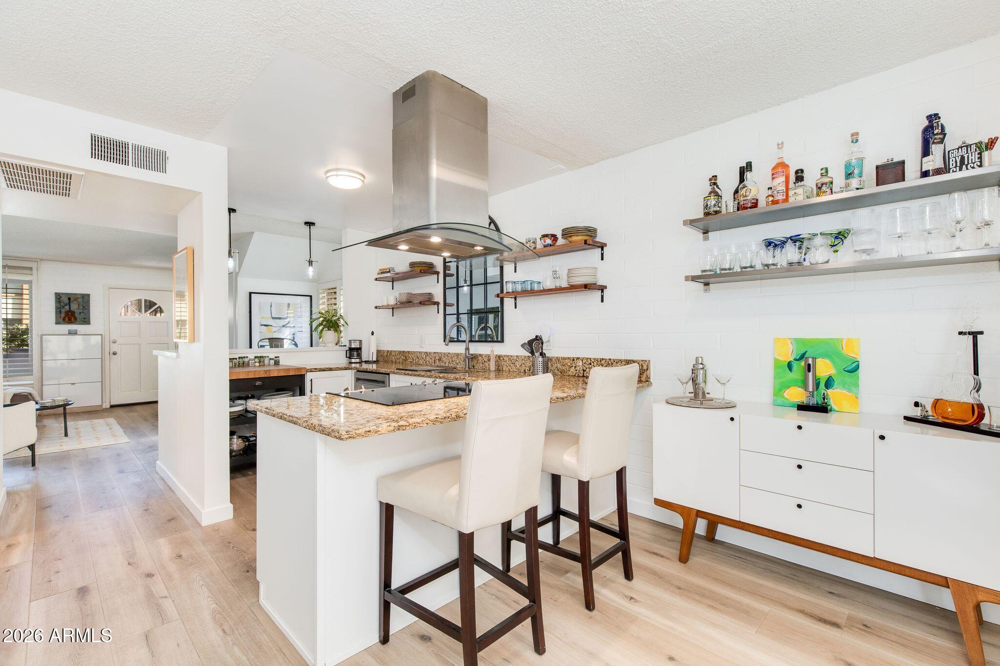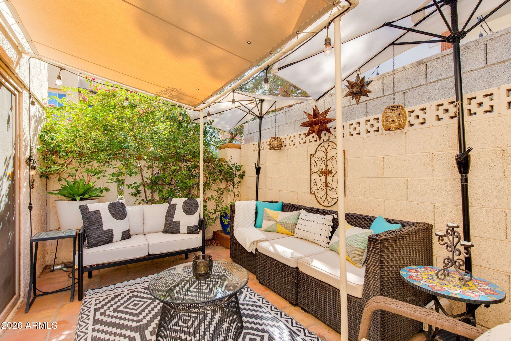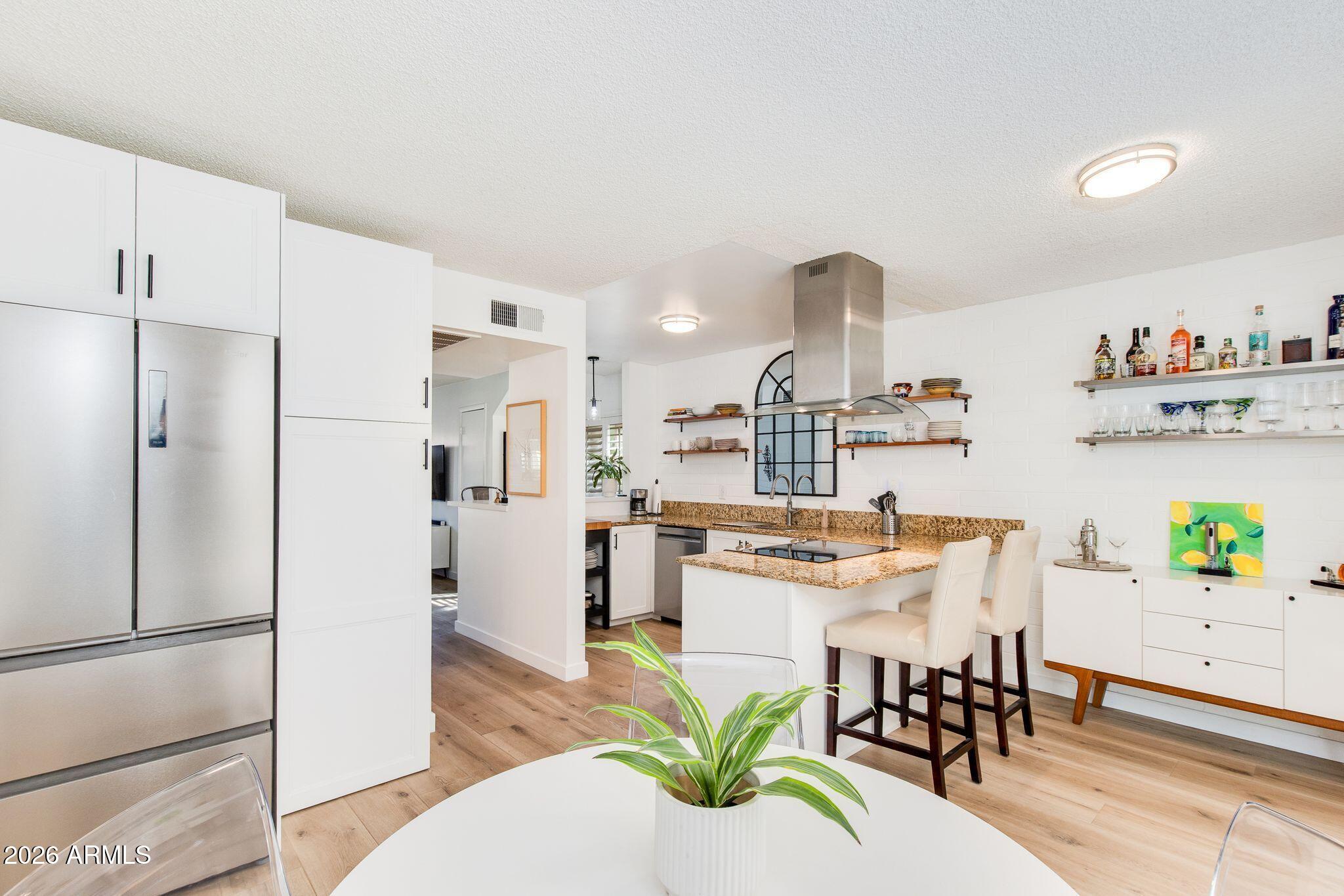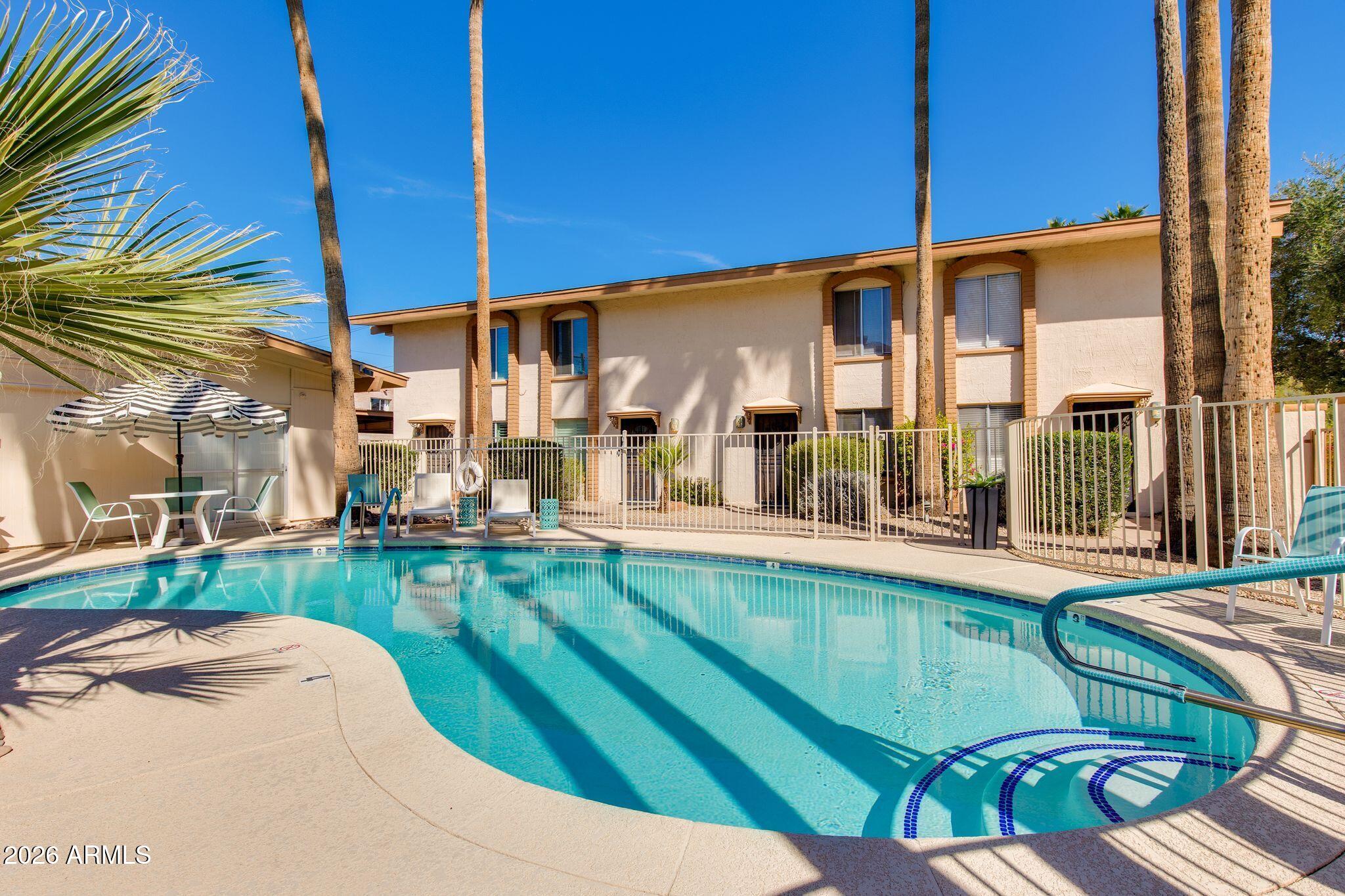 Rare opportunity in the heart of Old Town Scottsdale! Meticulously updated end unit townhome is just off the canal and walking distance to Fashion Square, Historic Old Town, Arts District and Entertainment District - offering a diverse world class dining scene all within walking distance from your new home. This beautiful two bedroom property features a thoughtfully redesigned kitchen with stainless steel appliances, granite countertops, custom open shelving, built in refrigerator and two breakfast bars. The bright open-concept layout is designed for entertaining, seamlessly connecting the kitchen, dining, and living areas. Upstairs, a remodeled full bathroom separates the two bedrooms, offering ideal privacy and functionality. Enjoy a stunning private patio perfect for relaxing or entertaining, and a prime location within the community that is just steps from the pool. Other features include: Dedicated covered parking, guest parking, Community Bike Room, Private Storage Unit, meticulous community laundry room shared by a few units. In-unit laundry and can be added if desired.