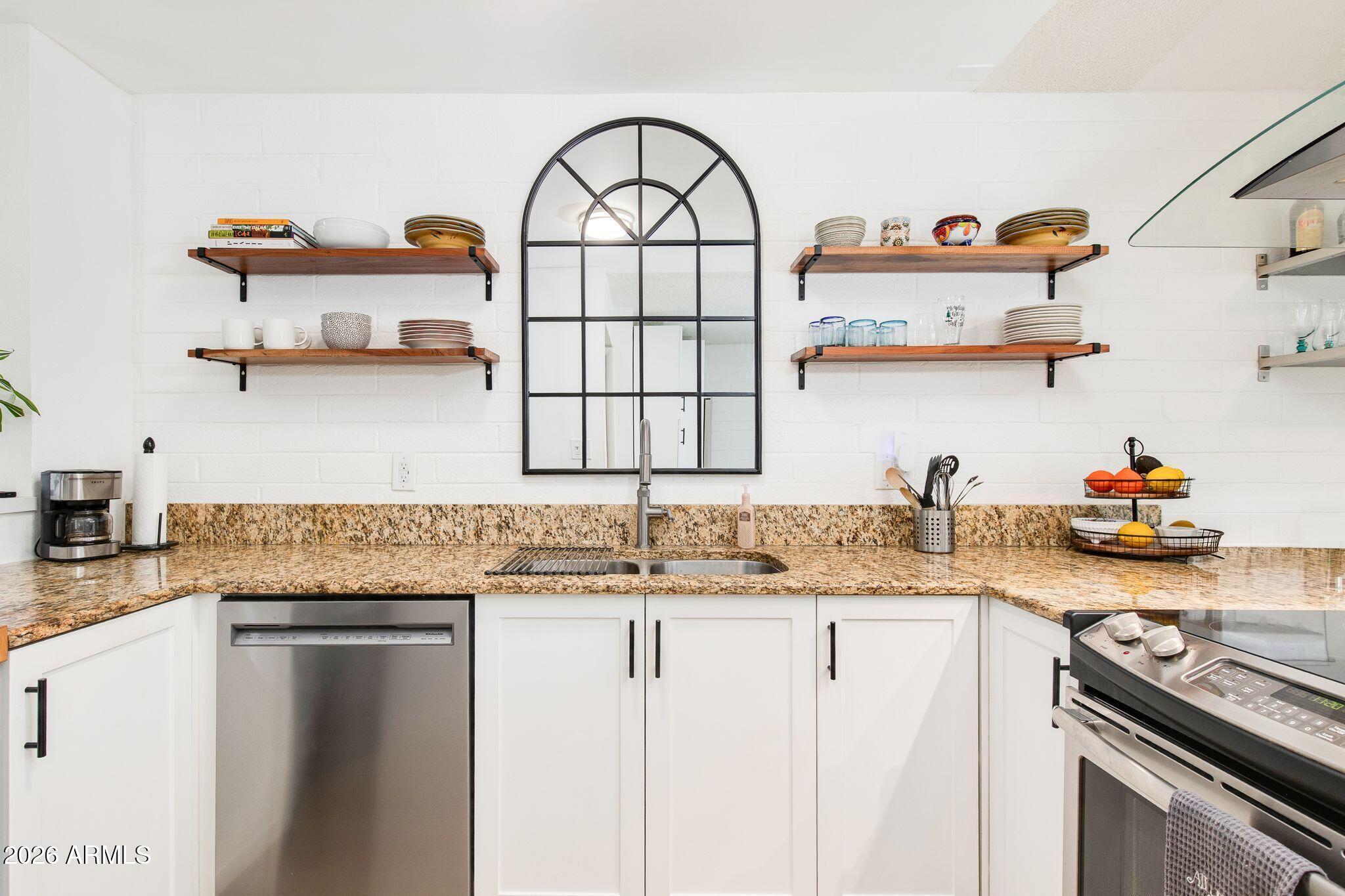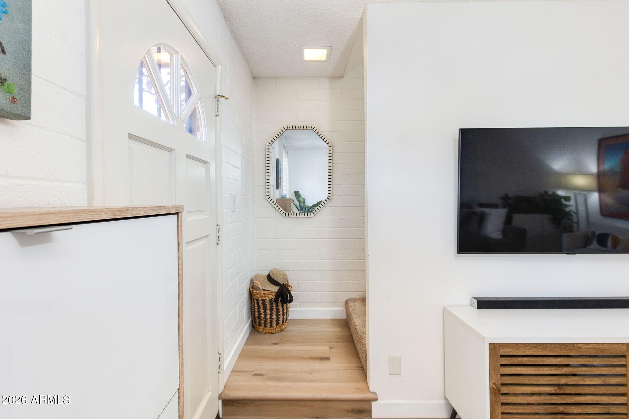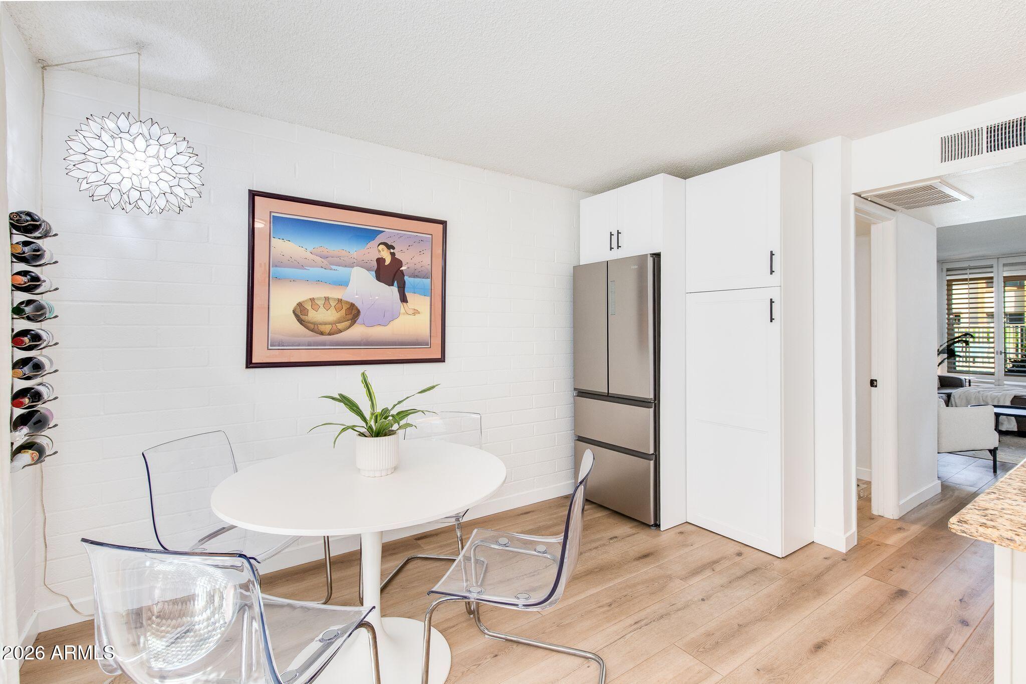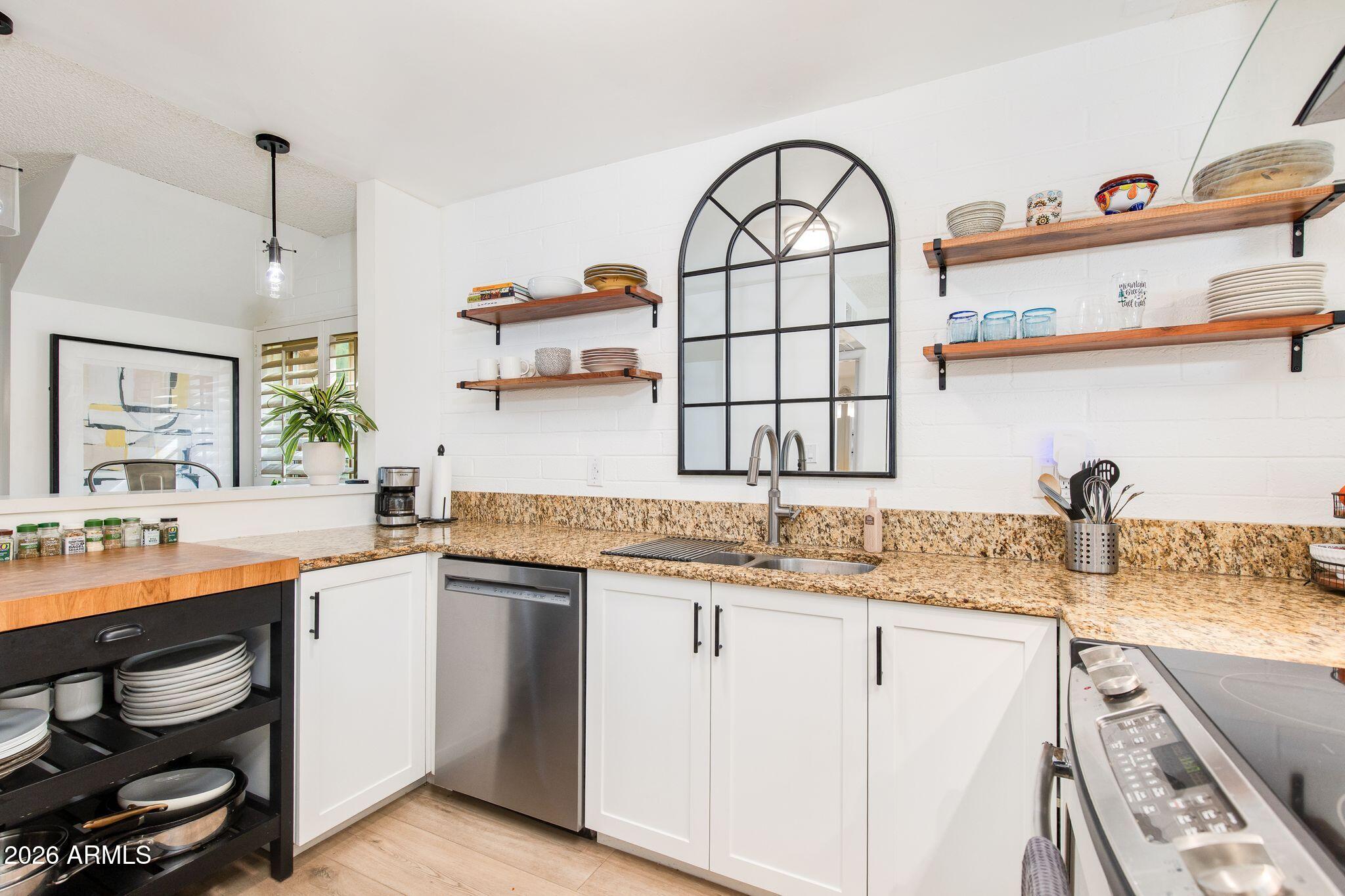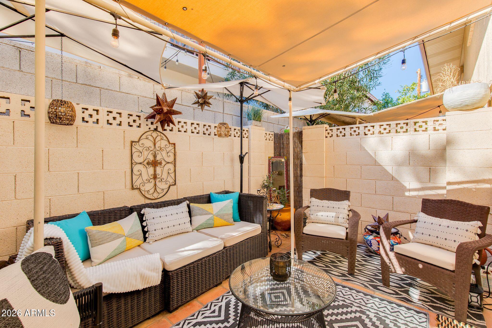 Rare opportunity in the heart of Old Town Scottsdale! Meticulously updated end unit townhome is just off the canal and walking distance to Fashion Square, Historic Old Town, Arts District and Entertainment District - offering a diverse world class dining scene all within walking distance from your new home. This beautiful two bedroom property features a thoughtfully redesigned kitchen with stainless steel appliances, granite countertops, custom open shelving, built in refrigerator and two breakfast bars. The bright open-concept layout is designed for entertaining, seamlessly connecting the kitchen, dining, and living areas. Upstairs, a remodeled full bathroom separates the two bedrooms, offering ideal privacy and functionality. Enjoy a stunning private patio perfect for relaxing or entertaining, and a prime location within the community that is just steps from the pool. Other features include: Dedicated covered parking, guest parking, Community Bike Room, Private Storage Unit, meticulous community laundry room shared by a few units. In-unit laundry and can be added if desired.