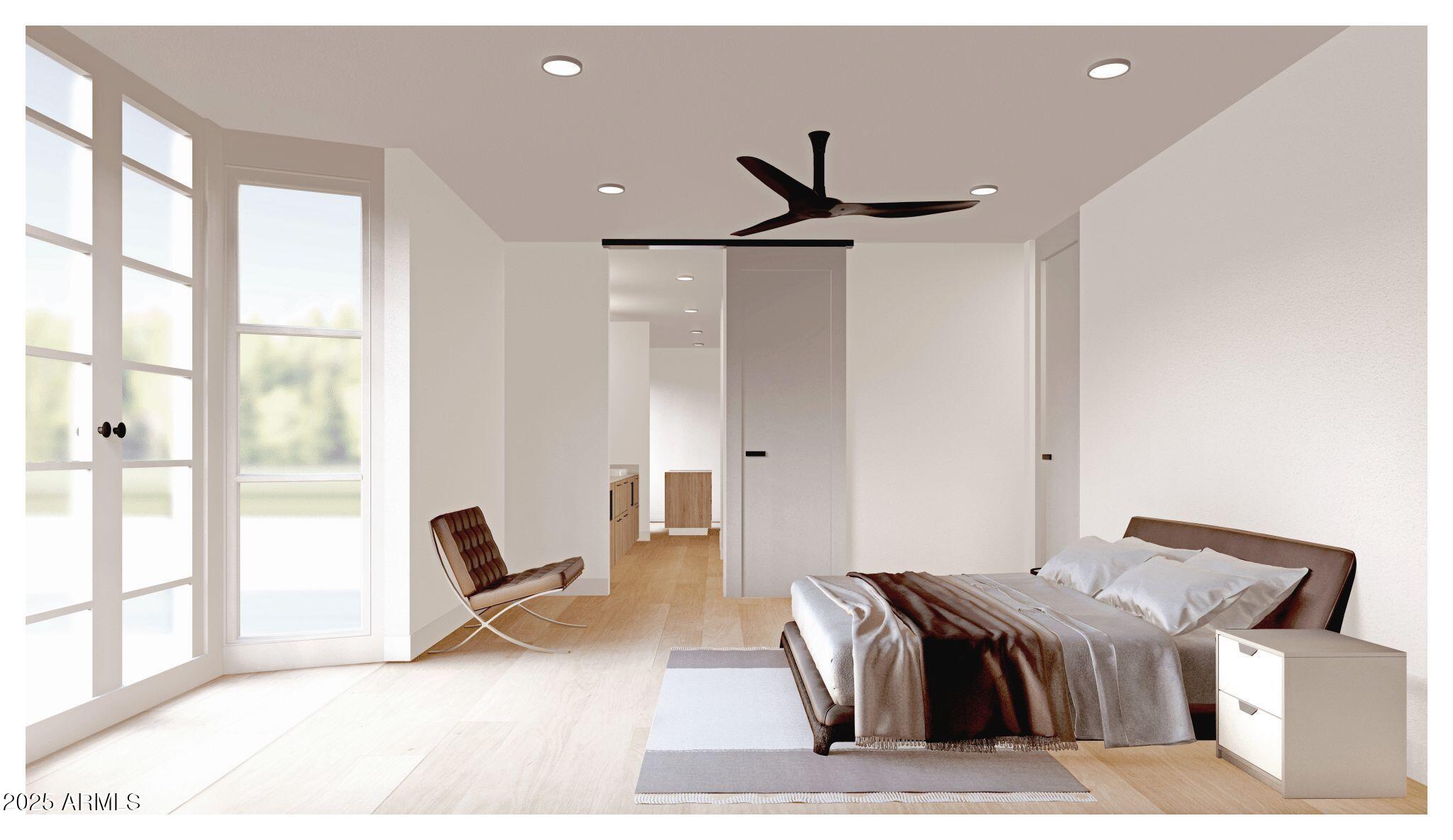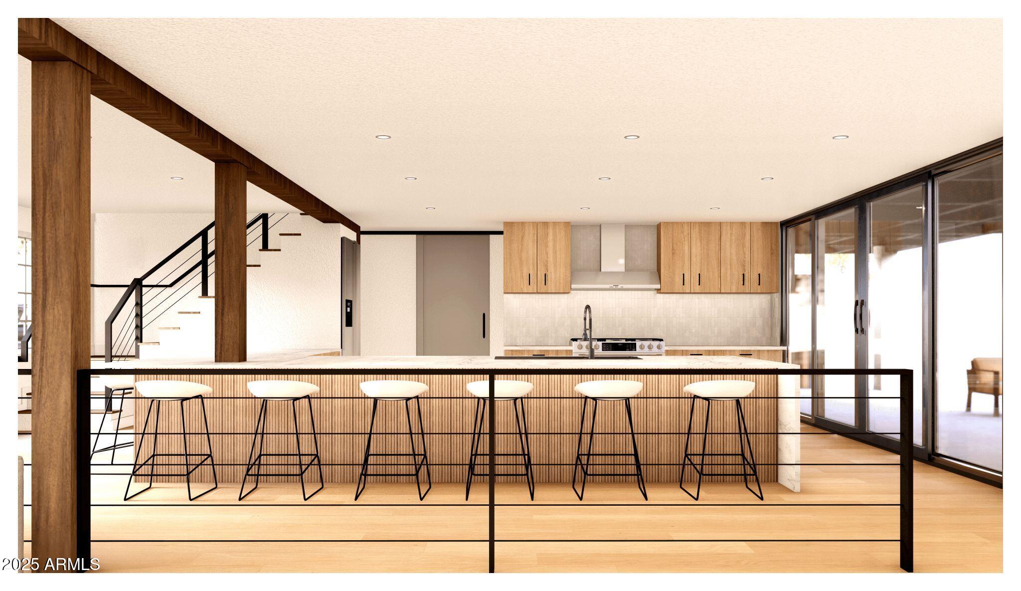 The kitchen anchors the open living space with an oversized quartz island, dual-faucet 48-inch sink, and custom white oak cabinetry. Gallery-height doors and expansive windows flood the interiors with natural light, creating a seamless rhythm between living, dining, and entertaining zones.