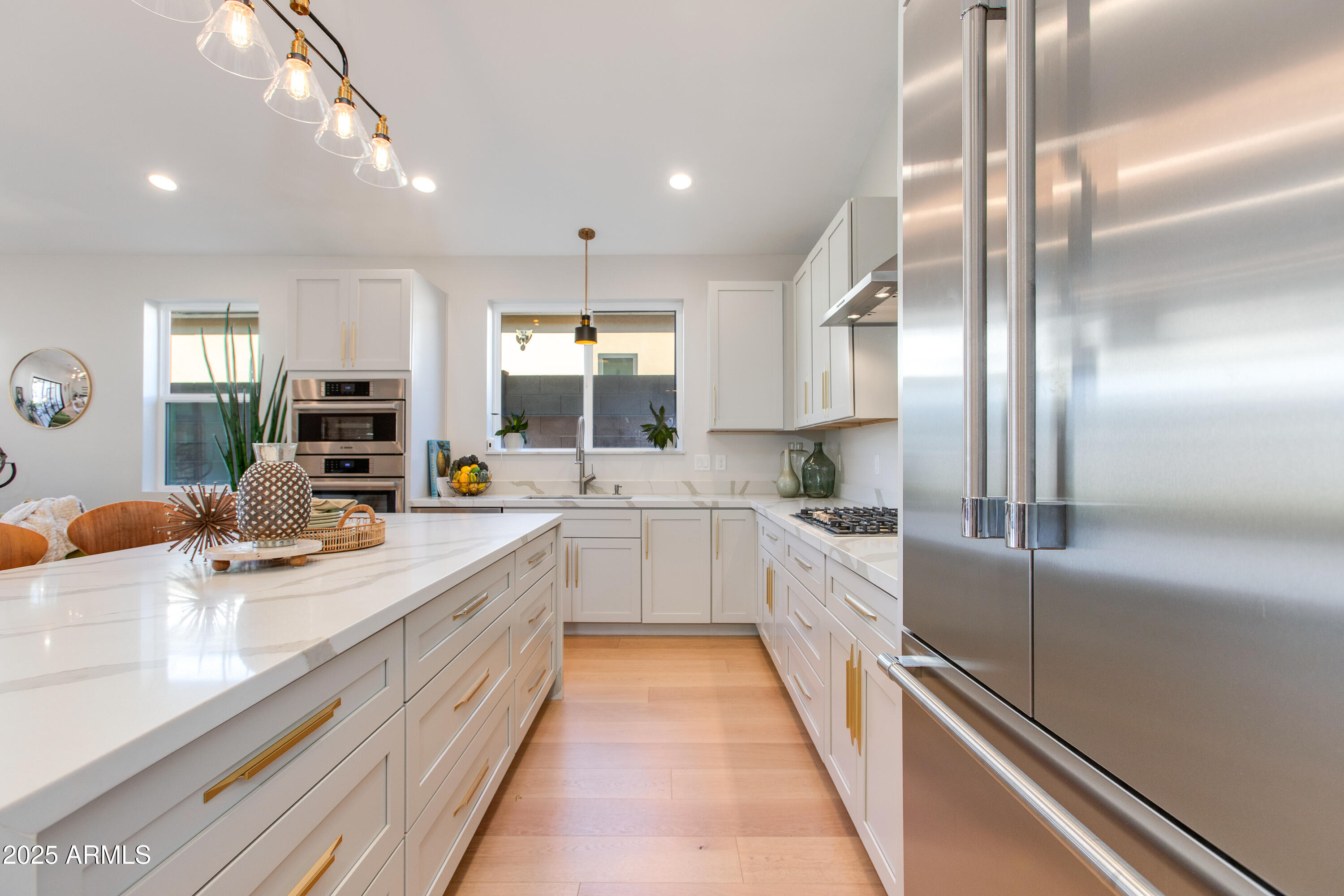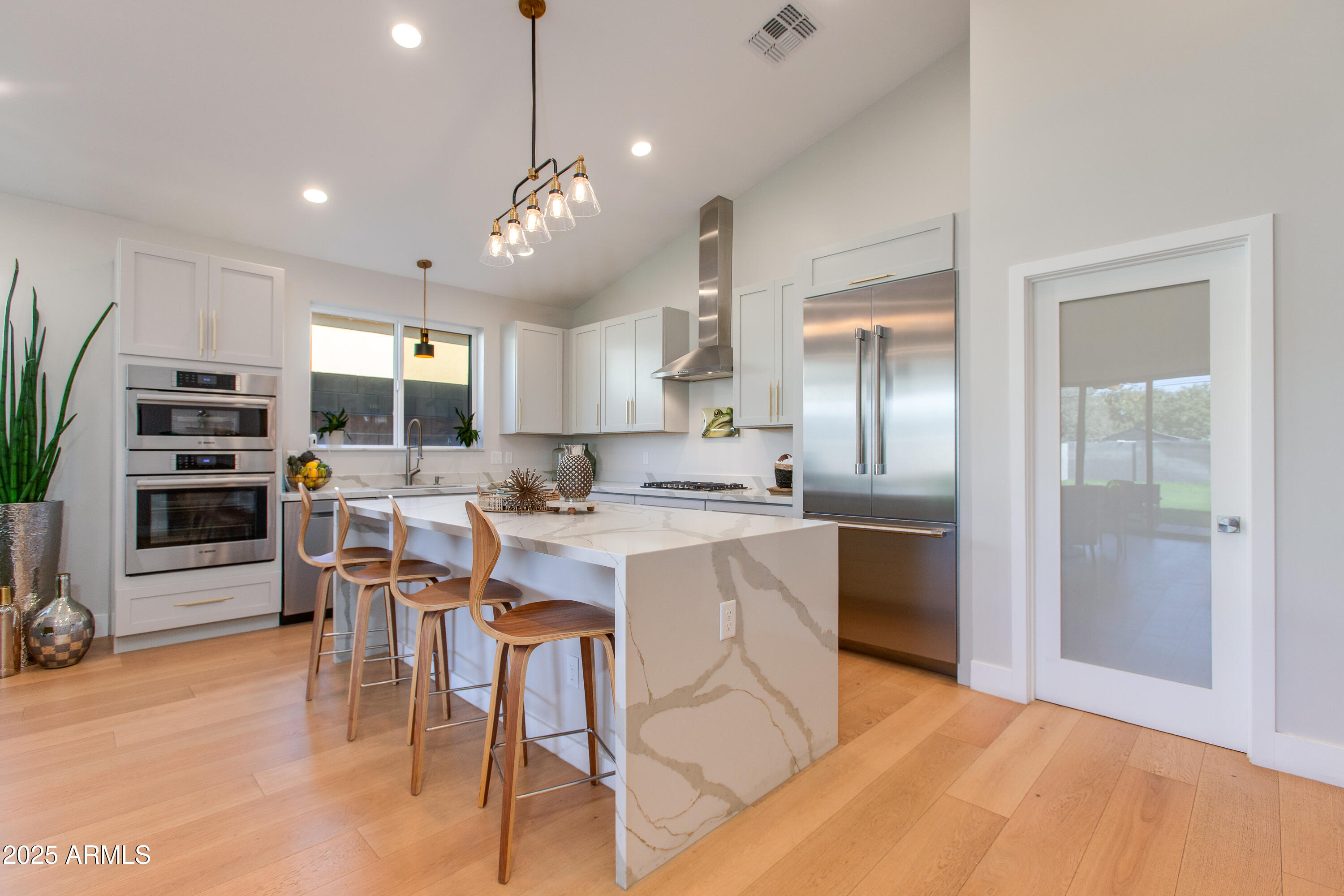 Step inside to find vaulted ceilings, beautiful European Oak hardwood floors, and light-filled open living spaces. The chef's kitchen features quartz countertops, a waterfall island, built-in Bosch and Thermador appliances, a steam convection oven, and a spacious walk-in pantry.