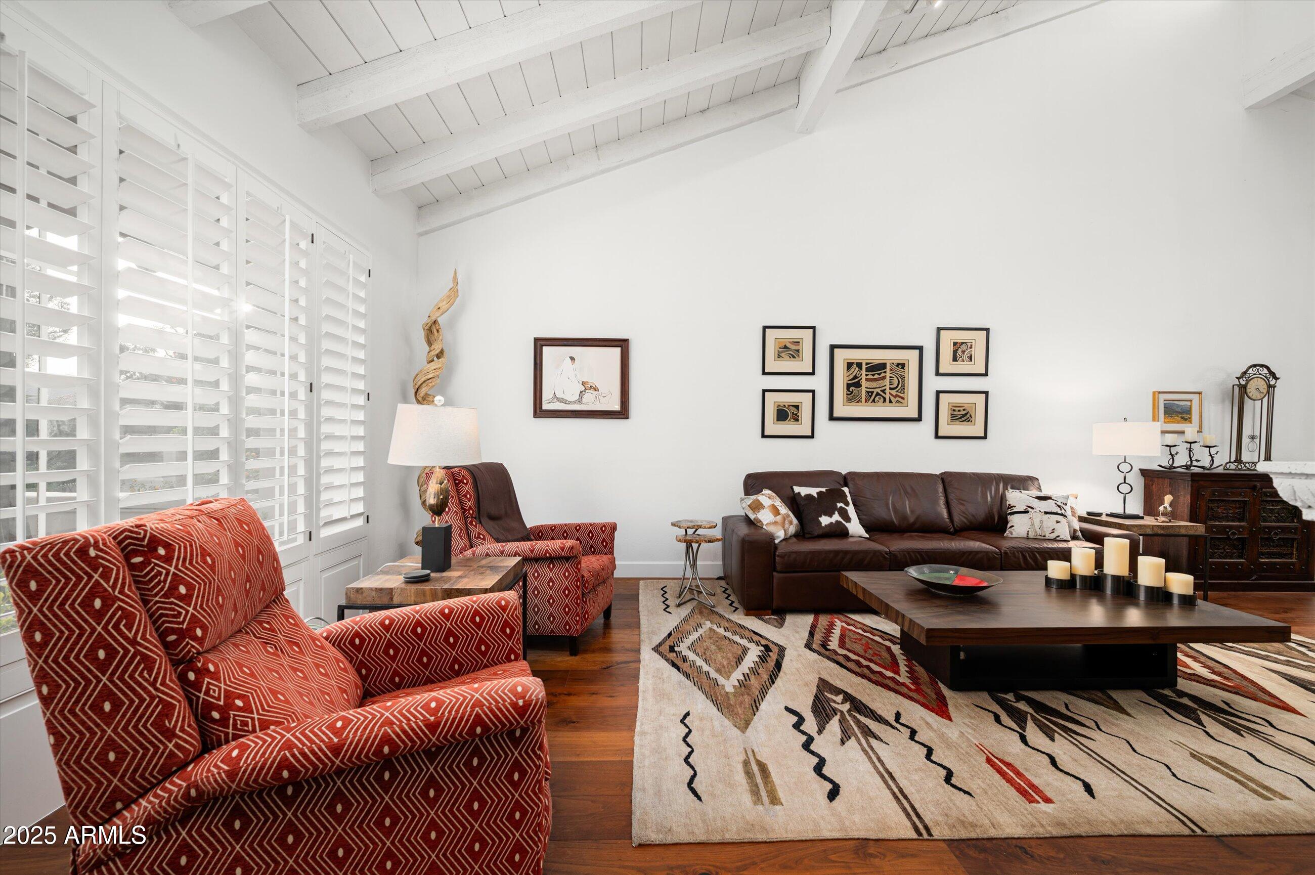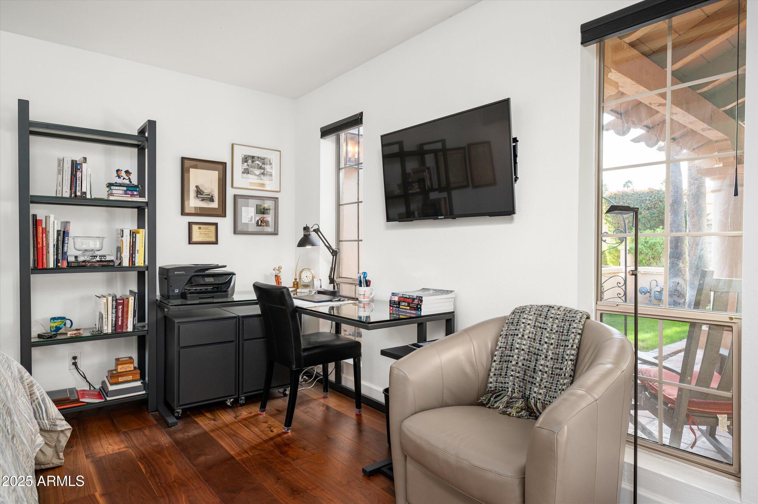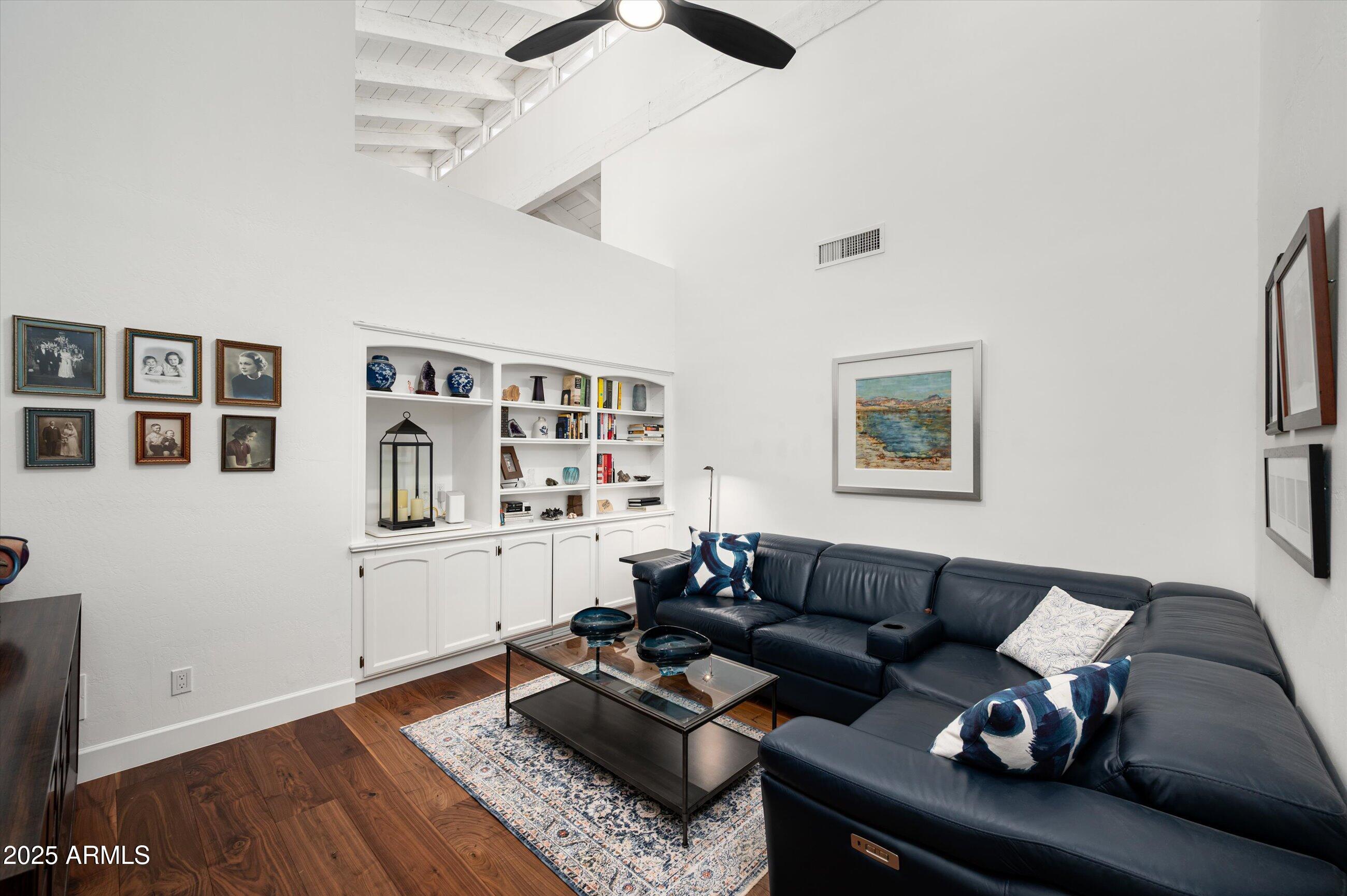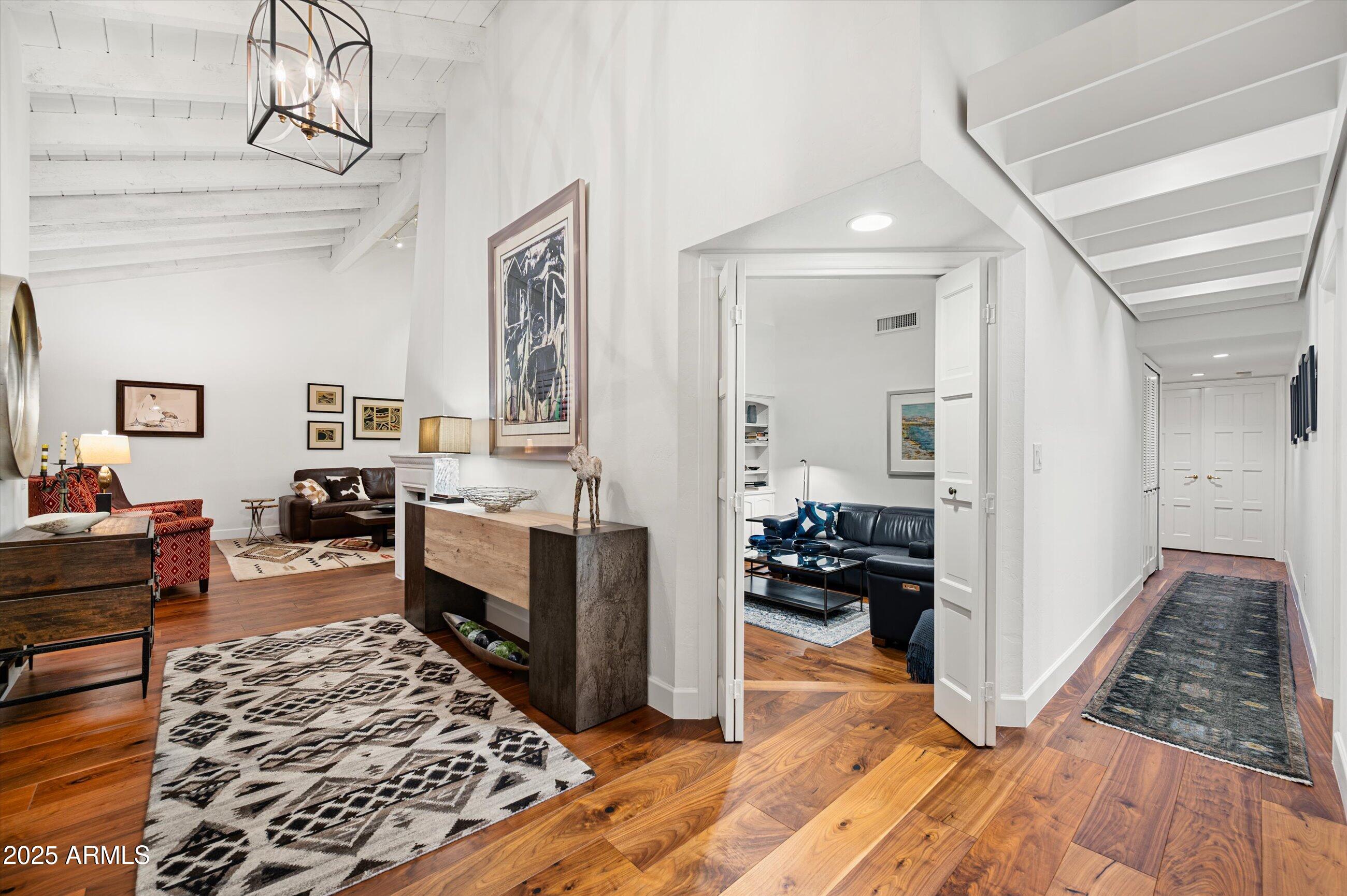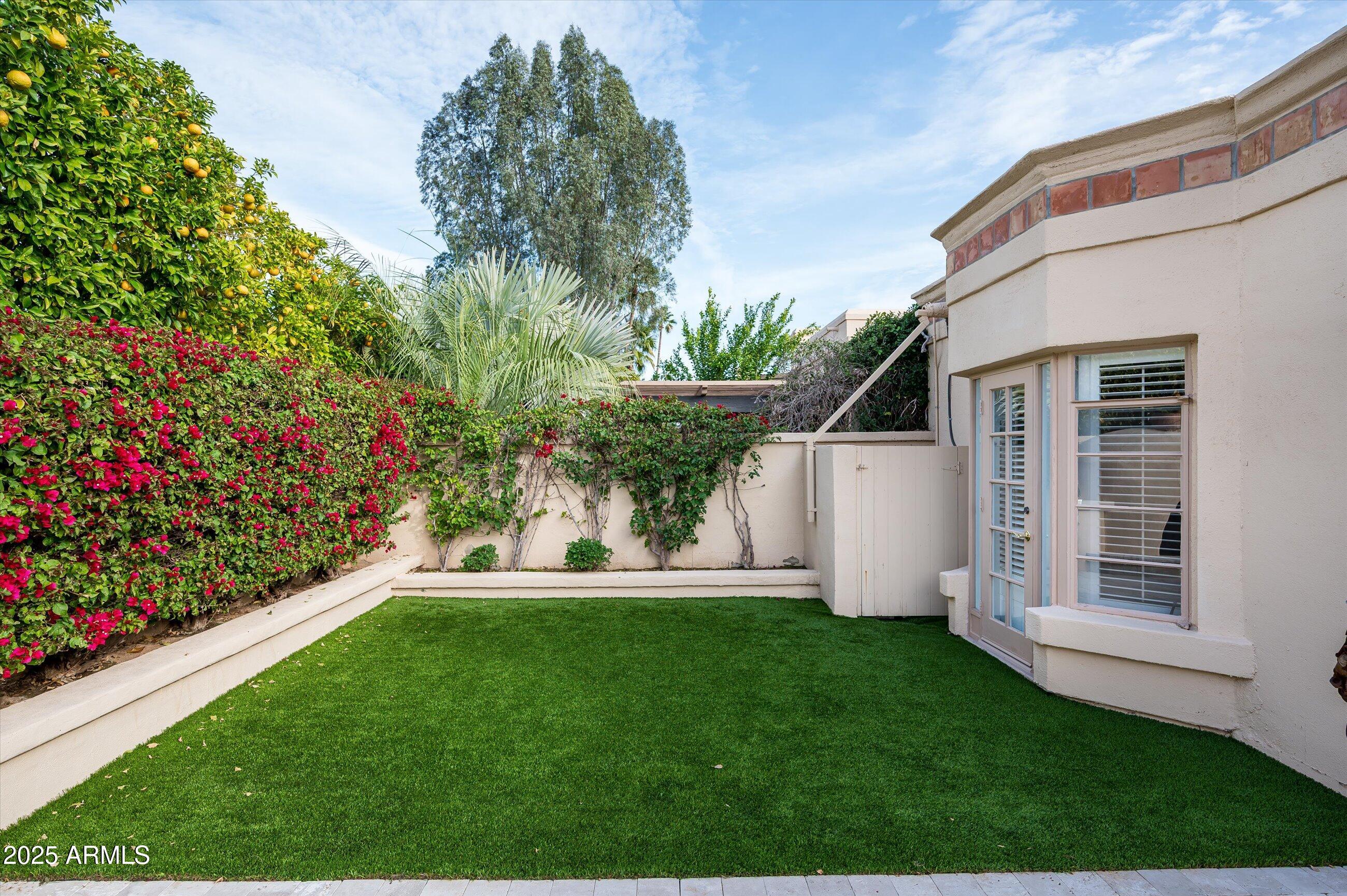 REMODELED- SINGLE-LEVEL Spanish villa by renowned builder Geoffrey Edmunds. Light-filled on a desirable N/S lot w/solid block construction, wide-plank wood floors, and tongue-&-groove ceilings. Open great room w/vaulted ceilings & custom dry bar. Bright white kitchen w/quartz counters & SS appliances. Private primary suite w/exit doors to turf yard, walk-in shower & walk-in closet. Private laundry, tons of storage & 2-car garage. Smart floor plan w/2 beds, 2 baths + den. Community amenities include 2 tennis courts, clubhouse, fitness center, 2 pools & spa, & off-leash dog park. 24 HRS-MANNED GATED. Prime Central Scottsdale location in McCormick Ranch near 2 world-class golf courses, shopping & dining. Recently updated ROOF & ELECTRICAL PANEL.