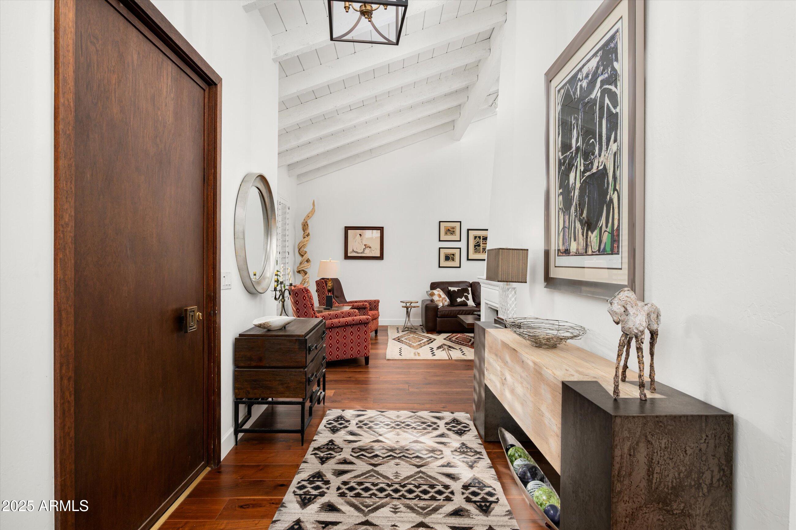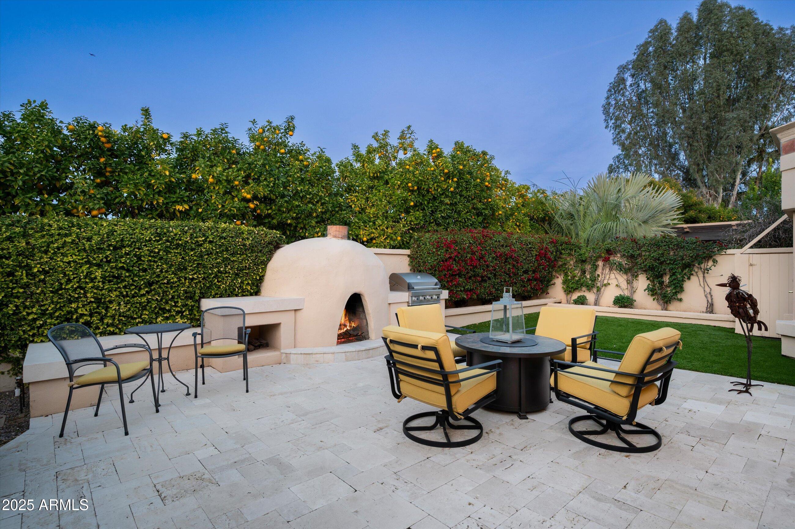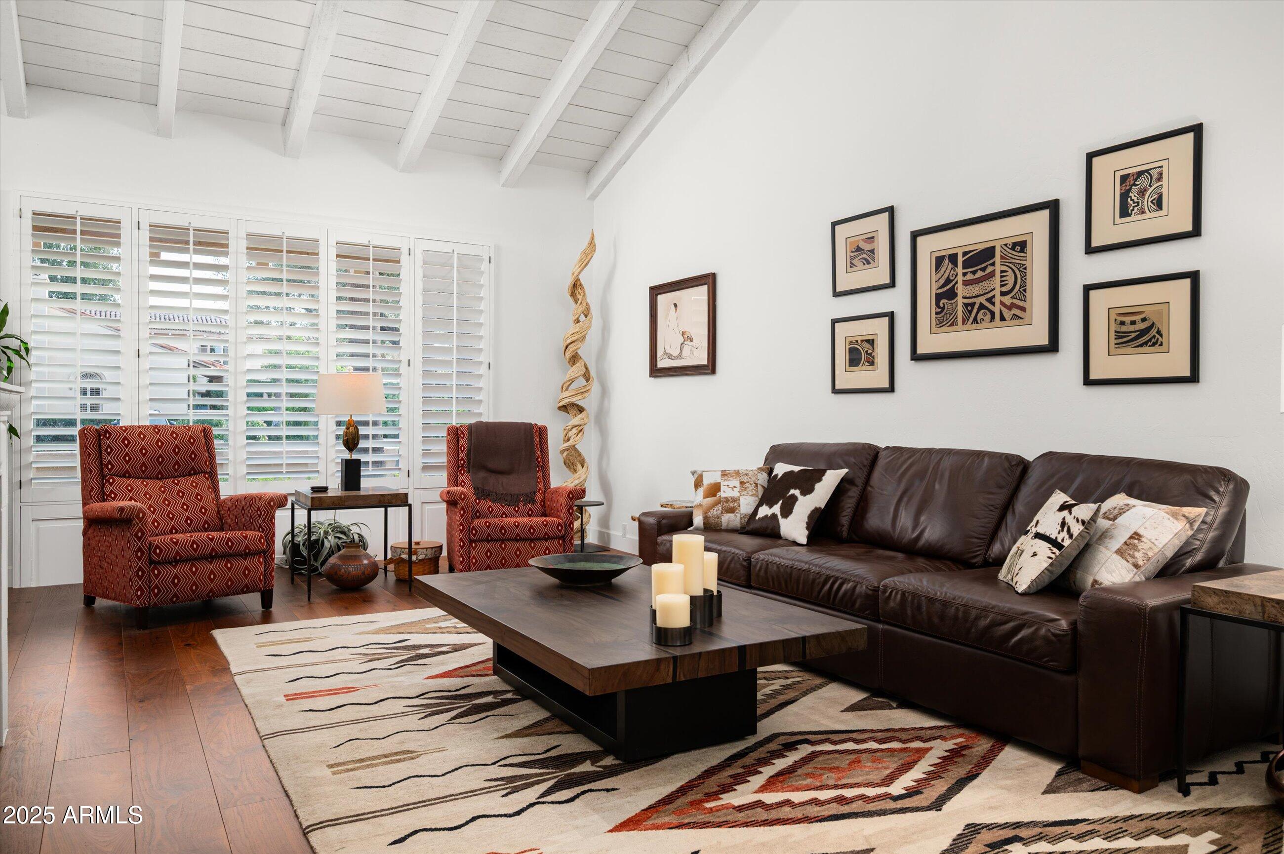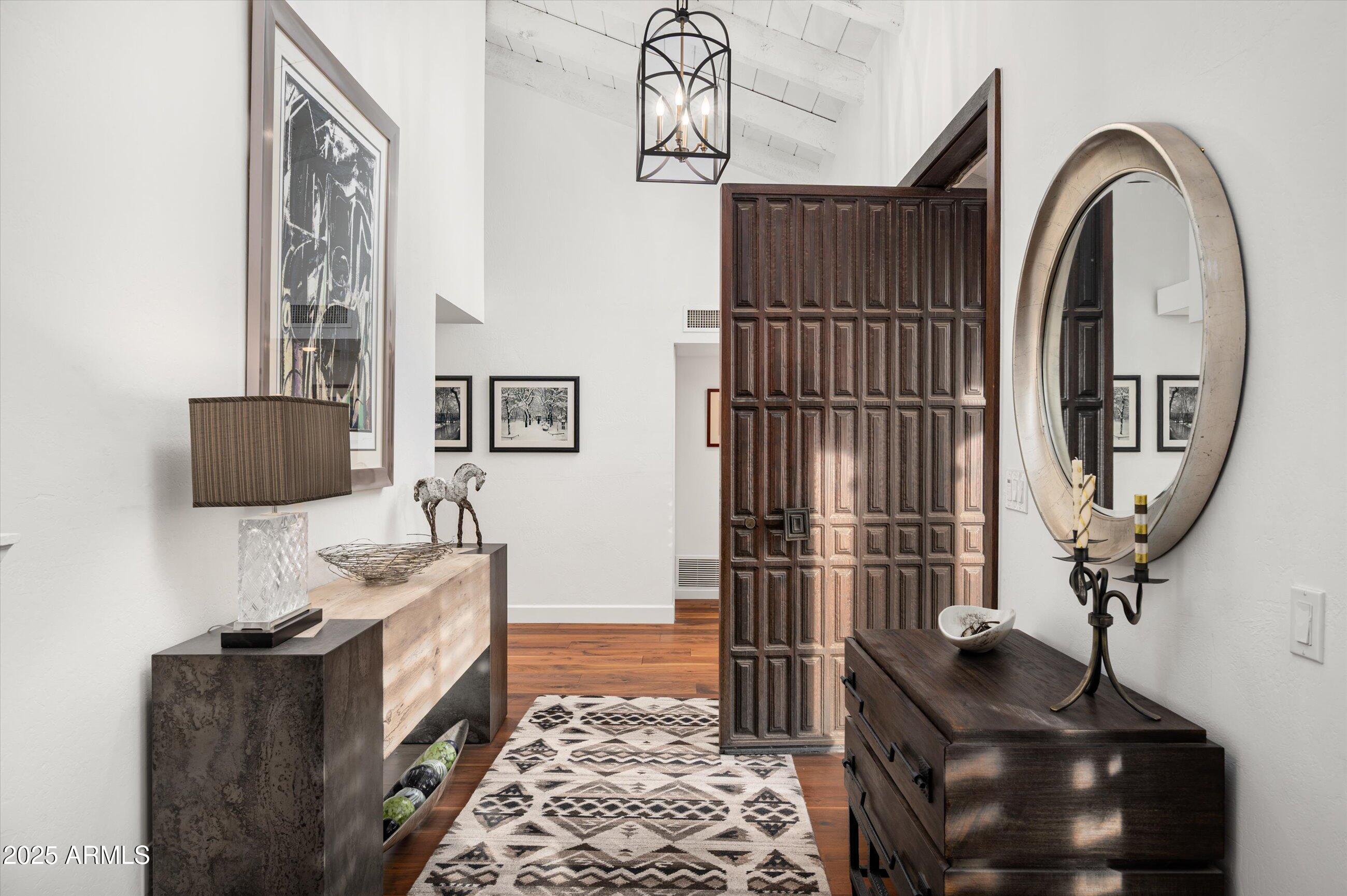 REMODELED- SINGLE-LEVEL Spanish villa by renowned builder Geoffrey Edmunds. Light-filled on a desirable N/S lot w/solid block construction, wide-plank wood floors, and tongue-&-groove ceilings. Open great room w/vaulted ceilings & custom dry bar. Bright white kitchen w/quartz counters & SS appliances. Private primary suite w/exit doors to turf yard, walk-in shower & walk-in closet. Private laundry, tons of storage & 2-car garage. Smart floor plan w/2 beds, 2 baths + den. Community amenities include 2 tennis courts, clubhouse, fitness center, 2 pools & spa, & off-leash dog park. 24 HRS-MANNED GATED. Prime Central Scottsdale location in McCormick Ranch near 2 world-class golf courses, shopping & dining. Recently updated ROOF & ELECTRICAL PANEL.