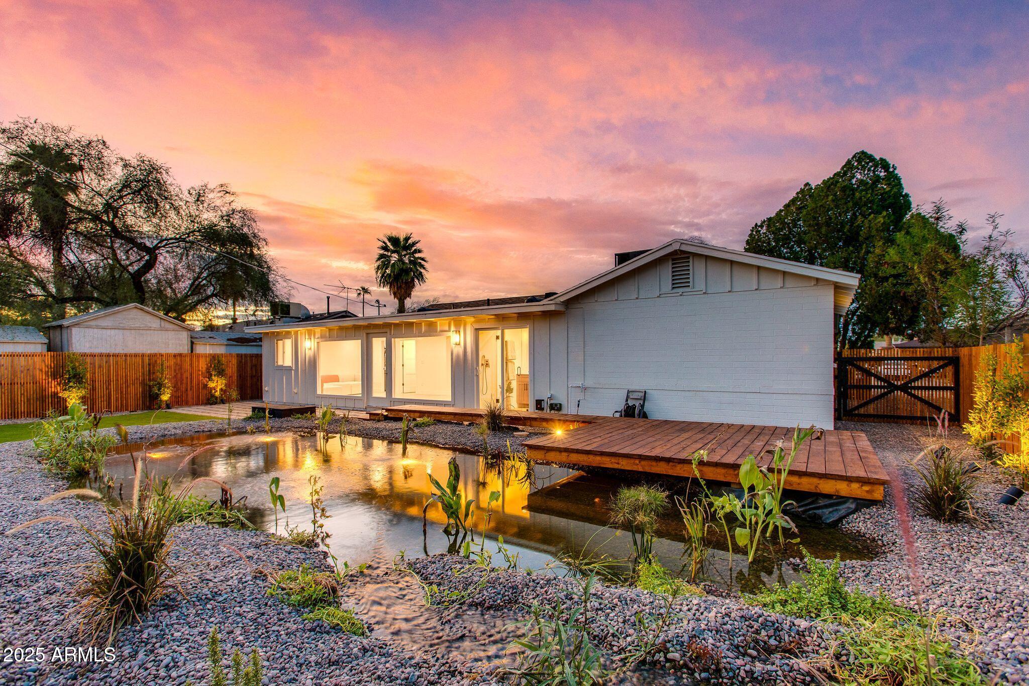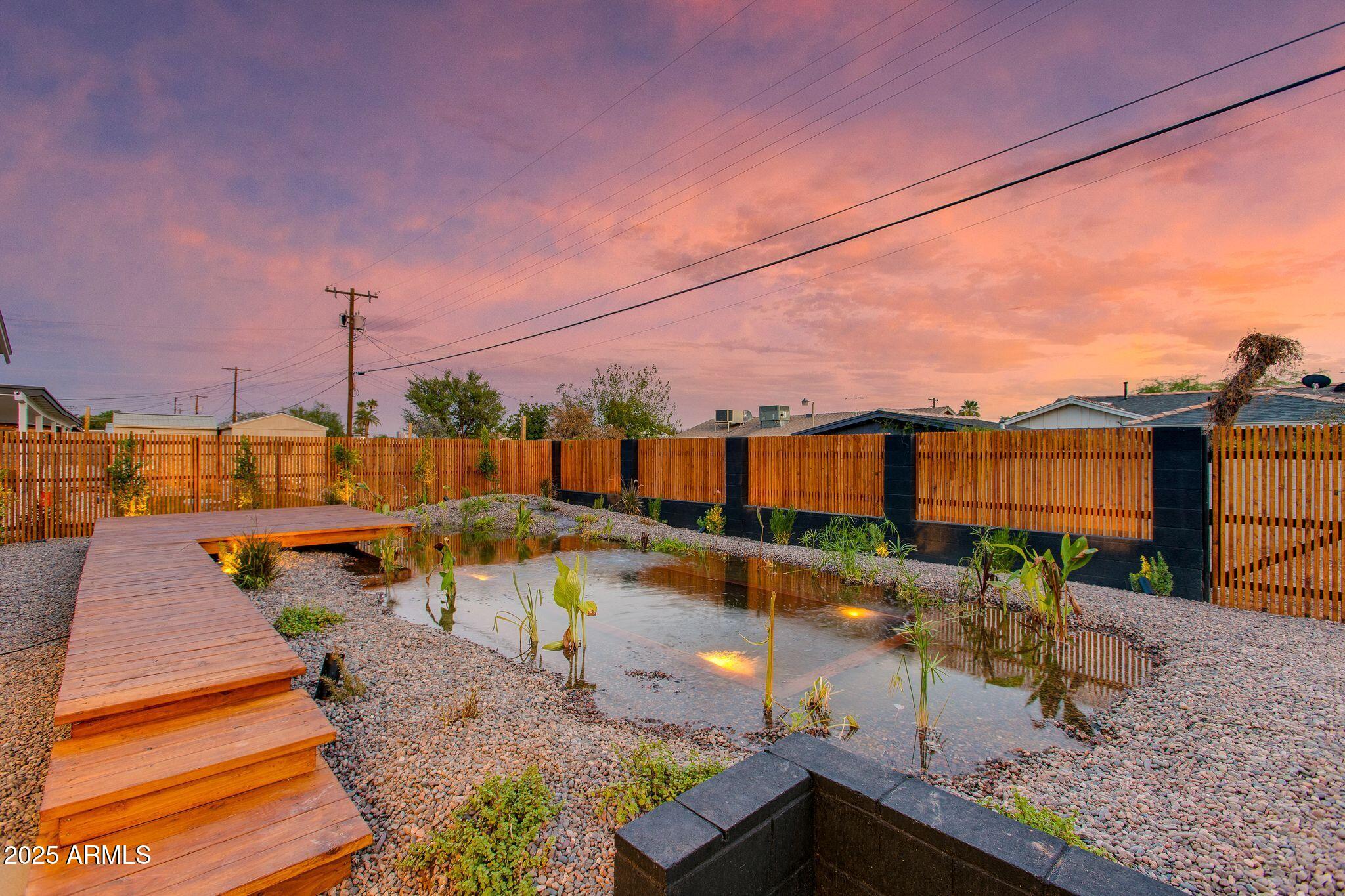 Outside, a rolling creek flows into a naturally filtered swimmable pond, framed by a turf yard with irrigation and lighting, a BBQ zone, and a floating creekside fire-pit deck. Custom vertical-slat fencing provides privacy and refined seclusion.