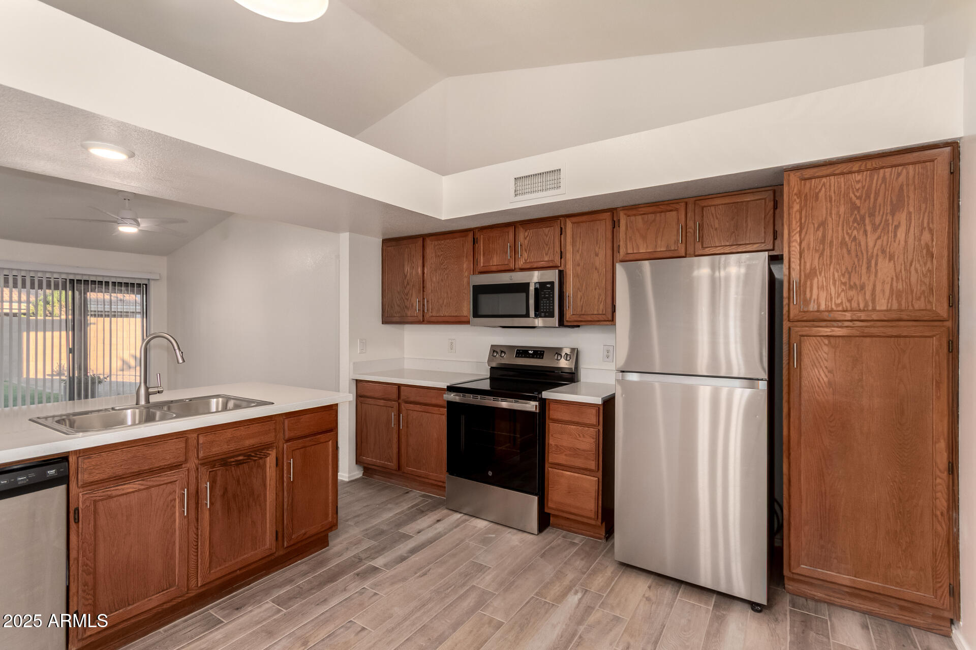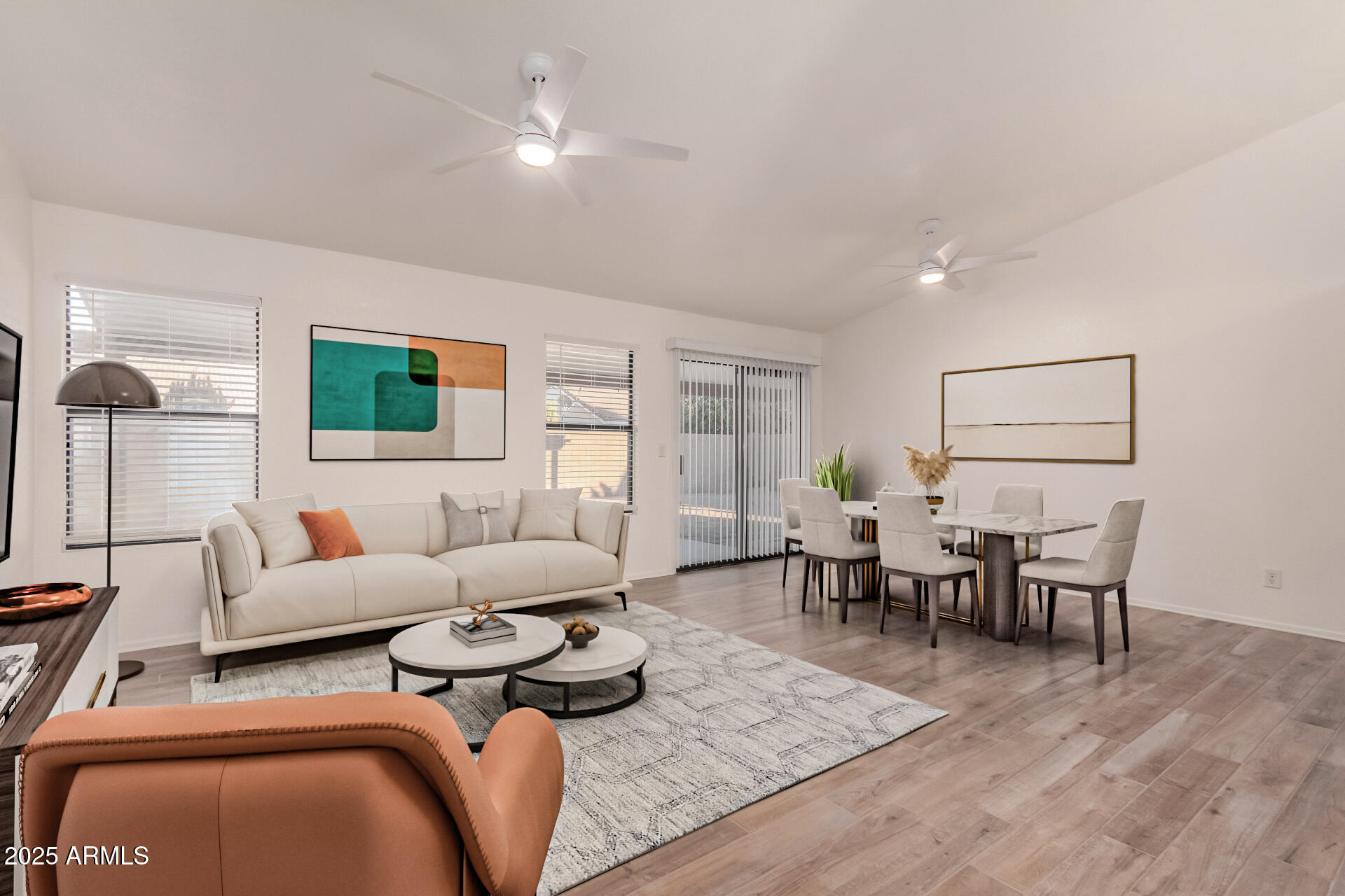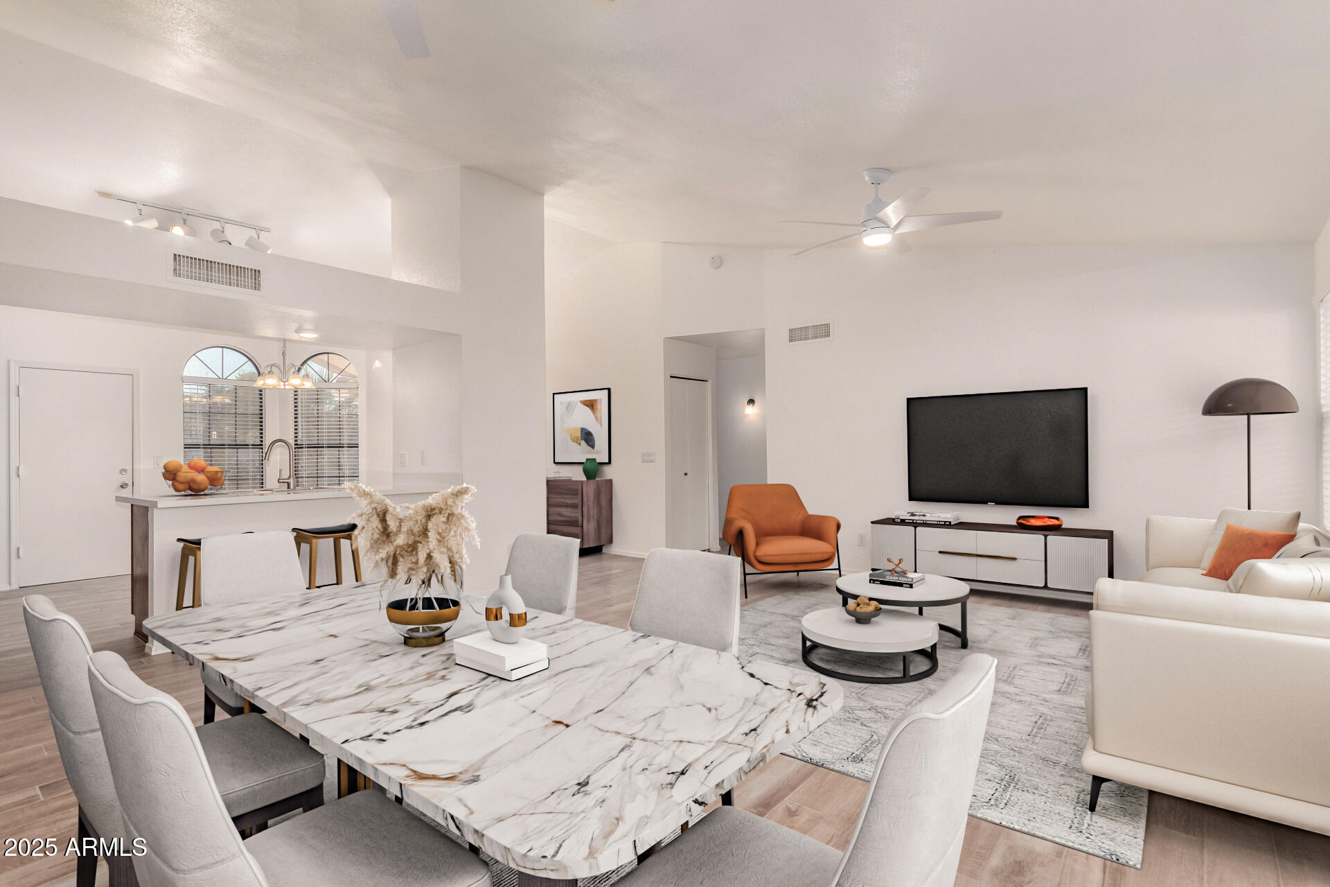 Welcome to Val Vista Park in the Heart of Gilbert! This 3 bed, 2 bath single-level home sits on a corner lot and offers a practical, well designed layout. The high vaulted ceilings mixed with good natural light gives the home an open and comfortable feel. The kitchen features quartz countertops, bar seating and plenty of counter space which is great for cooking or gathering with friends and family. The split floorplan keeps the primary bedroom separate from the guest bedrooms for added privacy. The backyard has a covered patio that open up to natural grass and an ample amount of space. This is a great home for anyone looking for their first or second home, or to downsize or simply looking for a low maintenance, easy to maintain single family home. This home is walking distance to Freestone Park and Gilbert Recreational Center. Also, just minutes from SanTan Village, and the Riparian Preserve - everything you need is in close proximity.