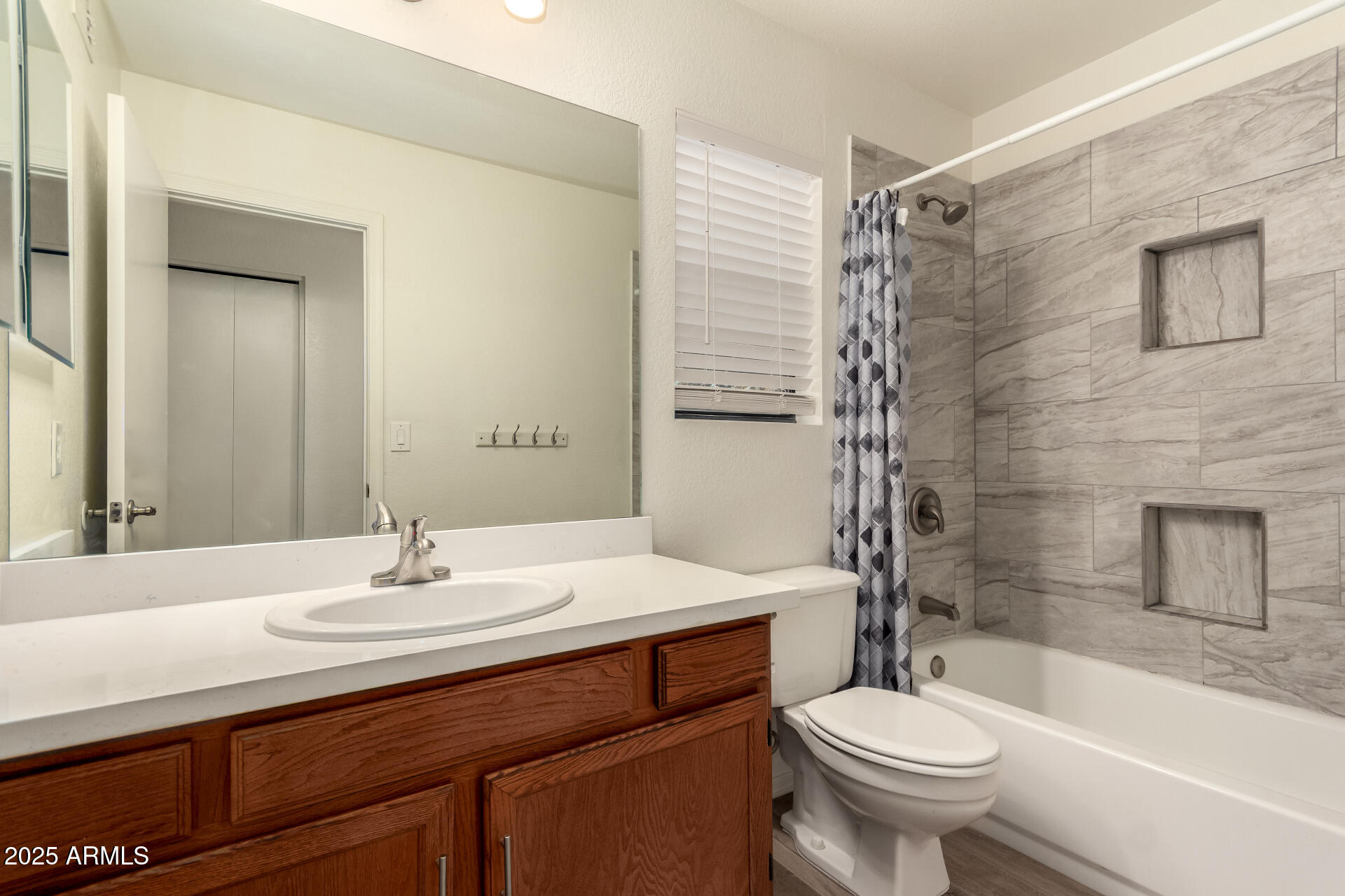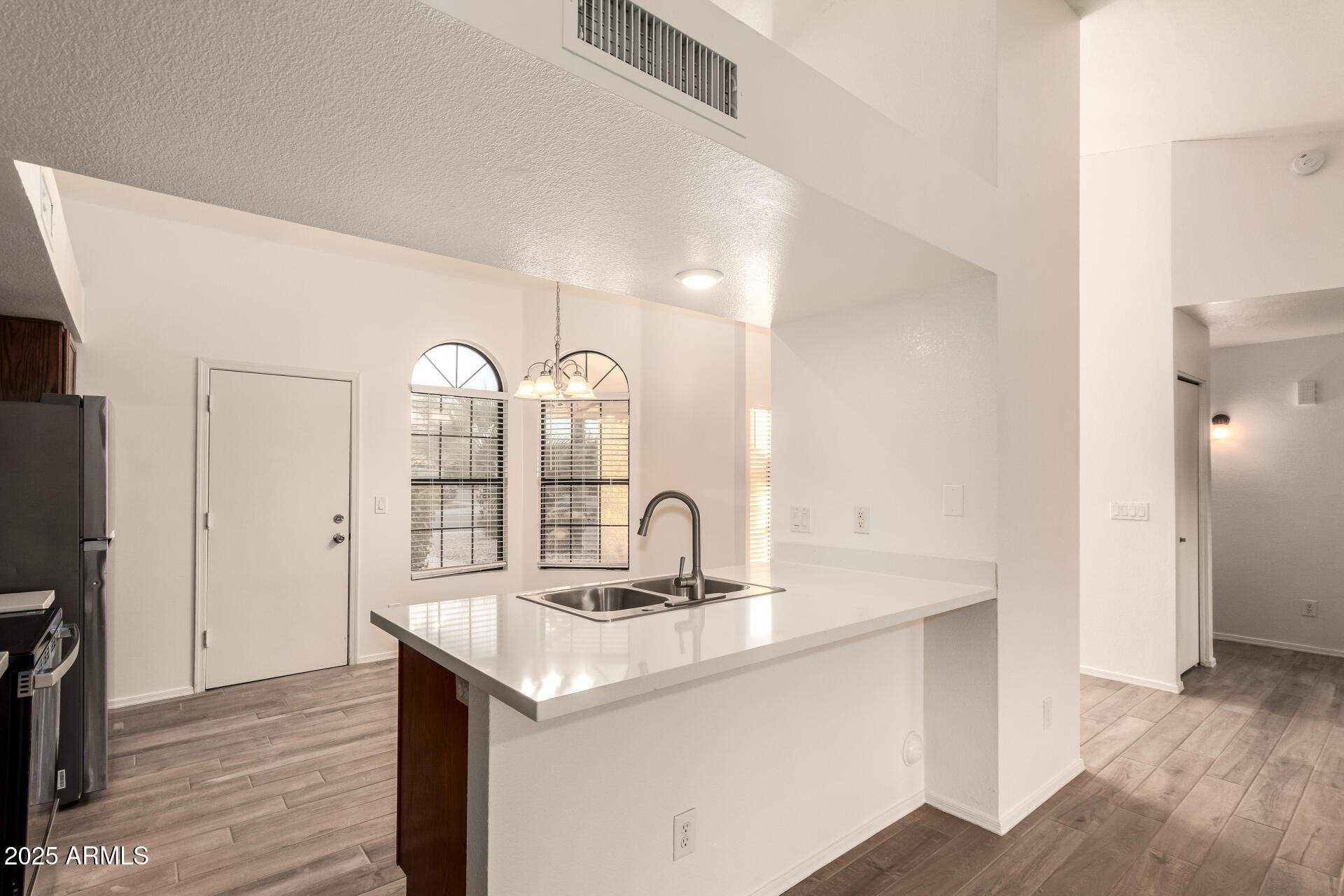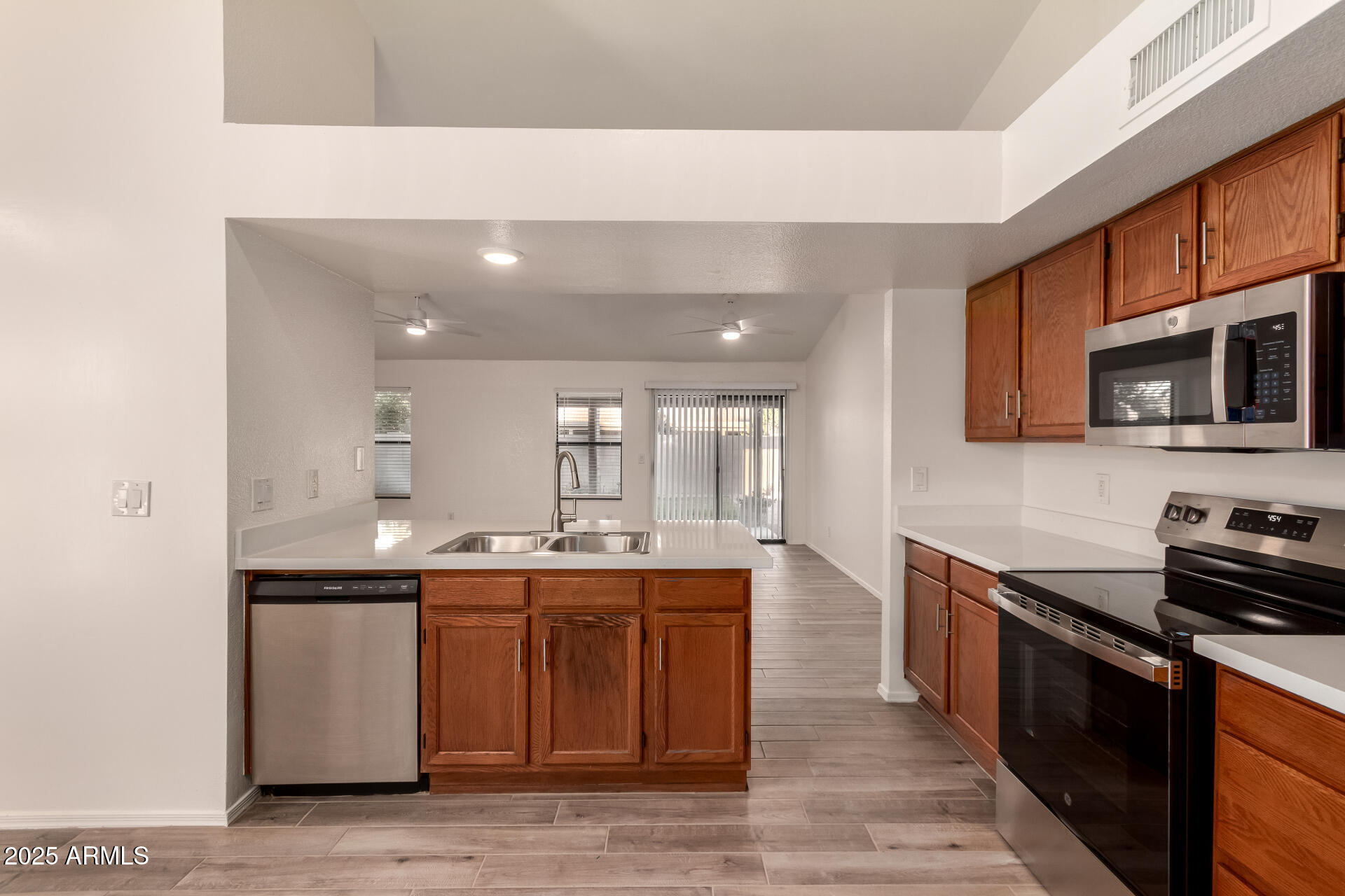 Welcome to Val Vista Park in the Heart of Gilbert! This 3 bed, 2 bath single-level home sits on a corner lot and offers a practical, well designed layout. The high vaulted ceilings mixed with good natural light gives the home an open and comfortable feel. The kitchen features quartz countertops, bar seating and plenty of counter space which is great for cooking or gathering with friends and family. The split floorplan keeps the primary bedroom separate from the guest bedrooms for added privacy. The backyard has a covered patio that open up to natural grass and an ample amount of space. This is a great home for anyone looking for their first or second home, or to downsize or simply looking for a low maintenance, easy to maintain single family home. This home is walking distance to Freestone Park and Gilbert Recreational Center. Also, just minutes from SanTan Village, and the Riparian Preserve - everything you need is in close proximity.